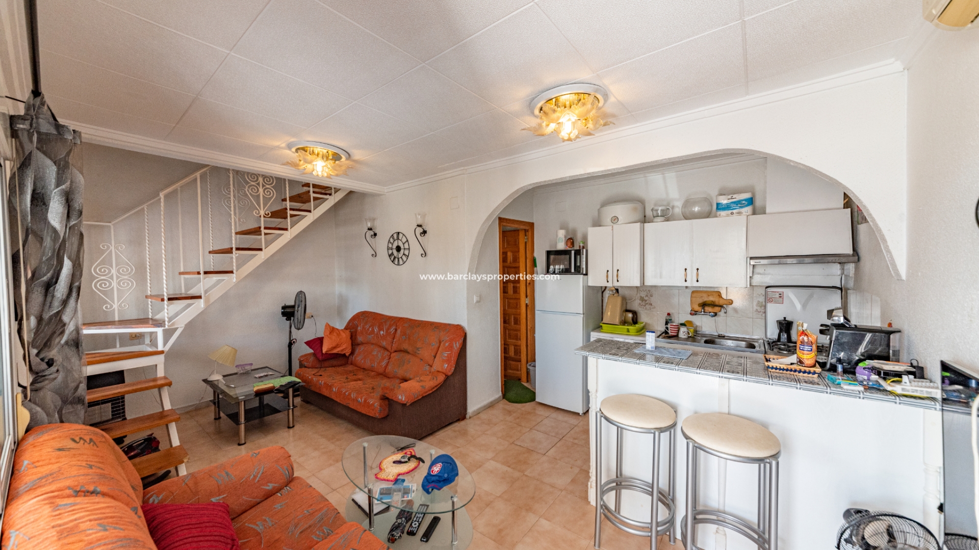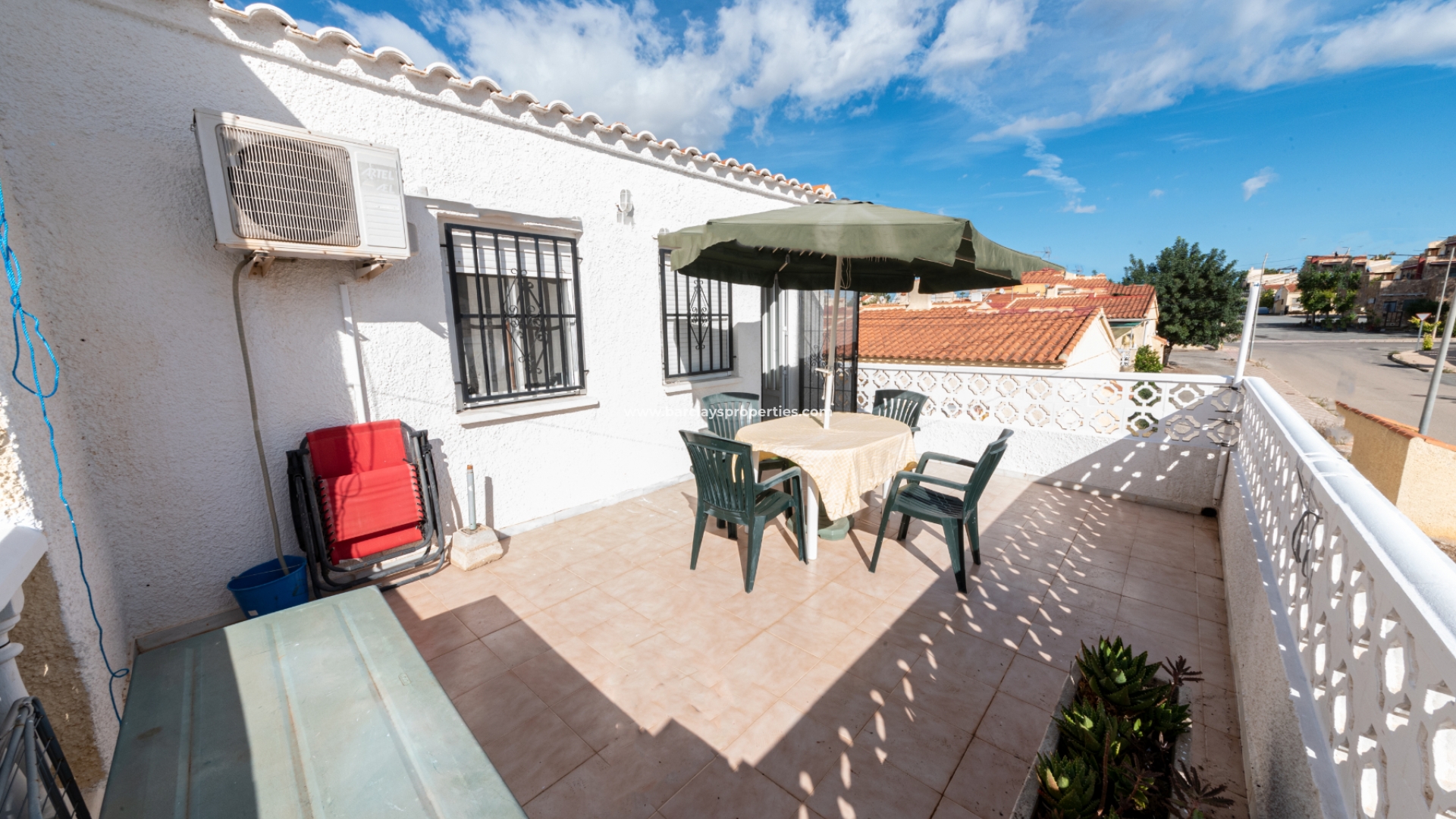 Eine geräumige, überdachte Sonnenterrasse empfängt uns bei der Ankunft in diesem malerischen Eckhaus. Beim Betreten finden wir ein Wohn-/Esszimmer mit einer offenen Küche. Es gibt eine Klimaanlage, die an heißen Sommertagen für angenehme Kühle sorgt. Auf der gleichen Etage befindet sich ein voll ausgestattetes Badezimmer und eine kleine Treppe, die uns in den zweiten Stock führt, wo wir ein Einzelzimmer und ein Doppelzimmer finden, beide mit eigener Klimaanlage. Das Hauptschlafzimmer hat auch eine eigene Sonnenterrasse mit schönem Blick auf Guardamar und die Landschaft, wo man sich unter der spanischen Sonne entspannen und sonnen kann.