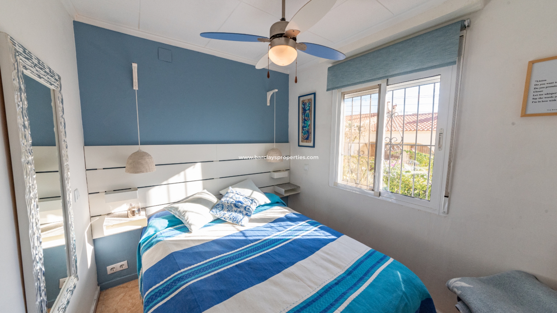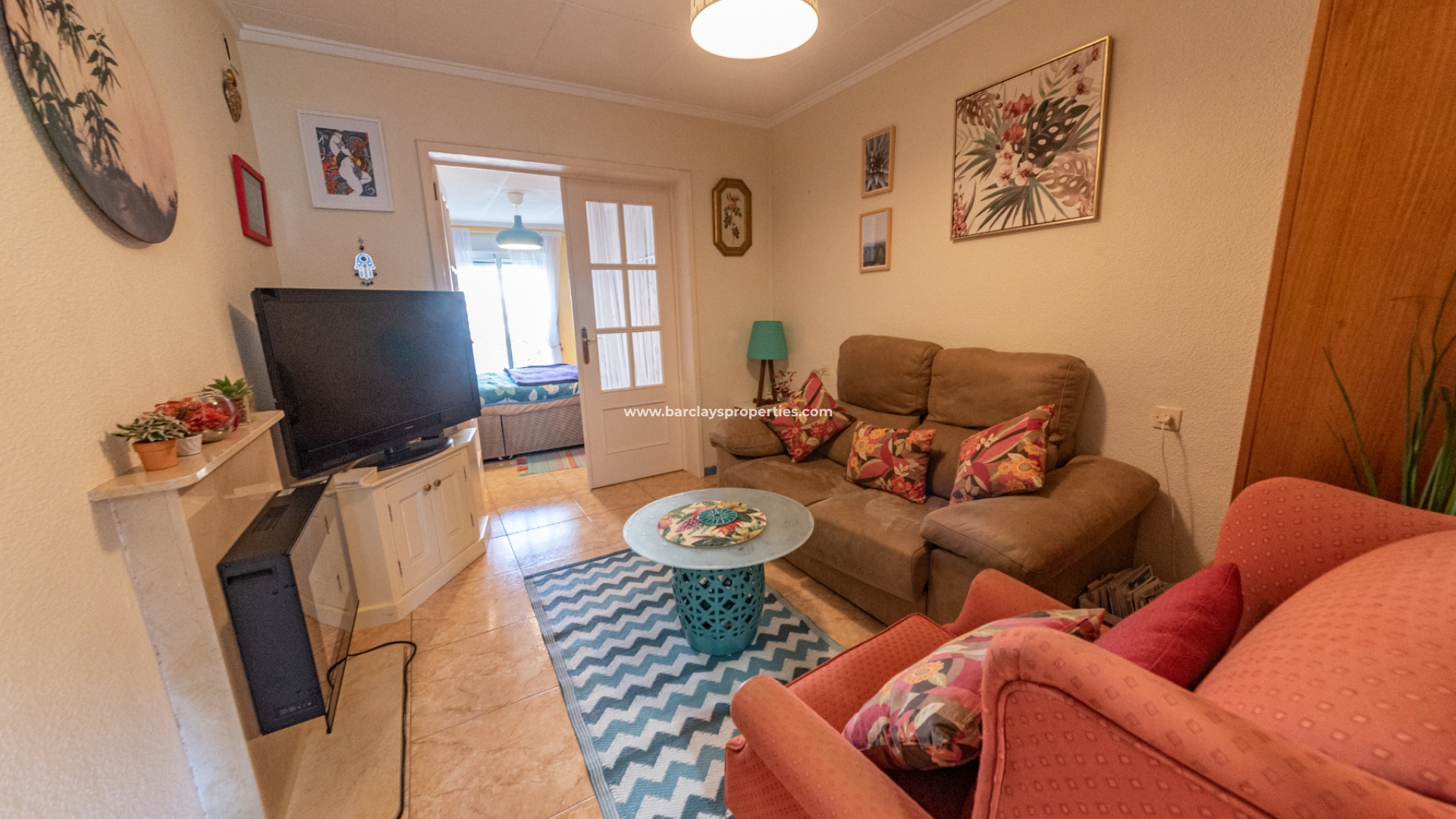 Wir betreten dieses malerische Reihenhaus zu verkaufen in La Marina über die vordere Terrasse. Um die Mauer herum wachsen hübsche Pflanzen, die diesem Bereich zusätzliche Privatsphäre verleihen. Einige Stufen führen uns zu einer erhöhten Terrasse mit einem charmanten Sitzbereich, der dank seiner Sonnenmarkisen zu jeder Tageszeit ein Essen im Freien ermöglicht. Es ist leicht, sich vorzustellen, wie man in diesem hübschen Garten mit einem Morgenkaffee sitzt und dem Zwitschern der Vögel zuhört.