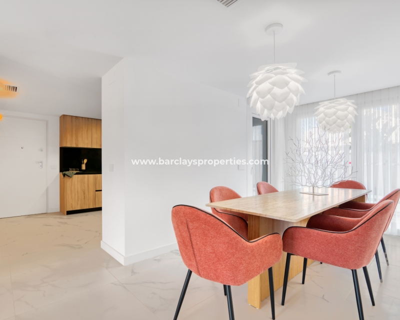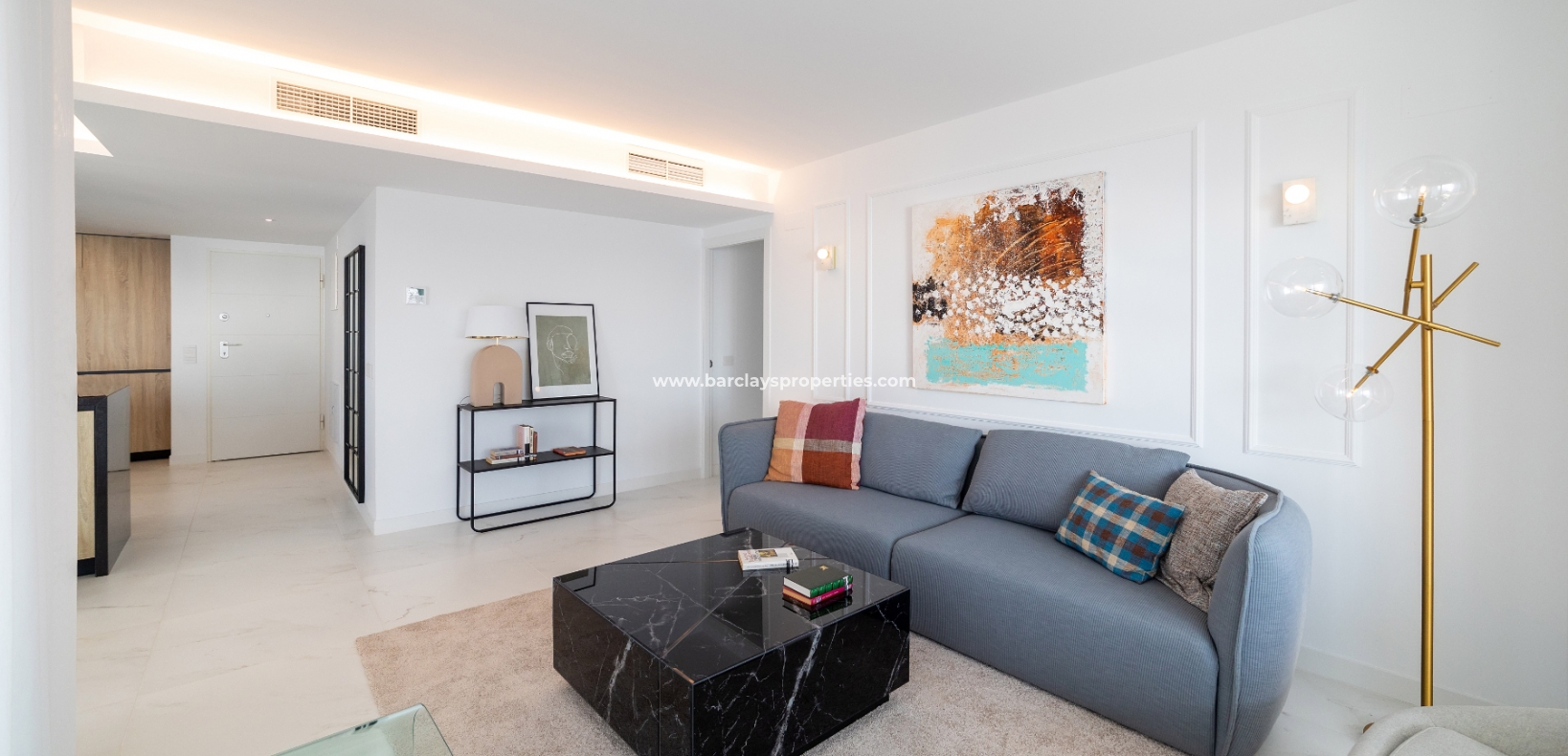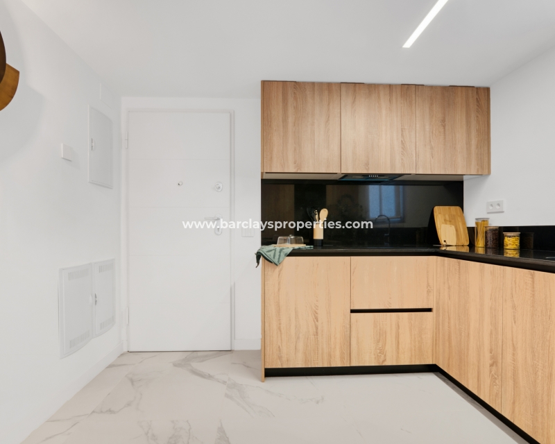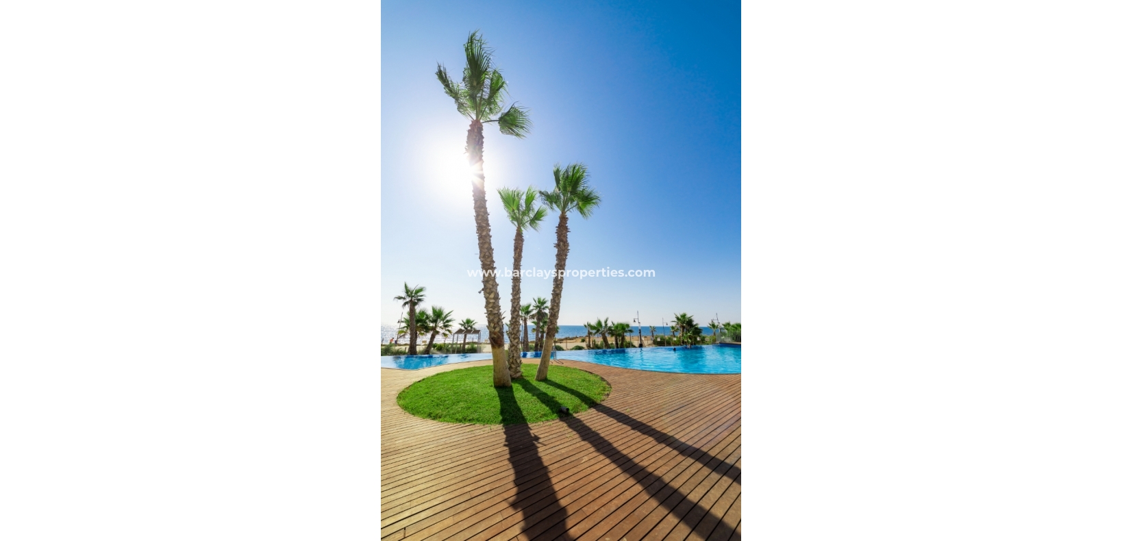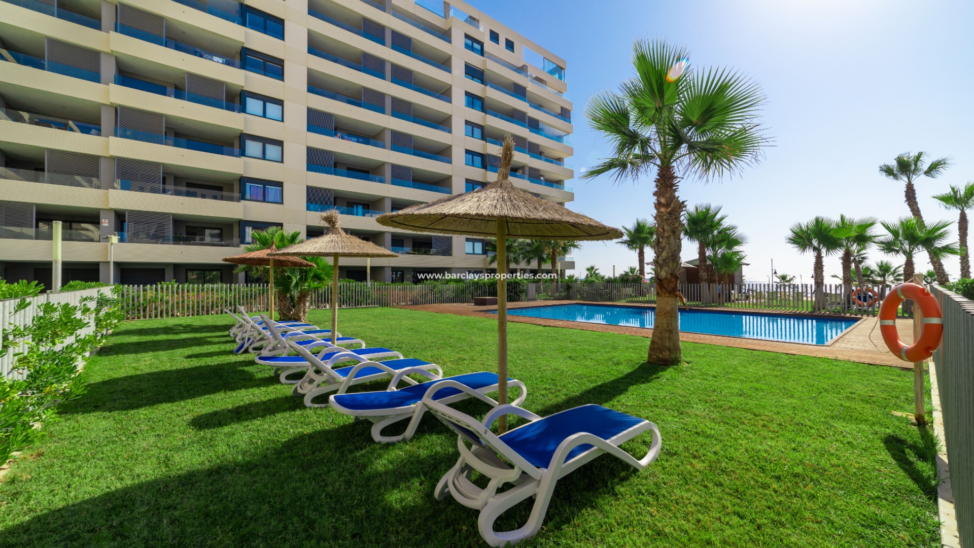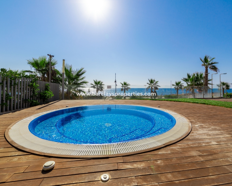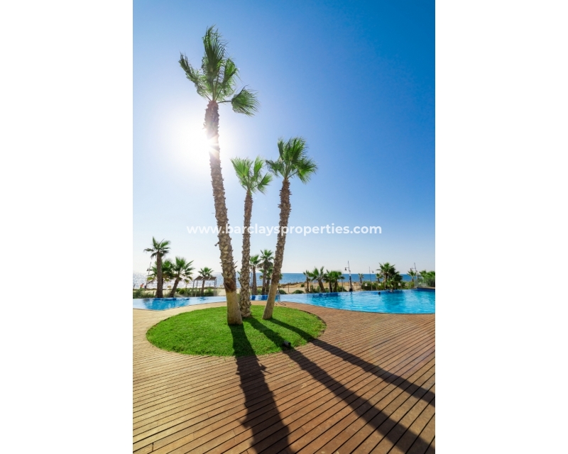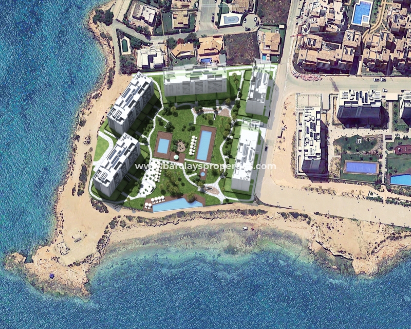 Apartamentos nuevos en primera línea de playa en Punta Prima, cerca de Torrevieja, España. Estos modernos apartamentos ofrecen impresionantes vistas al mar y se encuentran dentro de un complejo en primera línea de playa. Cada apartamento cuenta con 2 dormitorios y 2 baños, y algunas unidades cuentan con un solárium.