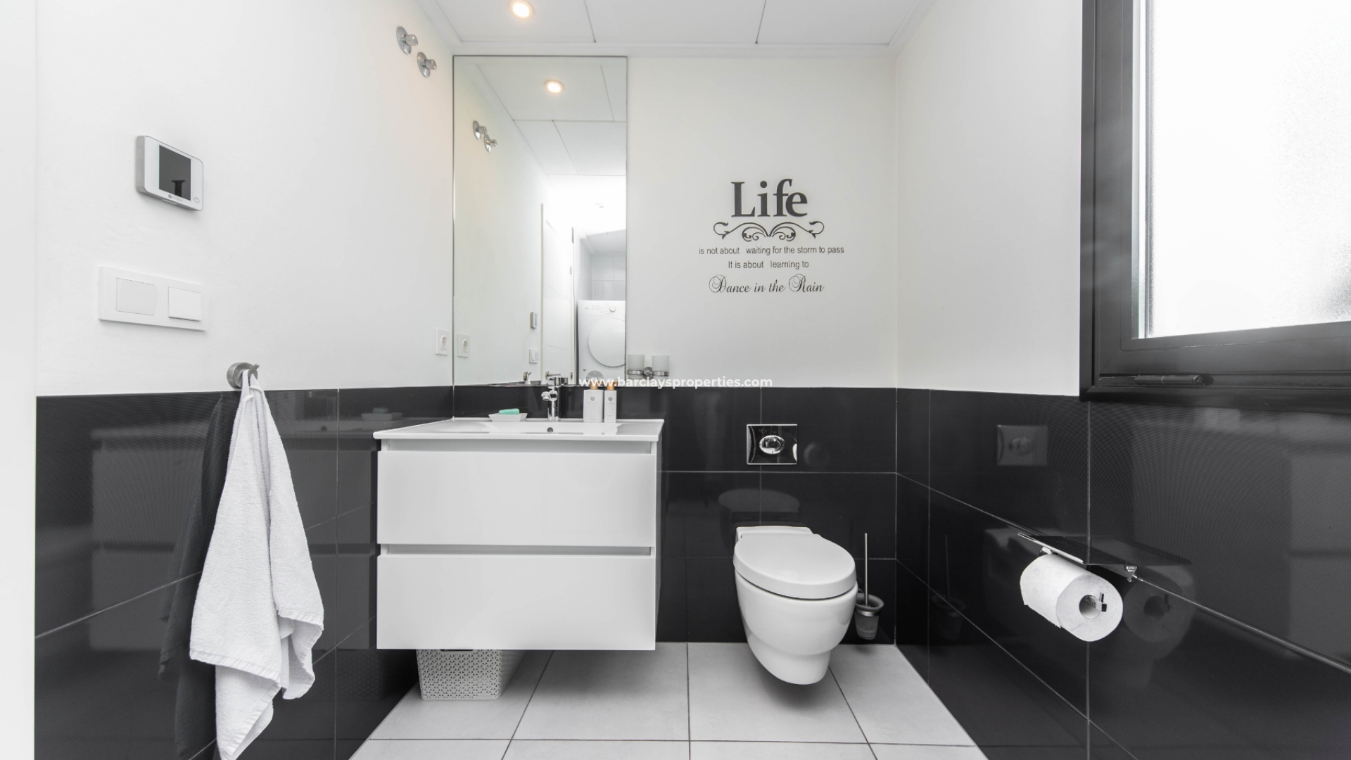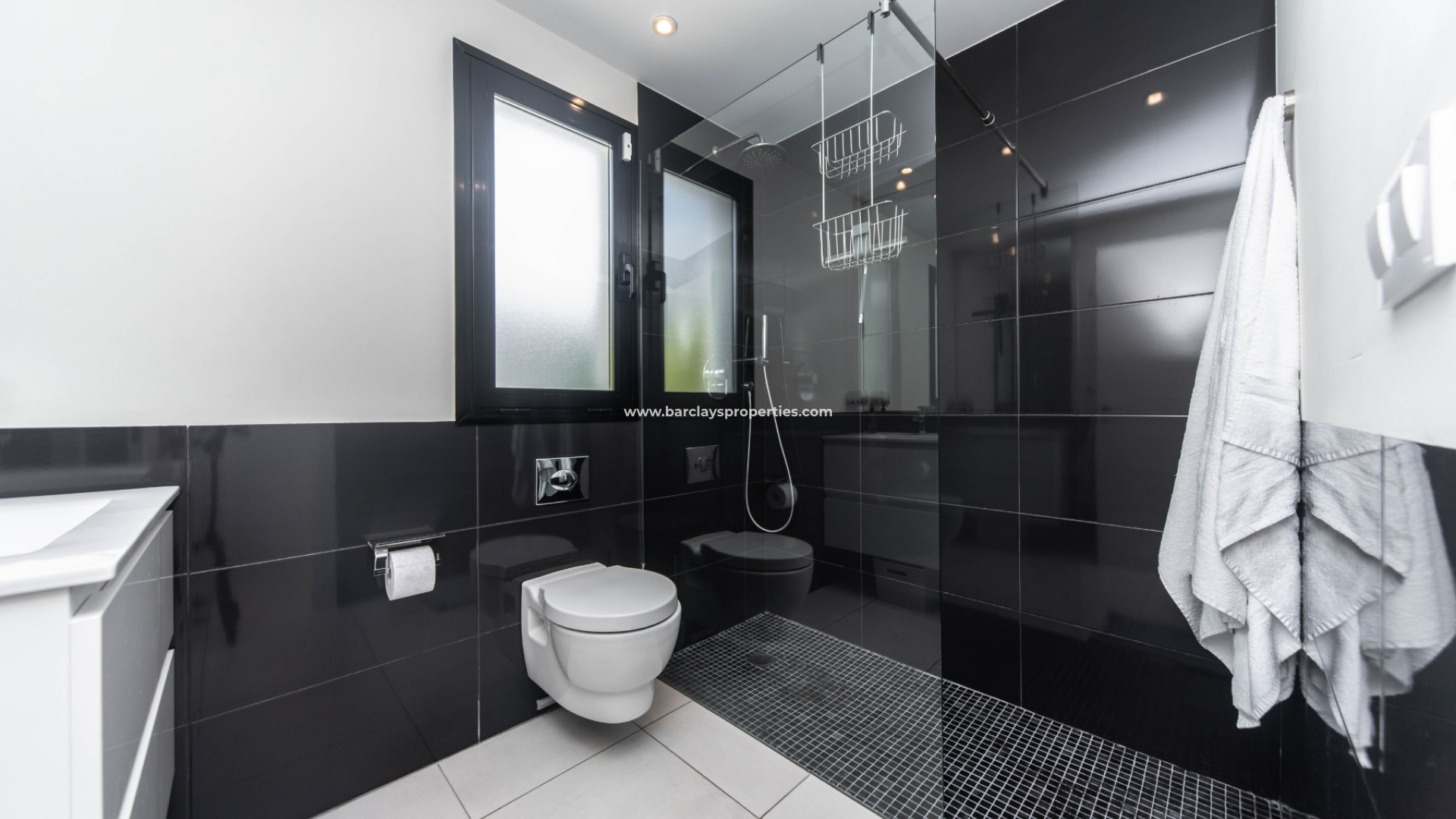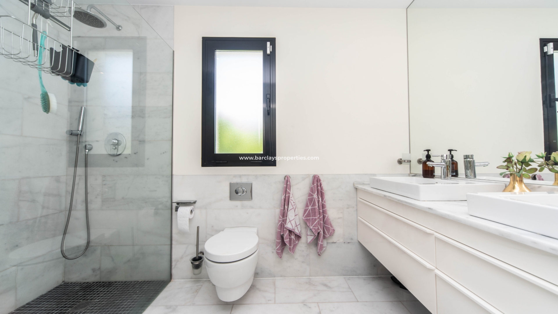 La amplia terraza cubierta nos lleva al interior de la villa. Al entrar, te recibe un gran vestíbulo que establece el tono para el resto de la casa. El diseño elegante y contemporáneo, junto con materiales de alta calidad, crea un ambiente sofisticado en todo el lugar. La espaciosa sala de estar de planta abierta fluye sin problemas hacia el amplio comedor y la cocina de planta abierta. La cocina está totalmente equipada con electrodomésticos de primera línea, lo que facilita tu mudanza sin problemas ni complicaciones. La cocina, diseñada cuidadosamente, cuenta con electrodomésticos de alta calidad, perfectos para entusiastas culinarios y aquellos a quienes les gusta recibir invitados. Toda esta área de la villa tiene puertas corredizas que dan al jardín. Las 4 habitaciones de esta villa son amplias, todas con acceso individual a la zona de la piscina. El dormitorio principal cuenta con su propio vestidor y un fabuloso baño en suite con ducha a ras de suelo y lavabo doble.