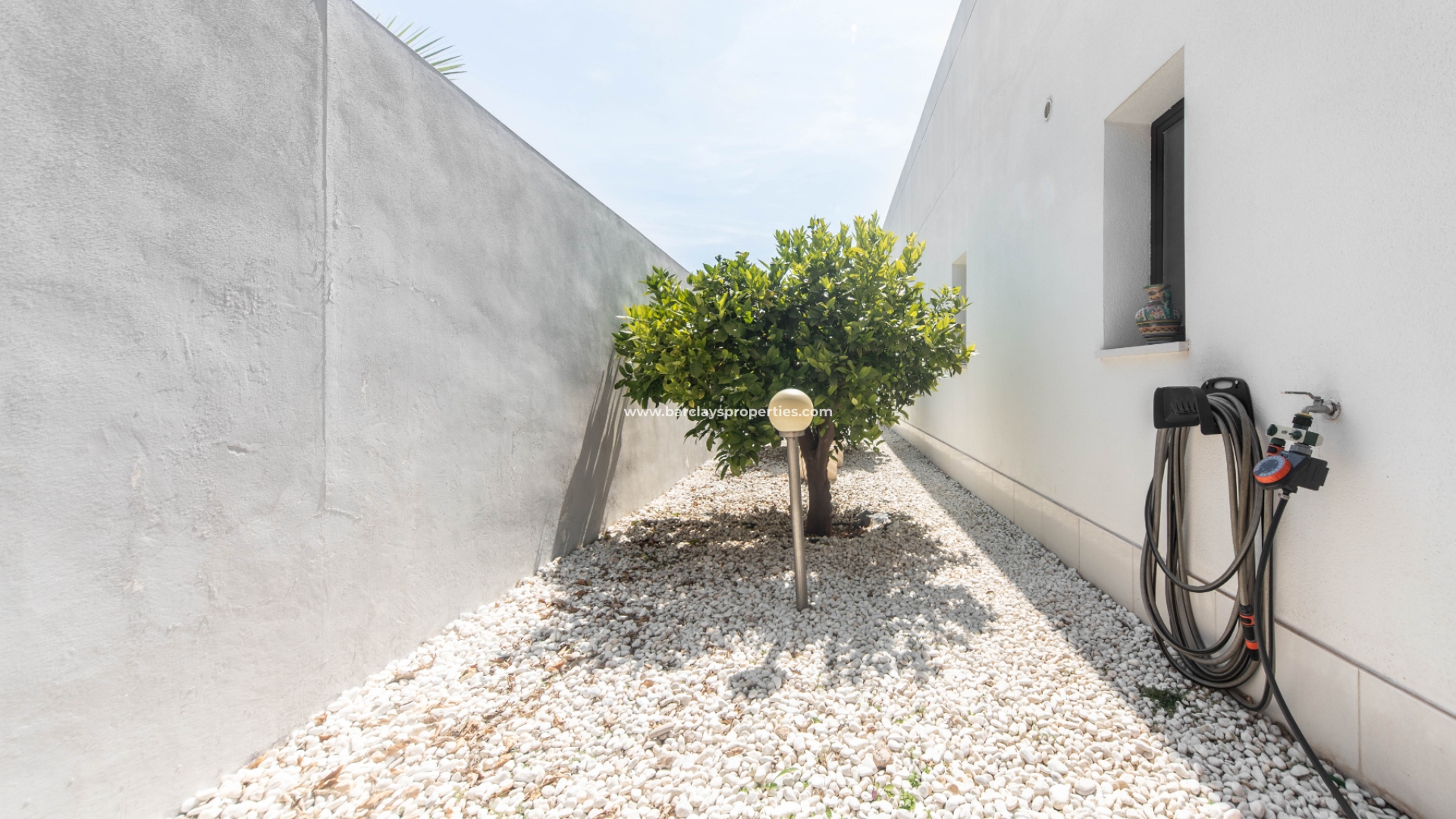 El jardín está bellamente embaldosado, con varias áreas sombreadas para sentarse y comer, así como áreas de césped artificial que complementan el aspecto moderno de la villa y añaden un toque de color al mismo tiempo. El jardín trasero y lateral está cubierto de gravilla y cuenta con varios árboles, y conduce a un amplio trastero que alberga una nueva caldera grande.