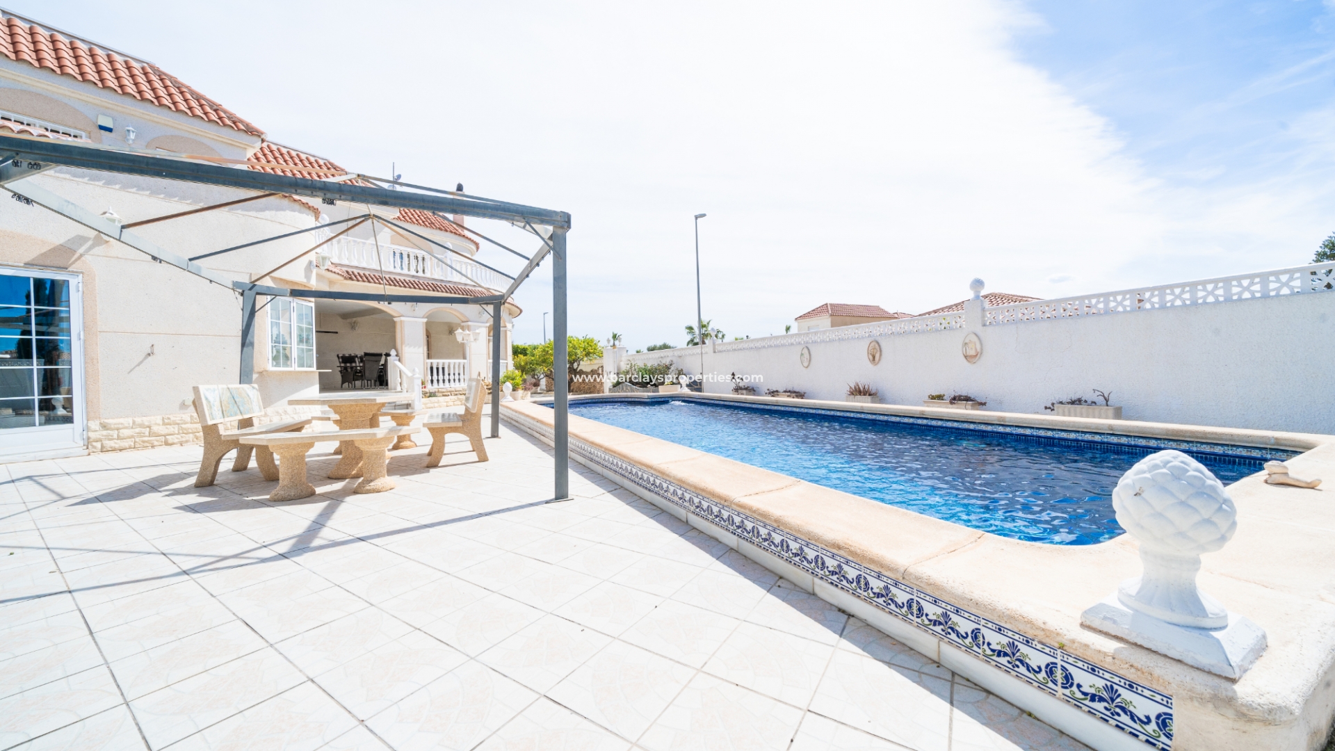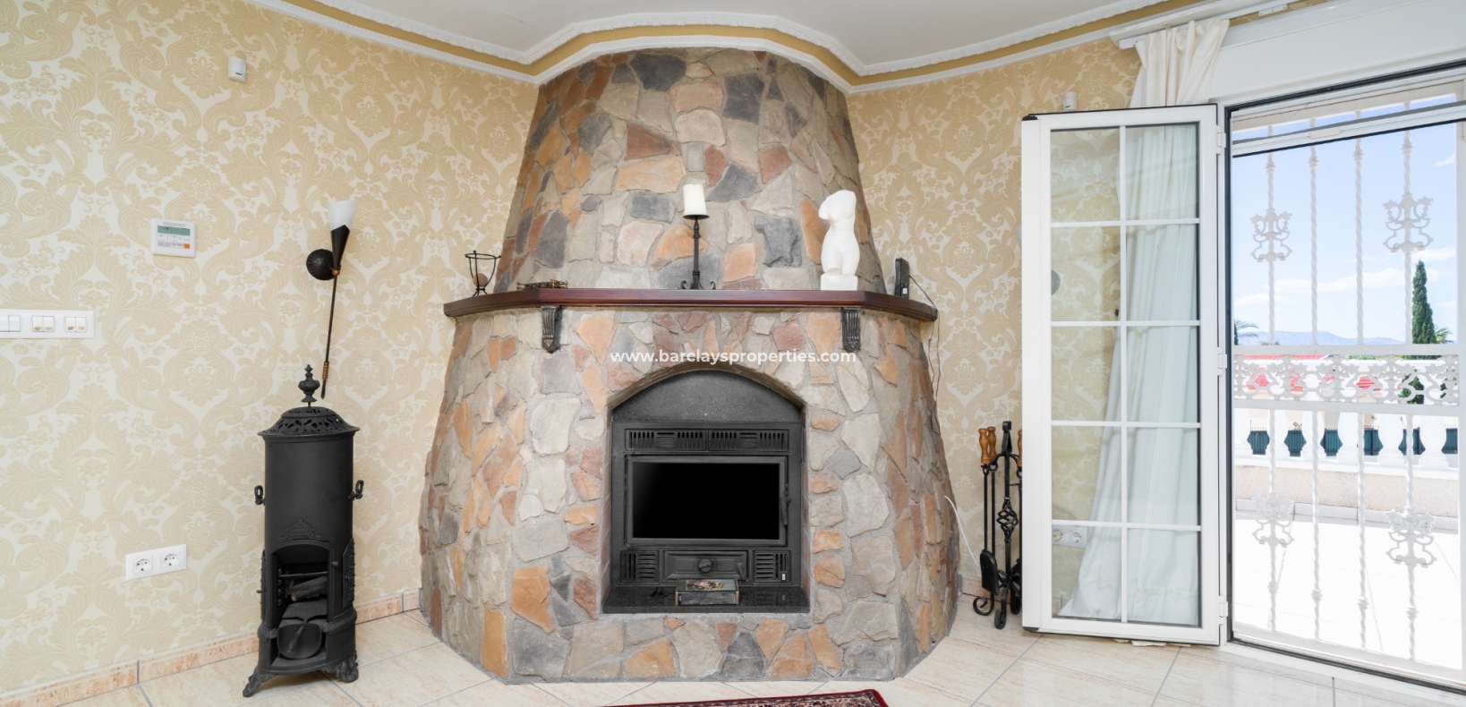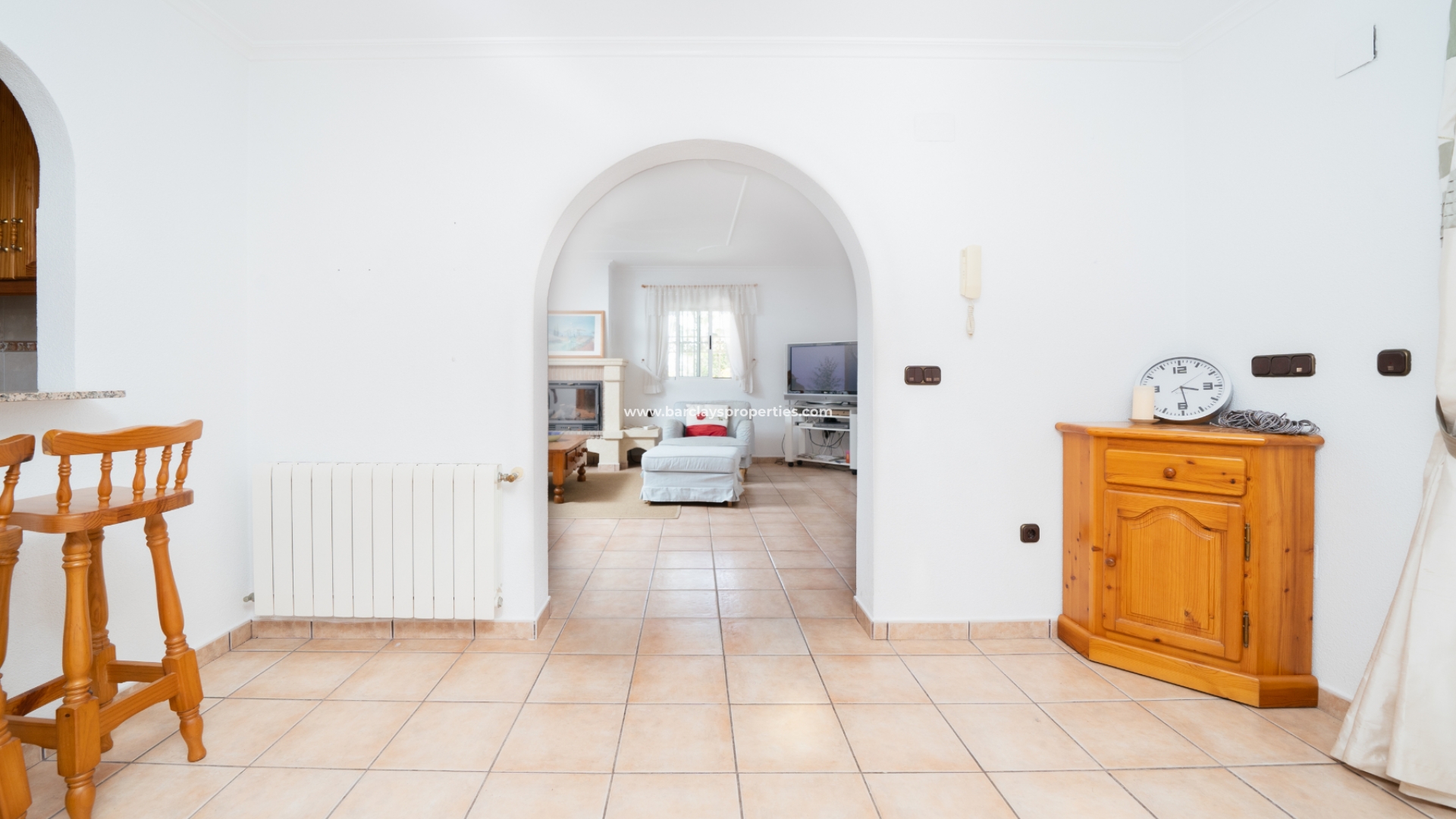 Somos recibidos por una gran terraza cubierta en la parte delantera con una zona de estar relajante, área de comedor y arcos abiertos con vistas a la piscina. Desde aquí entramos en la villa para encontrar un recibidor que conduce a la cocina de estilo rústico totalmente equipada con barra de desayuno que lleva al espacioso salón con chimenea y aire acondicionado. En la parte trasera del salón hay un práctico trastero.