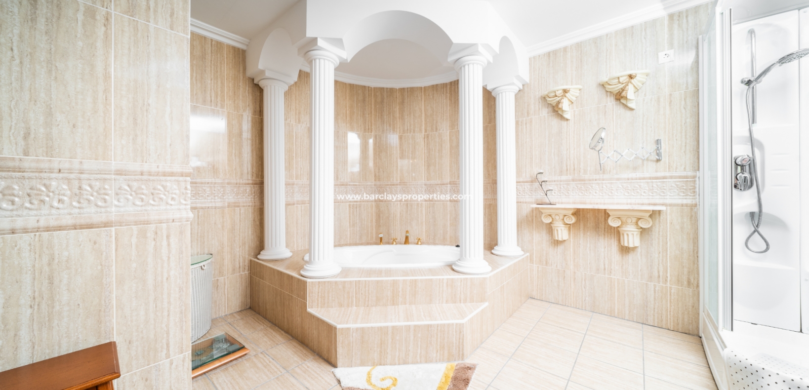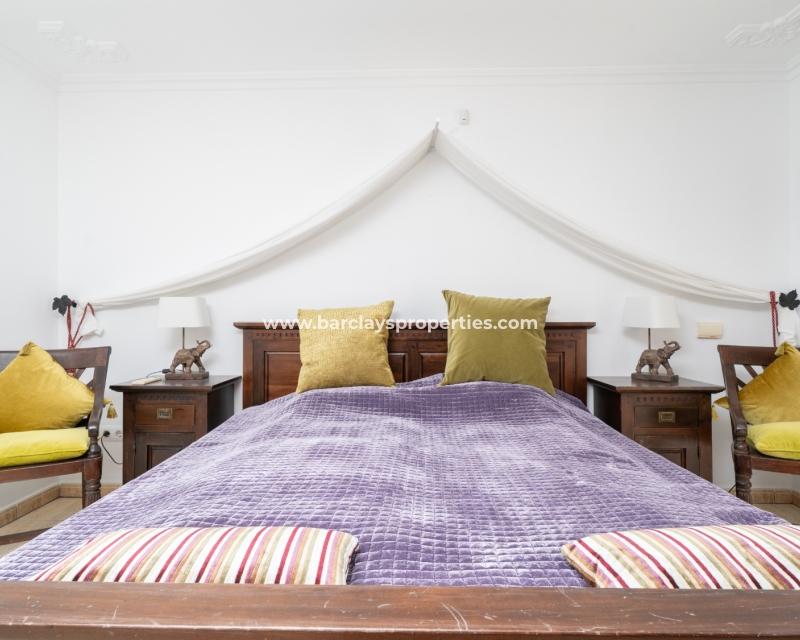 Desde el pasillo encontramos dos habitaciones dobles de buen tamaño, ambas equipadas con ventiladores de techo y aire acondicionado para su comodidad. Al final del pasillo hay una puerta que conduce a una escalera de madera tallada que lleva al apartamento separado / primer piso de esta gran villa. Esta área puede ser accedida por una puerta delantera separada en la terraza delantera. Un recibidor conduce a las diversas habitaciones encontradas en este nivel. El amplio salón cuenta con una chimenea de piedra y grandes puertas de patio que dan a la terraza al sol. El dormitorio doble ofrece un armario empotrado de cuatro puertas y acceso a una terraza cubierta privada mientras que el baño cuenta con lavabo/mueble de tocador, wc, bidet, ducha esquinera y una impresionante bañera esquinera de estilo romano.