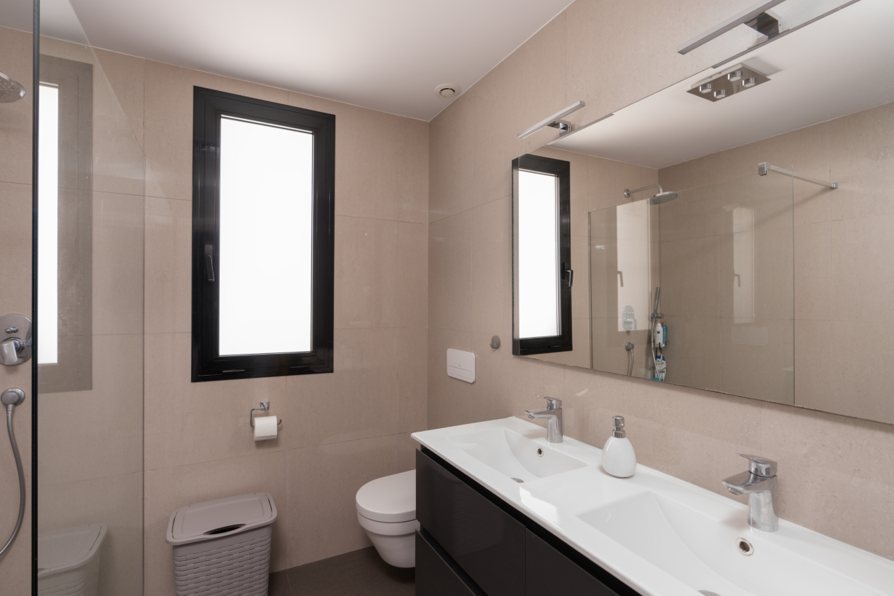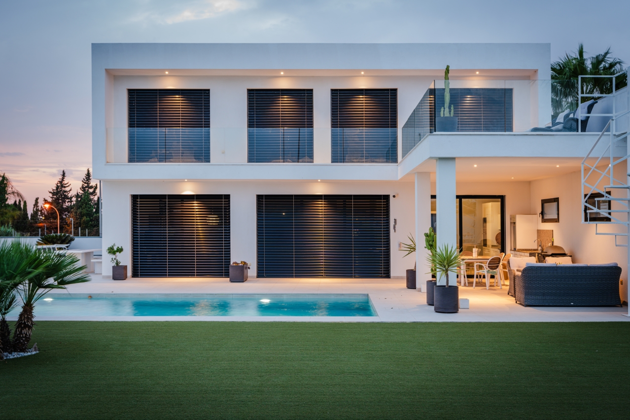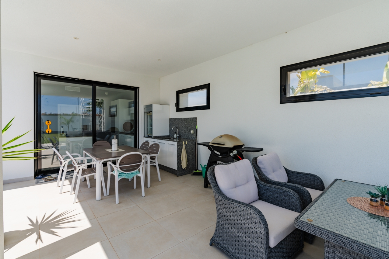 La villa cuenta con dos amplias terrazas, amuebladas con muebles de exterior de alta calidad, e incluye una cocina exterior, ideal para organizar reuniones memorables con familiares y amigos. Una escalera exterior conecta el jardín con la terraza del piso superior, que proporciona acceso directo a los cuatro elegantes dormitorios.