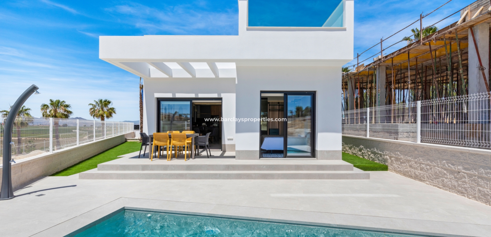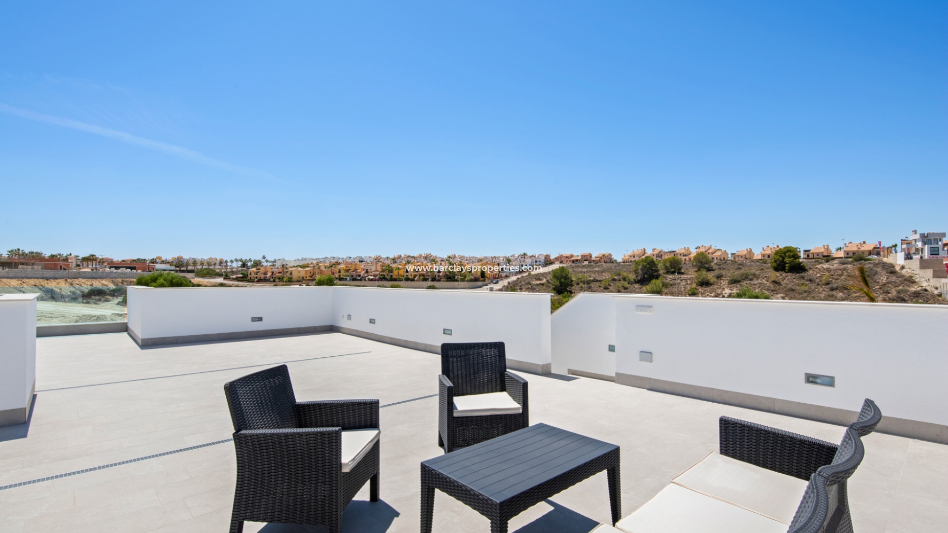 Con características de alta calidad como ventanas de doble acristalamiento, persianas eléctricas, puerta de seguridad reforzada y un sistema de videoportero, esta villa garantiza comodidad y seguridad. Las comodidades adicionales incluyen preinstalación de aire acondicionado, un sistema de calefacción de agua por aerotermia y un solárium en la azotea para disfrutar del sol.