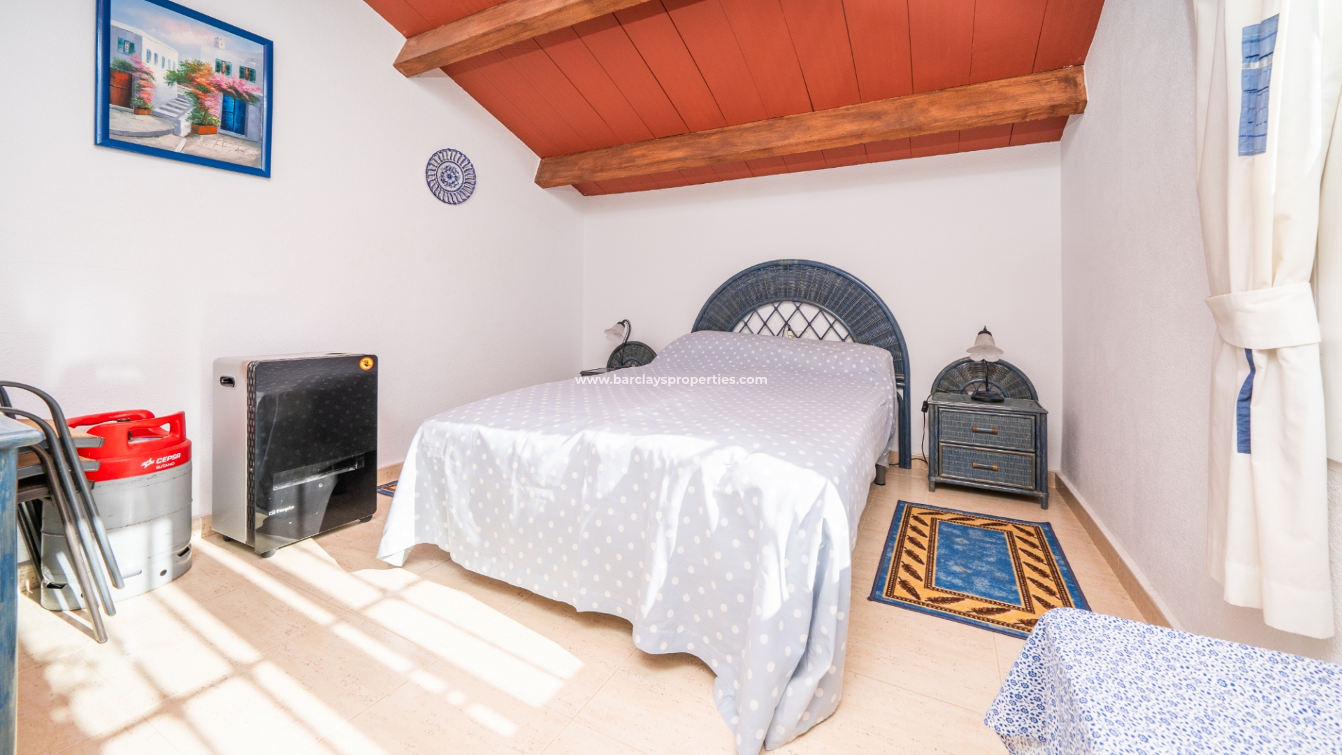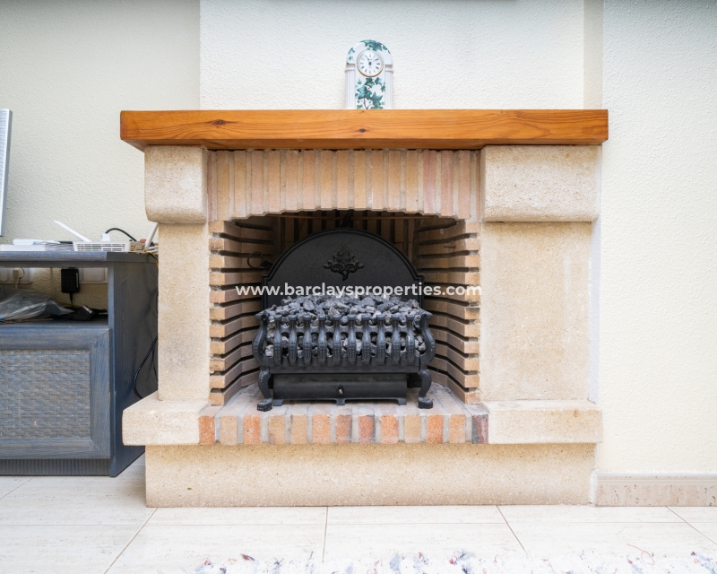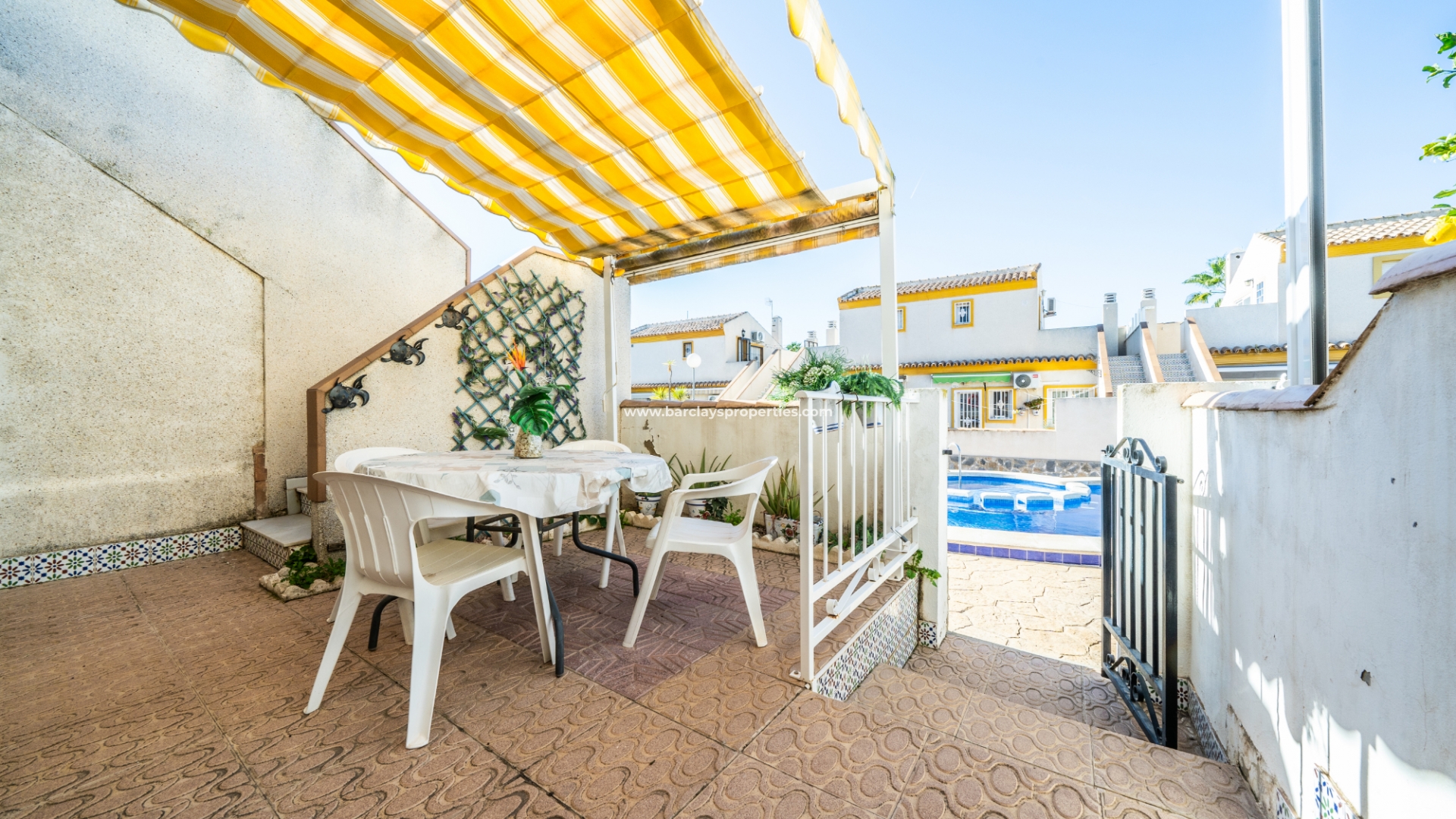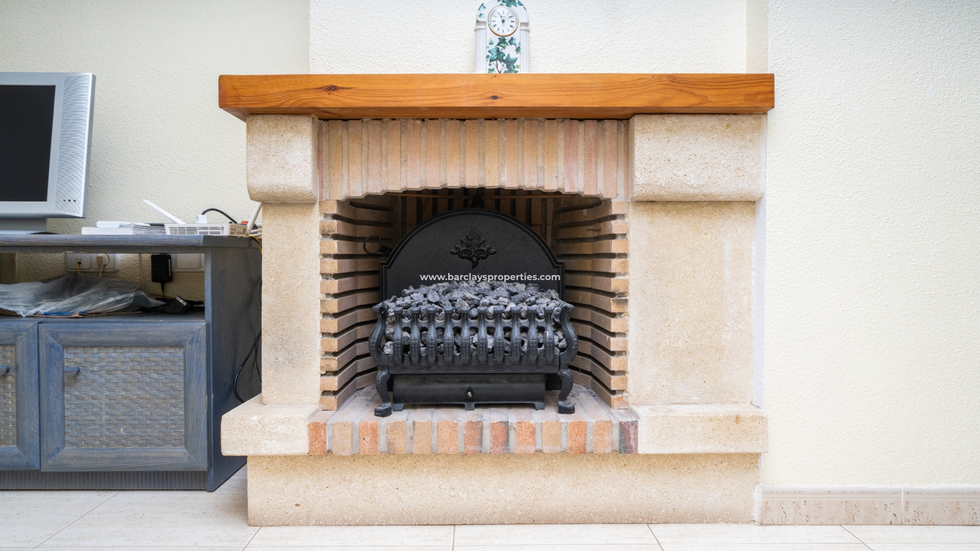 Una bonita terraza cubierta delantera con área de descanso y toldos solares conduce al interior de la propiedad y al acogedor salón con zona de comedor, chimenea abierta y aire acondicionado para comodidad durante todo el año. Desde el pasillo encontramos un dormitorio doble con aire acondicionado y armarios empotrados, una habitación doble con ventilador de techo y armario empotrado, y un baño con ducha de pared a pared, inodoro y lavabo con espejo. La cocina independiente y equipada tiene una puerta de acceso al jardín trasero con área de descanso, toldo solar, zona de utilidad/almacenaje y acceso directo, a través de la puerta del jardín, a la zona de la piscina comunitaria.