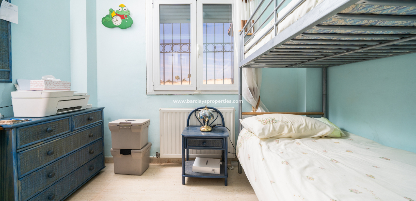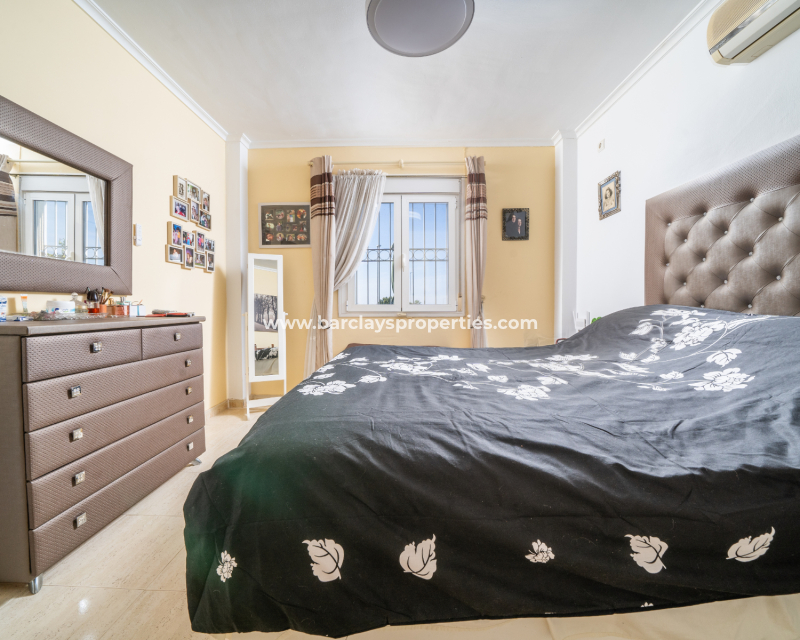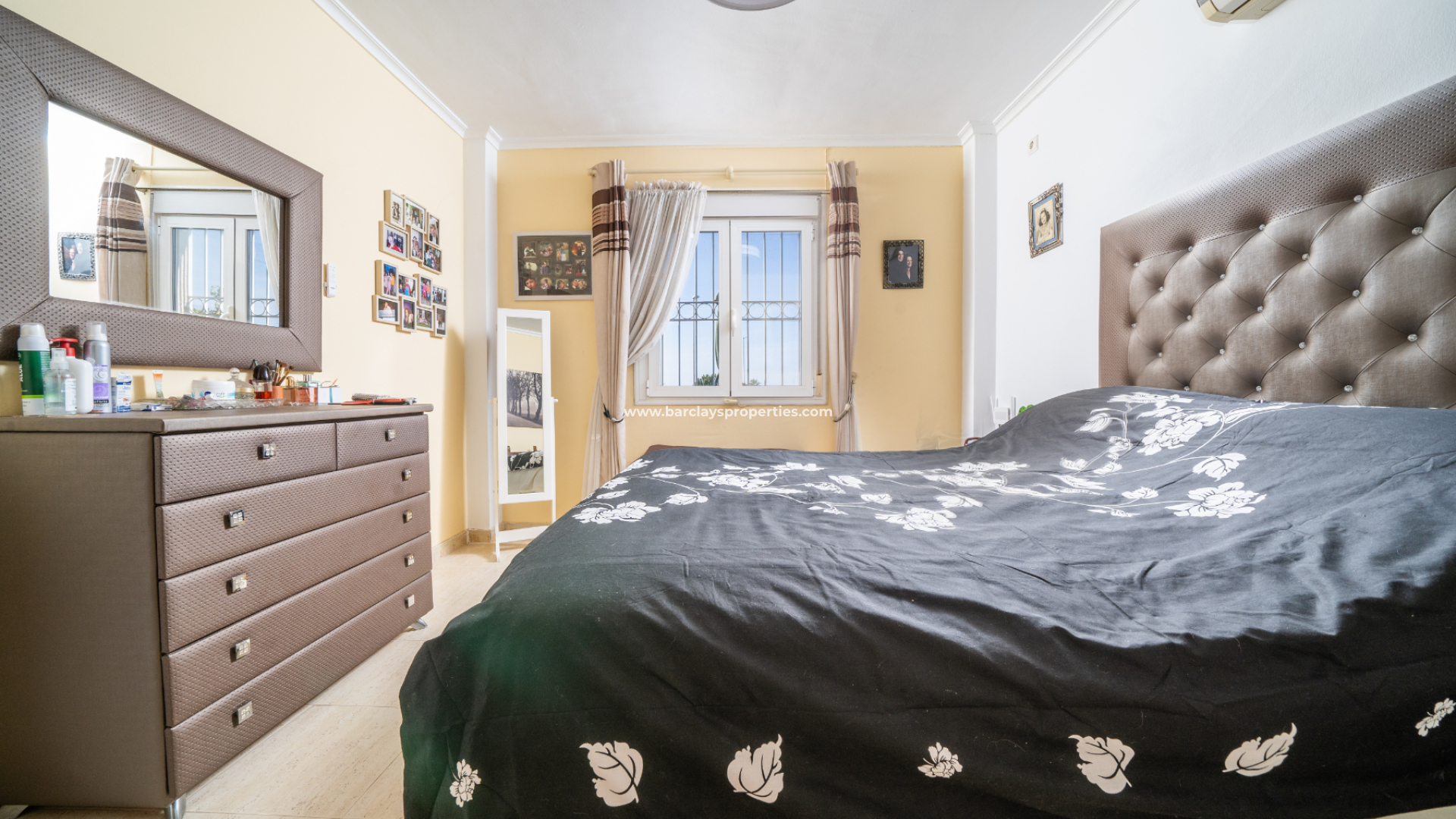 La villa tiene tres dormitorios. El primero, actualmente utilizado como oficina, incluye camas gemelas, armarios empotrados y un ventilador de techo. Un baño con ducha a ras de suelo, lavabo y WC se encuentra convenientemente cerca. El dormitorio principal es de tamaño generoso, con grandes armarios empotrados, ventilador de techo y aire acondicionado. Su baño en suite incluye una bañera de tamaño completo, WC y lavabo.