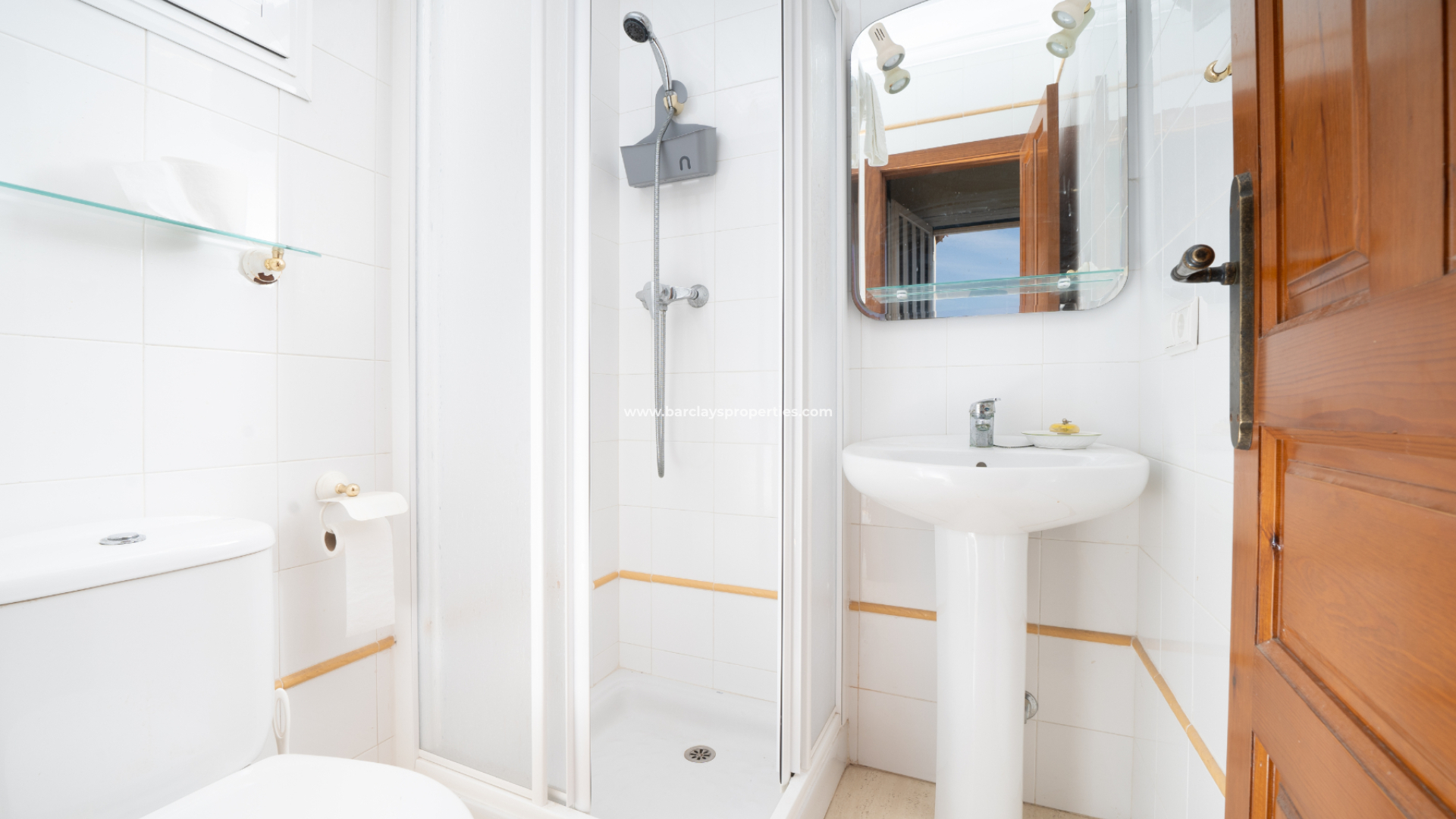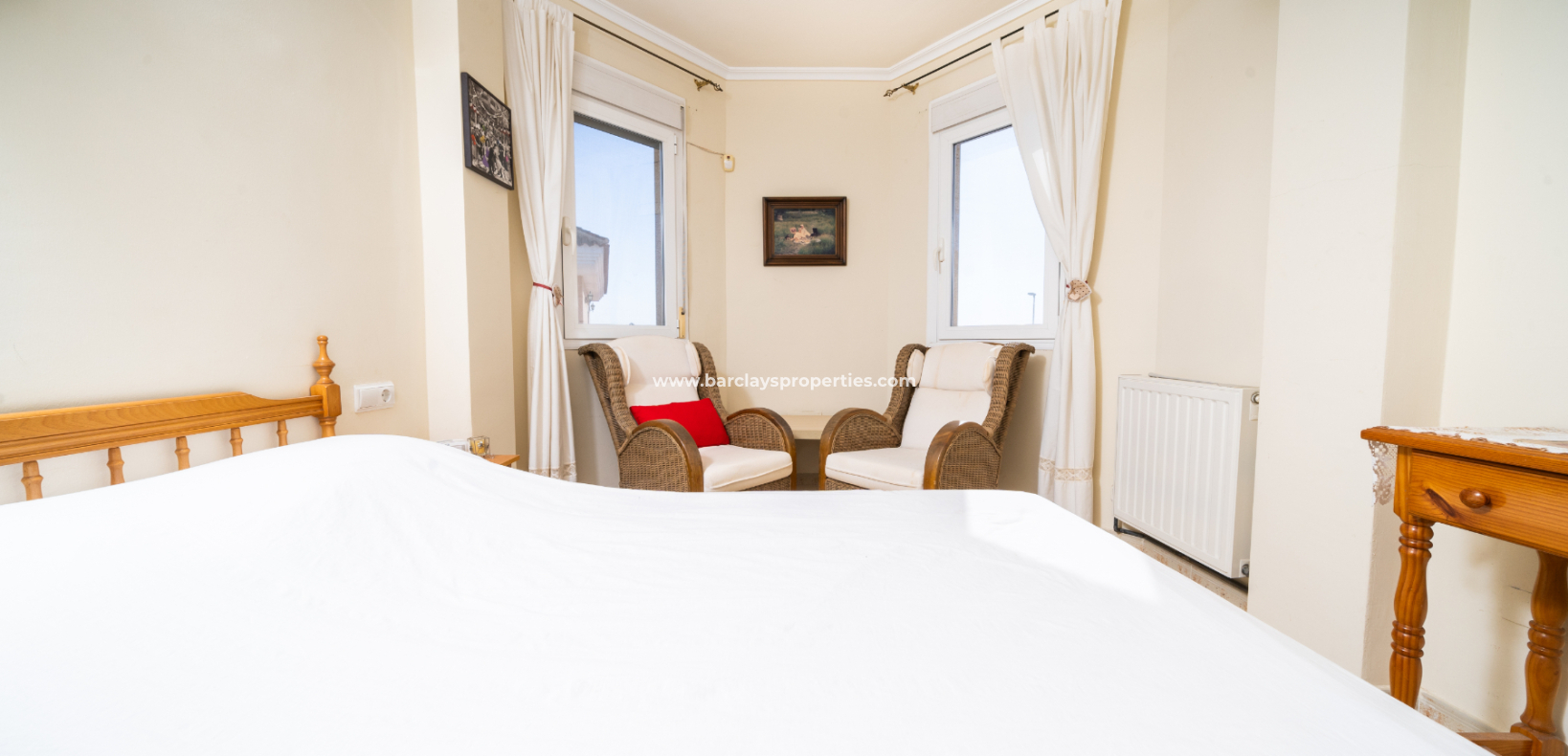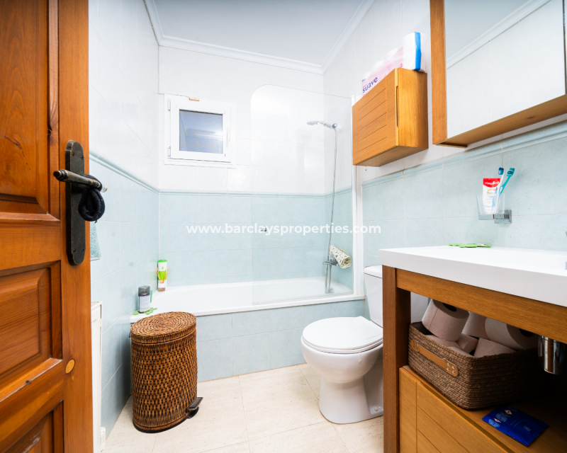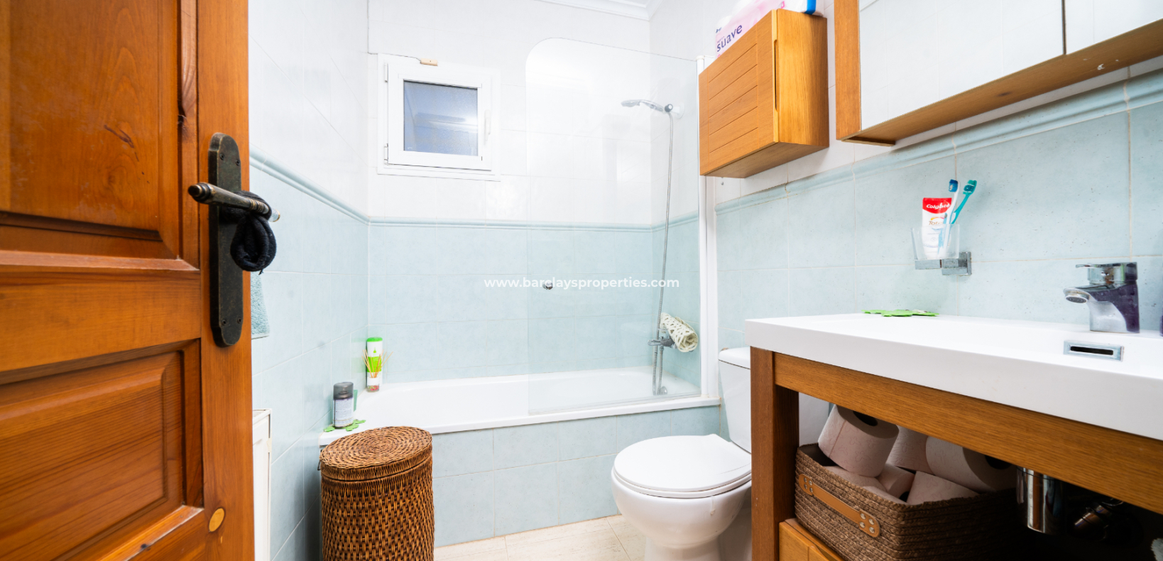 La villa tiene tres dormitorios. El primero, actualmente utilizado como oficina, incluye camas gemelas, armarios empotrados y un ventilador de techo. Un baño con ducha a ras de suelo, lavabo y WC se encuentra convenientemente cerca. El dormitorio principal es de tamaño generoso, con grandes armarios empotrados, ventilador de techo y aire acondicionado. Su baño en suite incluye una bañera de tamaño completo, WC y lavabo.