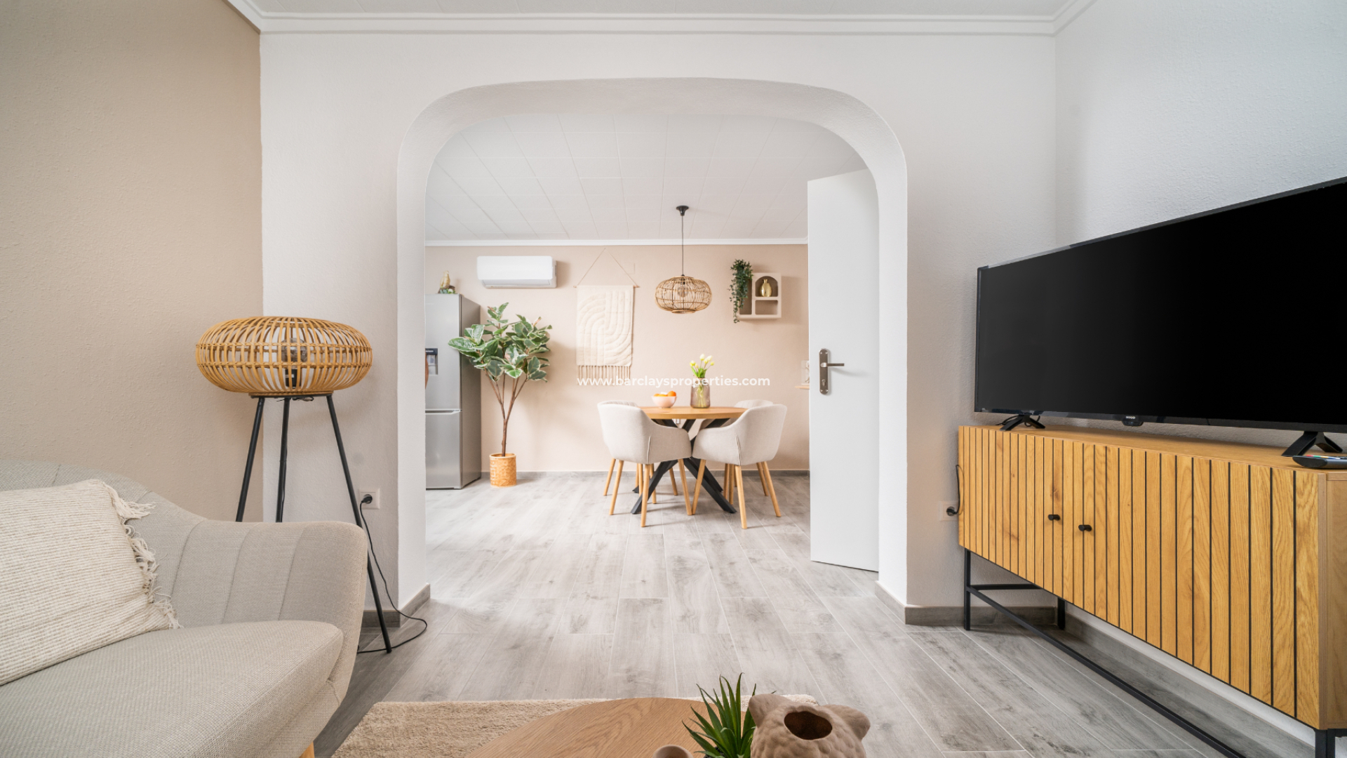 En el interior, la vivienda cuenta con dos aires acondicionados nuevos para una comodidad durante todo el año. La zona de salón y comedor fluye sin interrupciones hacia la moderna cocina abierta mencionada anteriormente. También en la planta baja encontramos un dormitorio doble y un baño moderno con espejo LED.