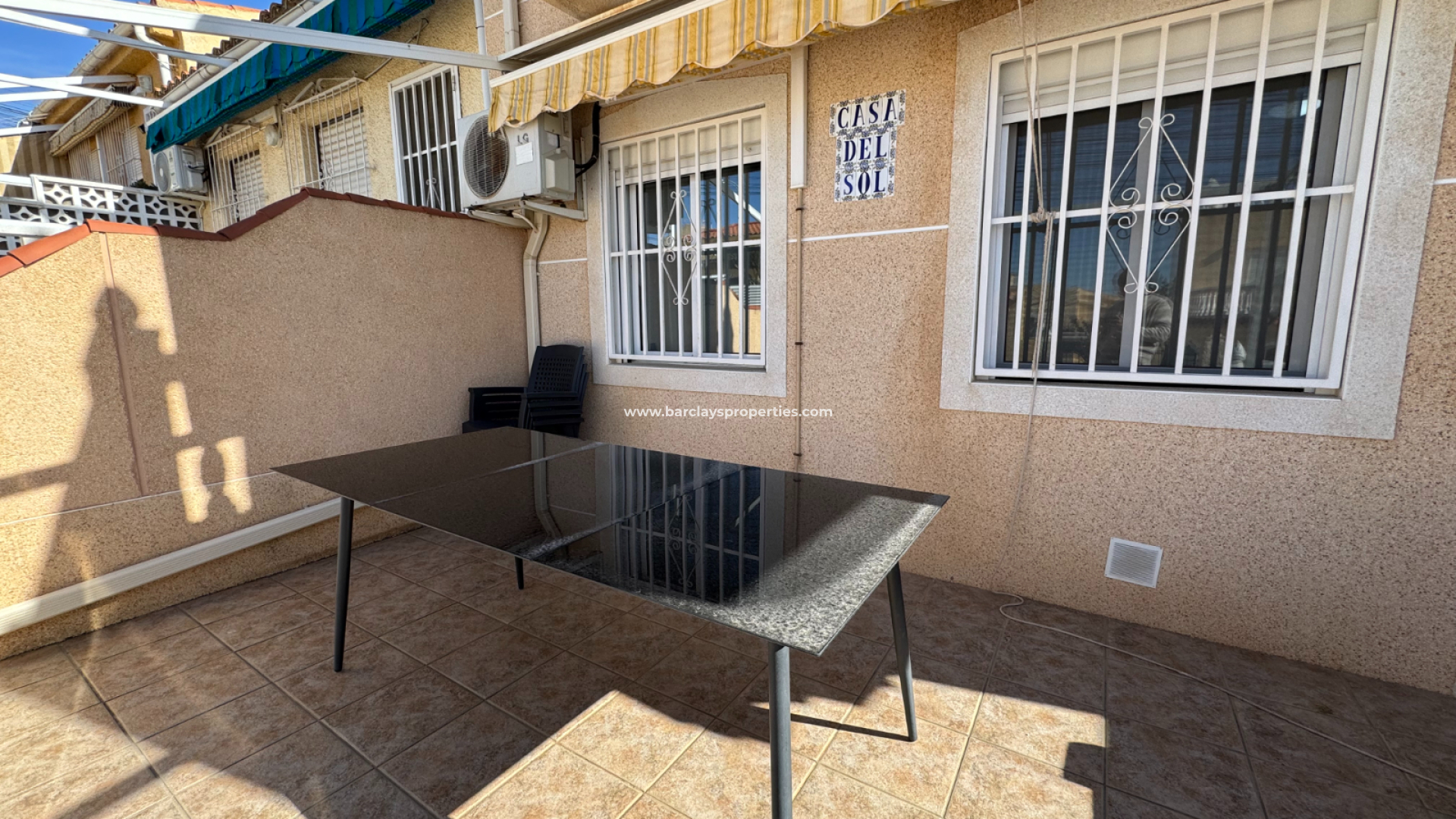 La entrada conduce a una terraza soleada elevada, ideal para cenar al aire libre, con el beneficio adicional de un toldo para sombra durante los cálidos meses de verano. Debajo de la terraza elevada, ➡️ hay un trastero subterráneo a su disposición. El espacio exterior ha sido mejorado con nuevos azulejos en el suelo y balaustradas decorativas.