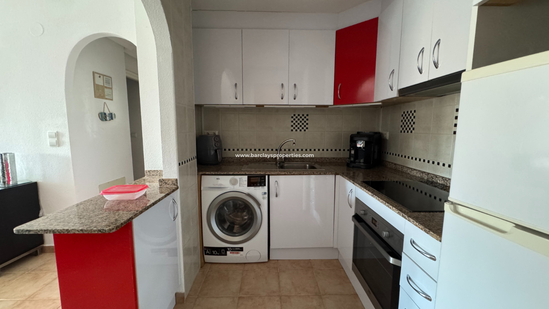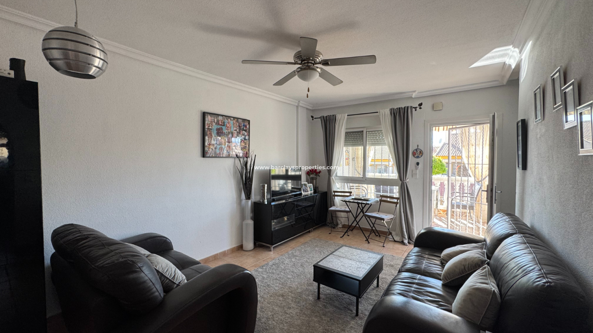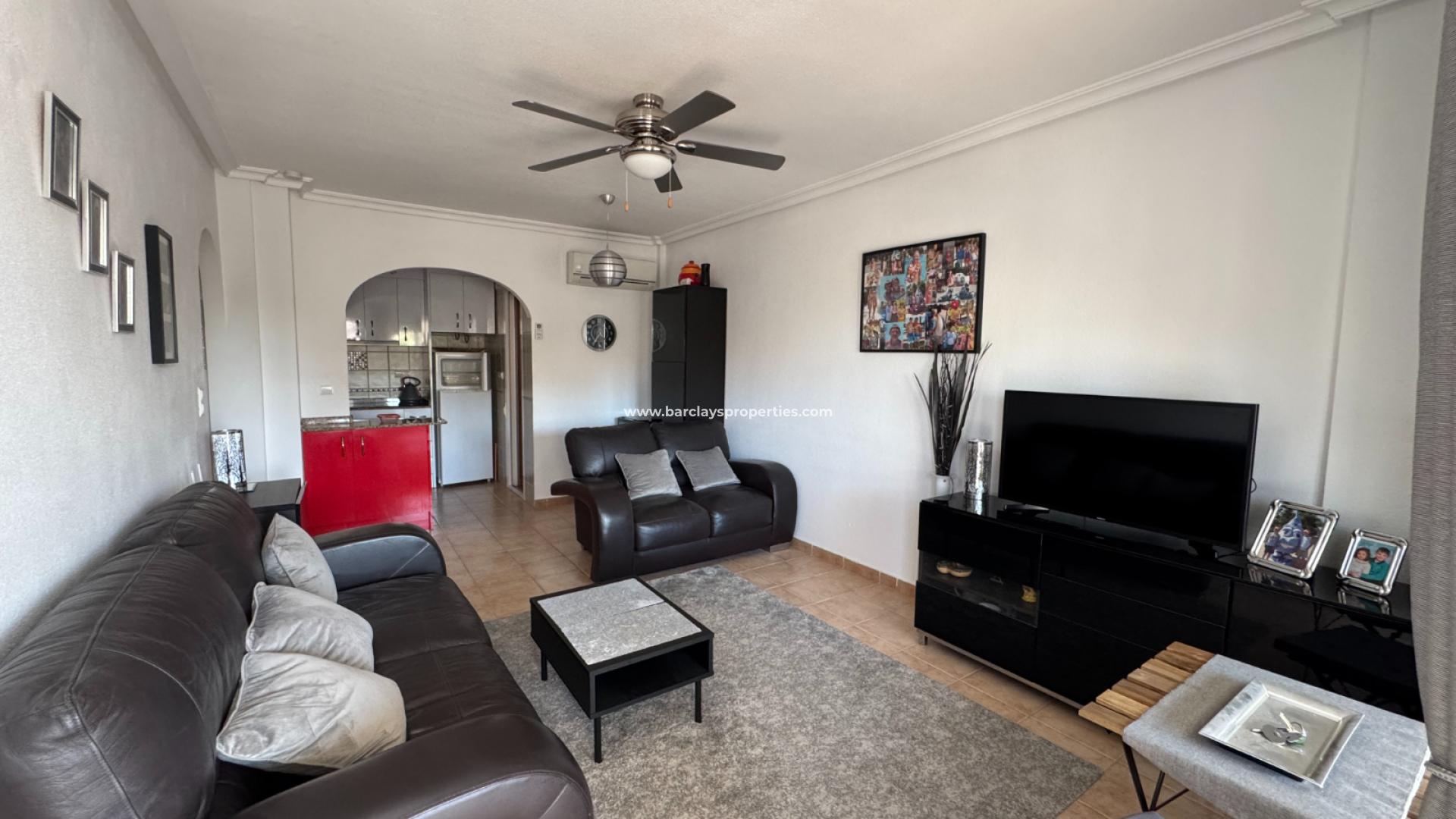 Al entrar, encontrará un área de estar luminosa y aireada equipada con aire acondicionado y ventiladores de techo, asegurando un ambiente fresco y acogedor. La cocina independiente está bien diseñada e incluye un lavadero para mayor practicidad. En esta planta también se encuentran dos cómodos dormitorios con armarios empotrados y ventiladores de techo, uno de ellos con aire acondicionado, junto con un baño con ducha bien equipado.