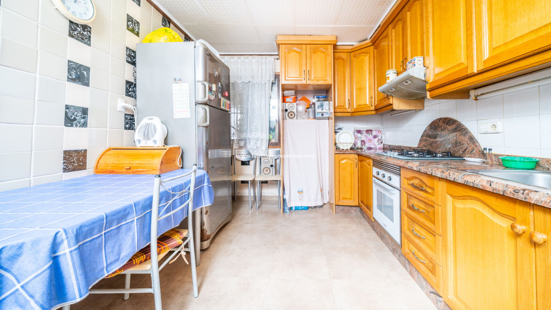 En el interior, la propiedad ha sido actualizada recientemente con nuevos suelos, nuevas puertas interiores y una entrada principal reforzada. El salón principal cuenta con aire acondicionado y mucha luz natural, mientras que la cocina es amplia y de estilo rústico. Desde la cocina se accede a un lavadero/trastero con salida al jardín.