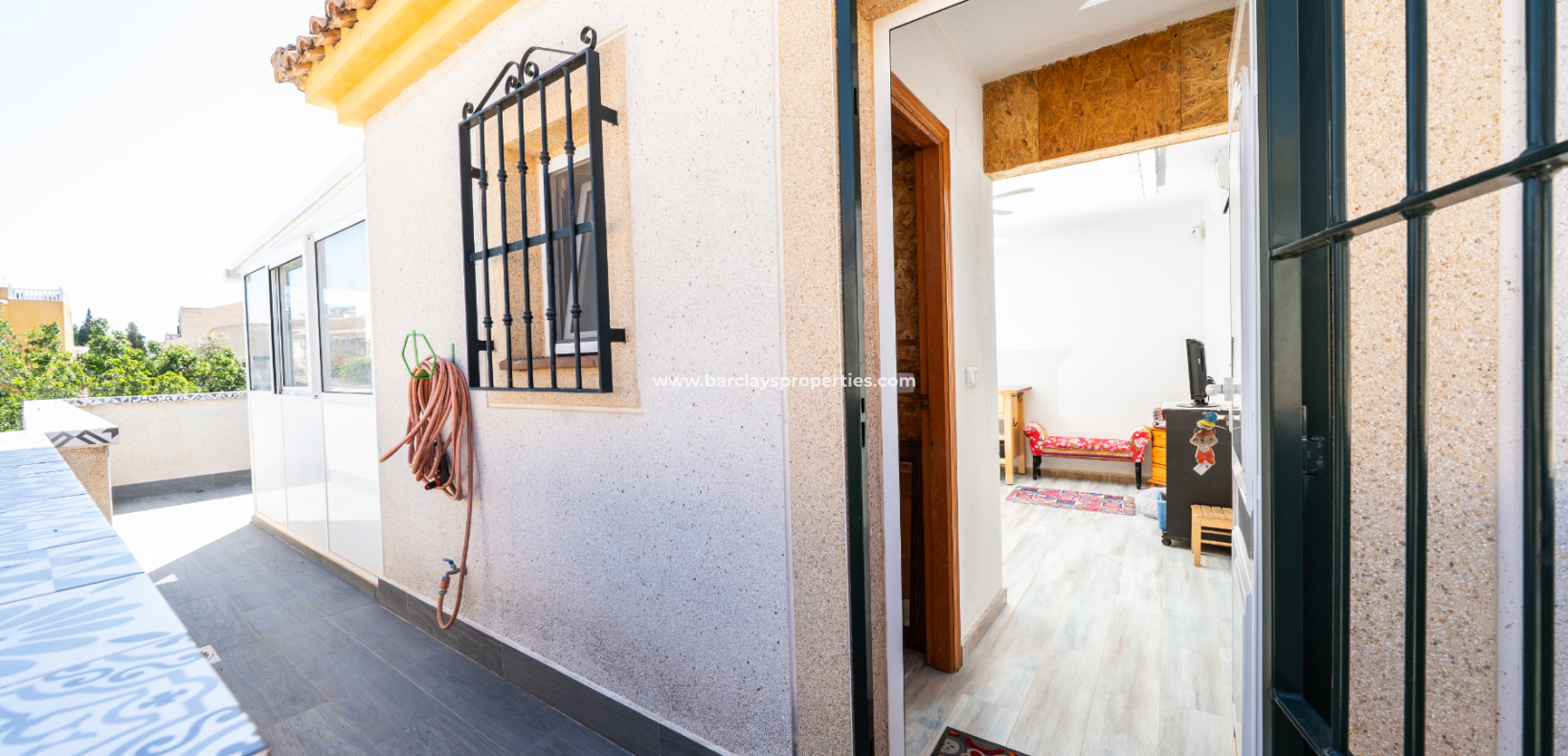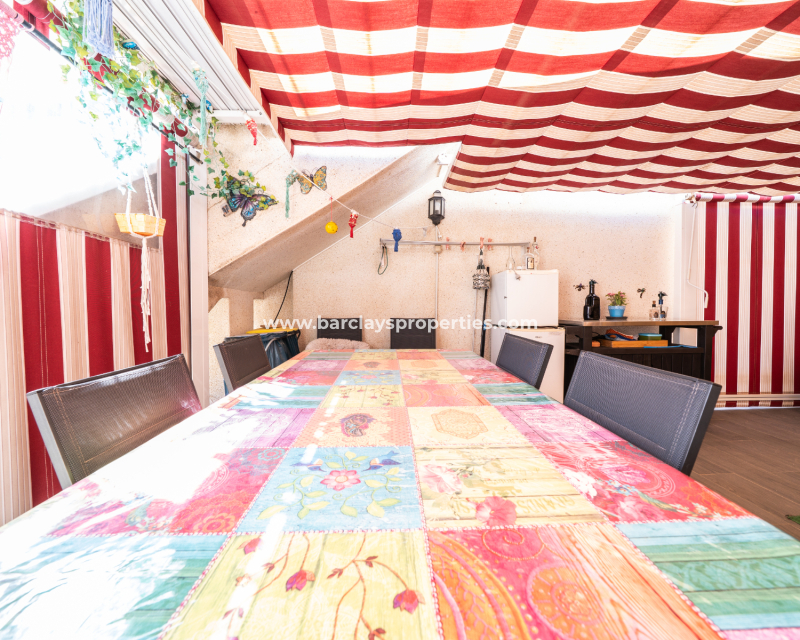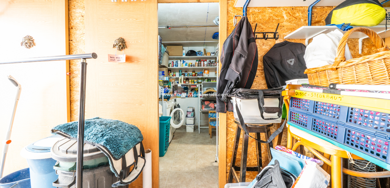El amplio salón es luminoso y acogedor, con aire acondicionado y ventilador de techo. La cocina, recientemente instalada, ofrece amplio espacio de almacenamiento y acabados modernos. Junto al salón principal se encuentra una gran terraza acristalada con ventilador de techo, perfecta para relajarse o recibir visitas en cualquier estación del año.