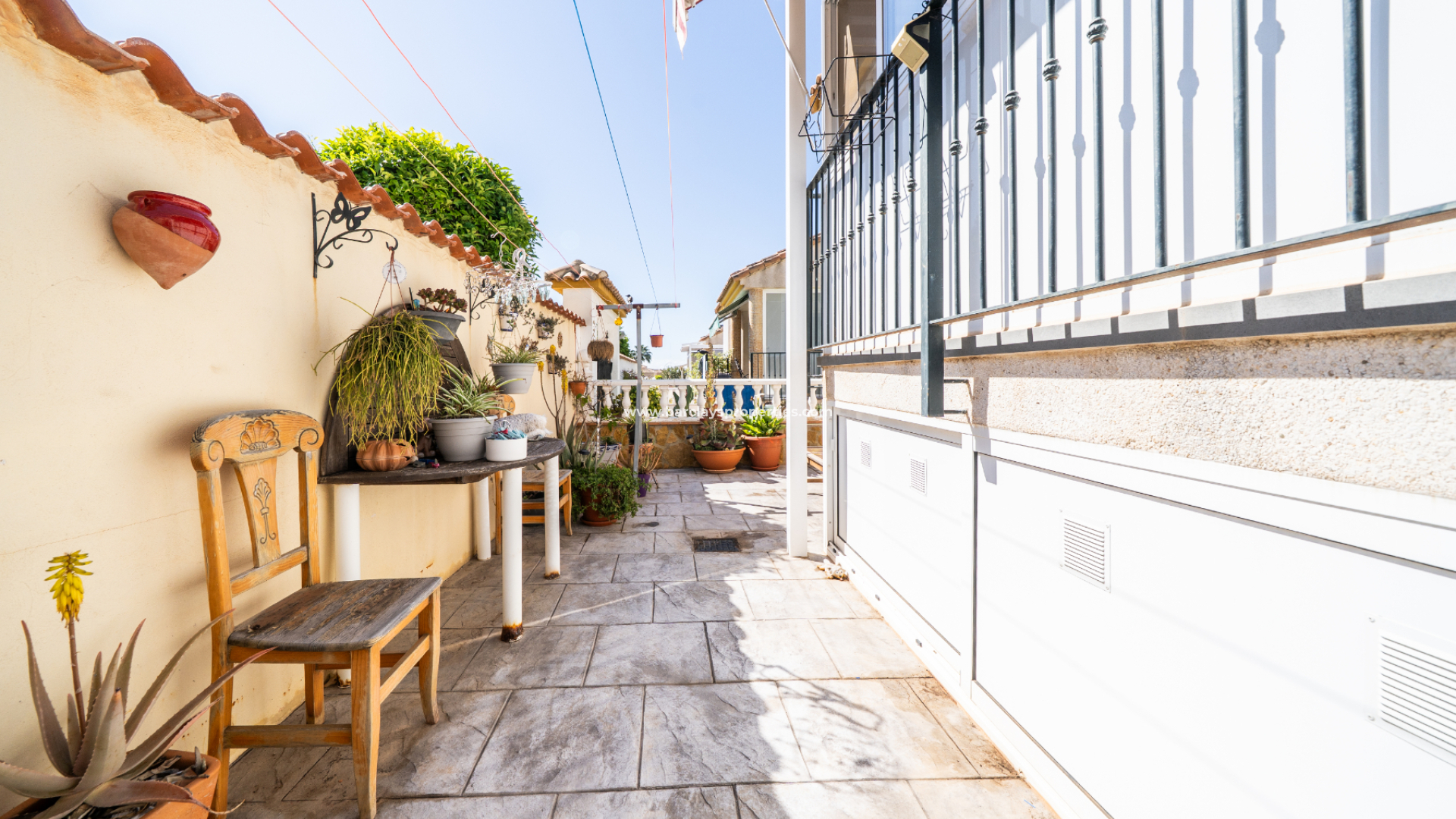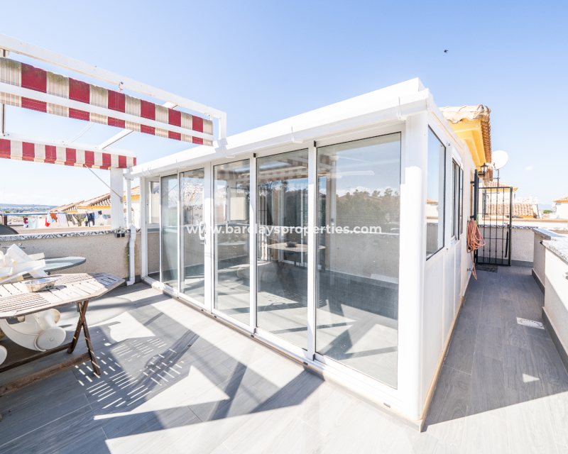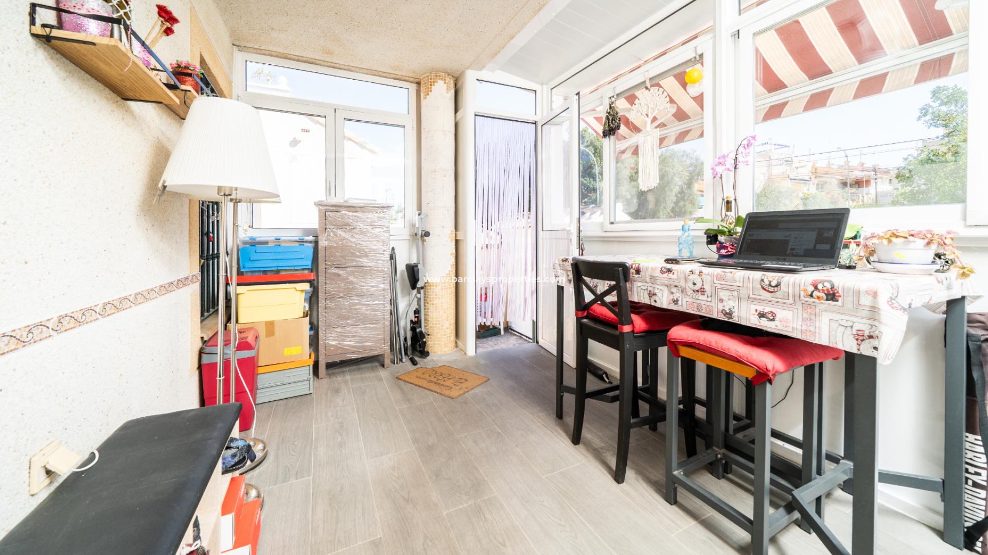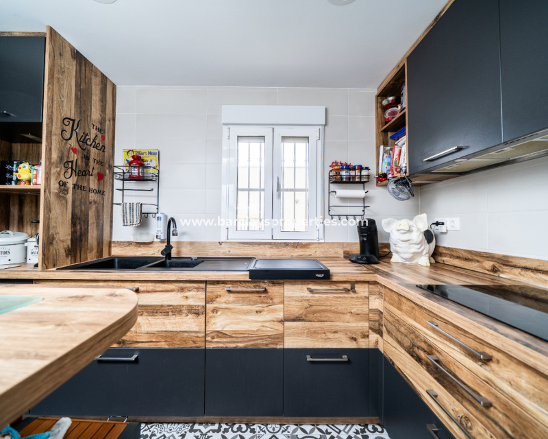 El amplio salón es luminoso y acogedor, con aire acondicionado y ventilador de techo. La cocina, recientemente instalada, ofrece amplio espacio de almacenamiento y acabados modernos. Junto al salón principal se encuentra una gran terraza acristalada con ventilador de techo, perfecta para relajarse o recibir visitas en cualquier estación del año.