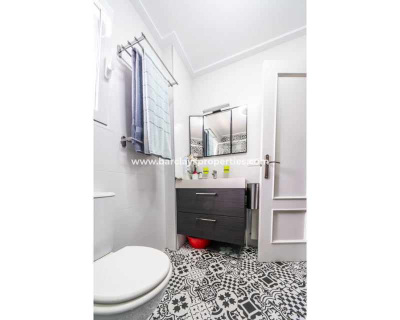 En el interior, la villa cuenta con tres dormitorios y un baño principal equipado con ducha a ras de suelo, inodoro y mueble de lavabo. Uno de los dormitorios se encuentra en la planta superior, ideal para recibir a invitados o familiares, y dispone de aire acondicionado y ventilador de techo para mayor confort durante todo el año. En este nivel también hay un aseo adicional con lavabo y mueble.