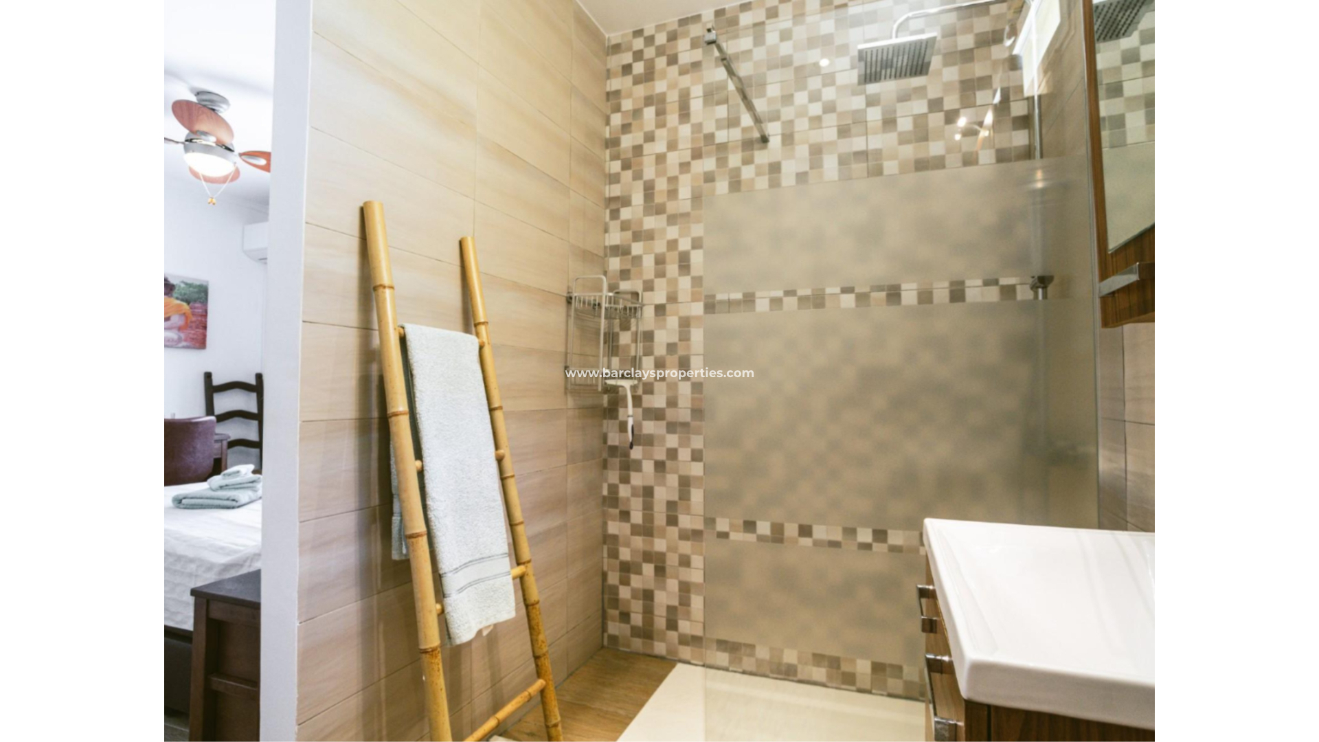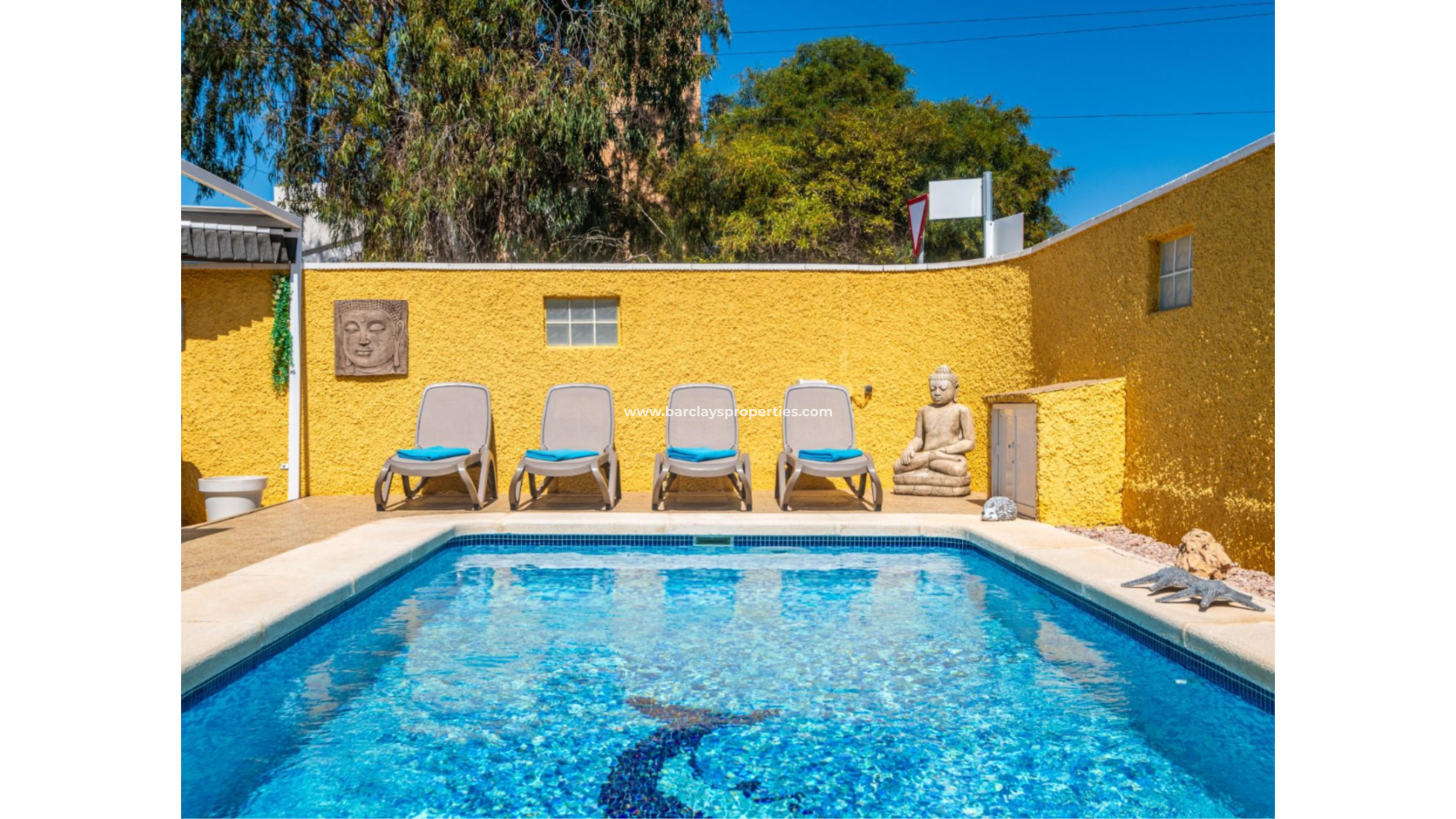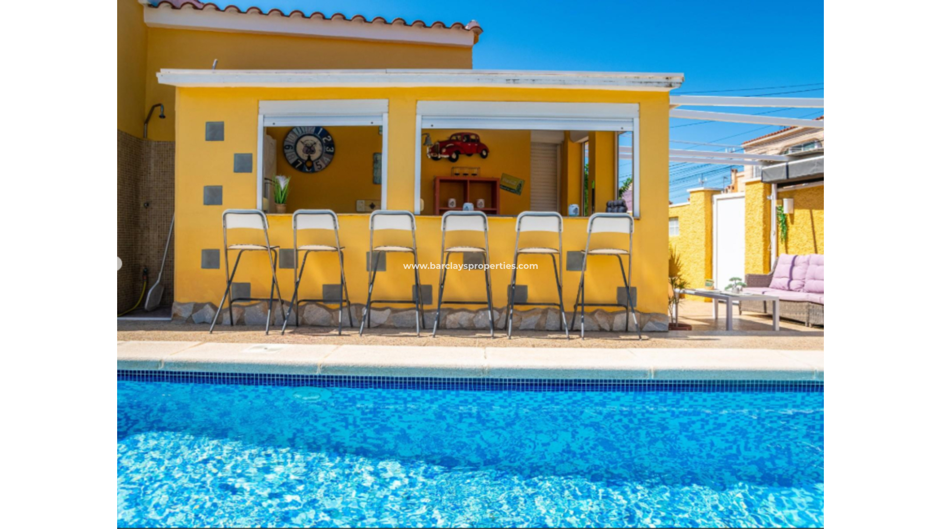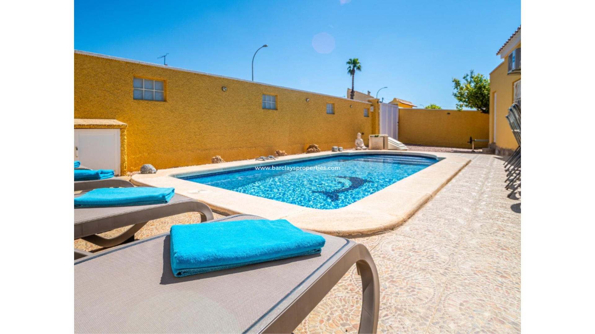 Encantadora y completamente reformada, esta villa independiente de 3 dormitorios y 2 baños, con un aseo adicional, se sitúa en una parcela de 268 m² en la tranquila pero bien comunicada urbanización de La Marina, San Fulgencio. Construida en una sola planta con 105 m² de superficie construida, ofrece una cocina independiente y espaciosa, una luminosa sala de estar con estufa de pellets, aire acondicionado en toda la vivienda y un lavadero. En el exterior, la propiedad dispone de ➡️ una piscina privada climatizada, ducha exterior, bar en el jardín y amplias terrazas—ideales para disfrutar y relajarse al sol. También cuenta con plaza de aparcamiento privada, trastero, ventanas de doble acristalamiento, paneles solares y se vende completamente amueblada, con electrodomésticos incluidos. A tan solo 5 km de la playa, 800 m de los servicios locales, 10 km del campo de golf y 25 km del aeropuerto de Alicante, la ubicación es ideal tanto para residencia permanente como para alquiler vacacional. ➡️ Esta villa no solo ofrece confort y estilo, sino también un excelente potencial de alquiler y eficiencia energética.