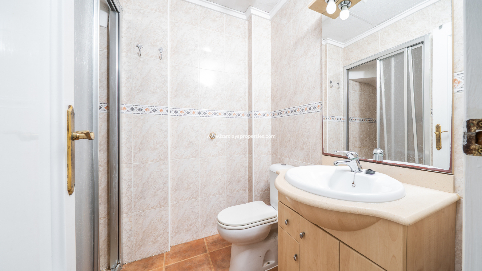 La planta baja también ofrece un dormitorio doble con armario empotrado y un baño familiar con ducha a ras de suelo, inodoro, lavabo con mueble, y extractor.