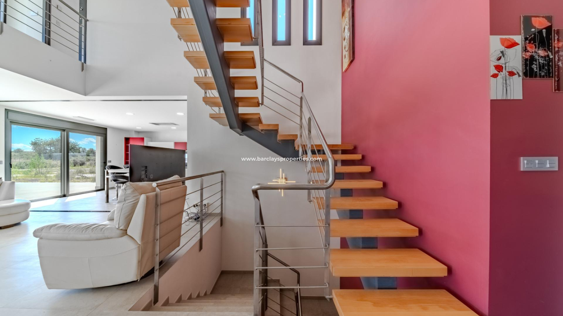 Esta extraordinaria villa de 5 dormitorios y 5 baños en La Marina del Pinet (Elche) combina la vida de lujo con la funcionalidad moderna ➡️ distribuida en tres plantas y 424 m² de área construida, sobre una extensa parcela de 10.602 m². Construida en 2016 y con orientación sur, la vivienda ofrece impresionantes vistas de 360° al campo y a la montaña, a solo 5 km de la playa y a 25 km del aeropuerto de Alicante. El espacioso diseño de planta abierta, realzado por materiales de primera calidad, ➡️ un ascensor privado, un semisótano y avanzadas características de accesibilidad, garantiza tanto el confort como la elegancia. Entre los aspectos más destacados se incluyen una cocina de diseño con isla central y electrodomésticos de alta gama, una sala de estar que se abre a una amplia terraza y cocina de verano con barbacoa, y ➡️ una zona de bienestar completa con una piscina de 12 x 6 m, un jacuzzi elevado y una ducha exterior con energía solar.
