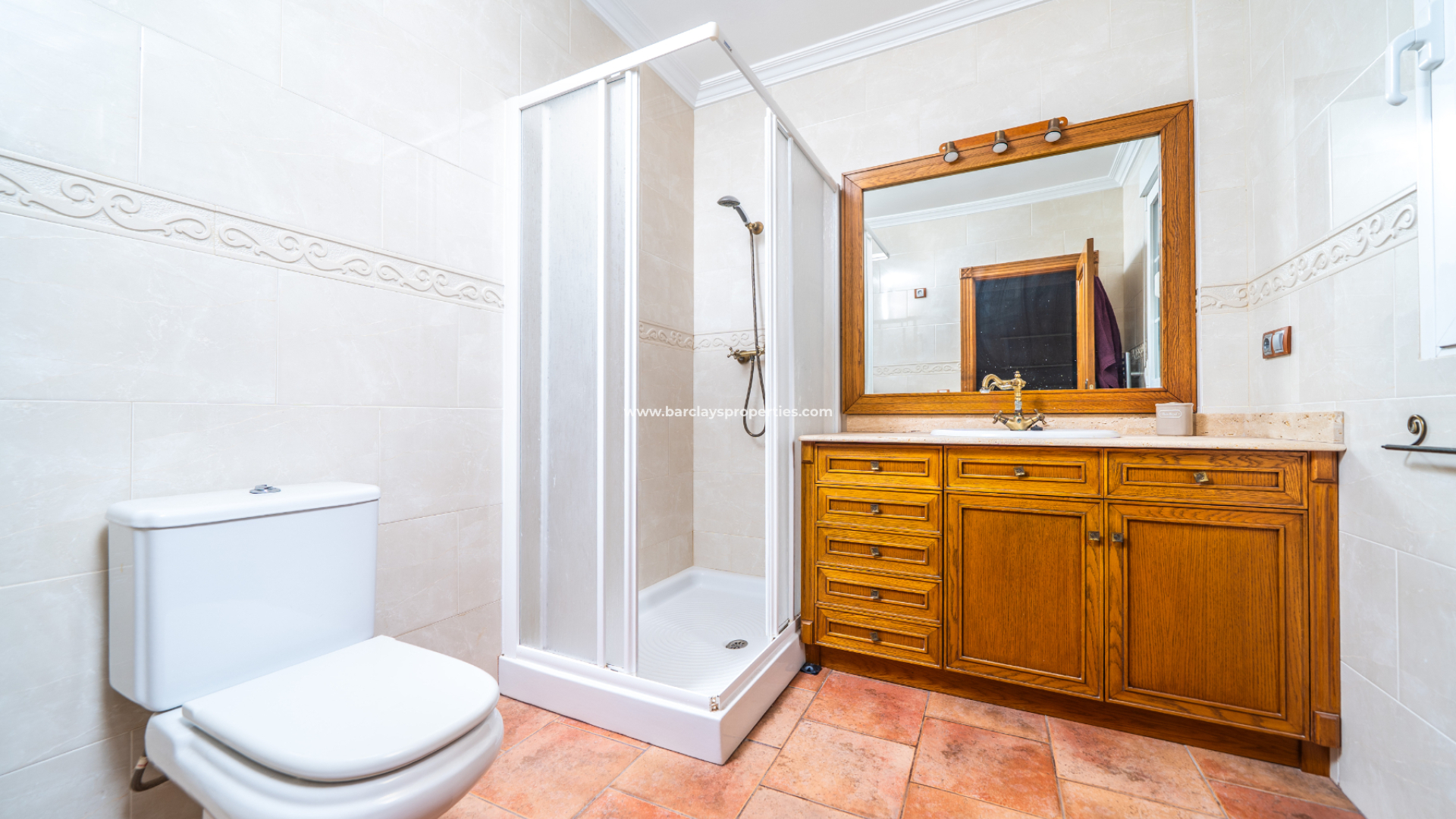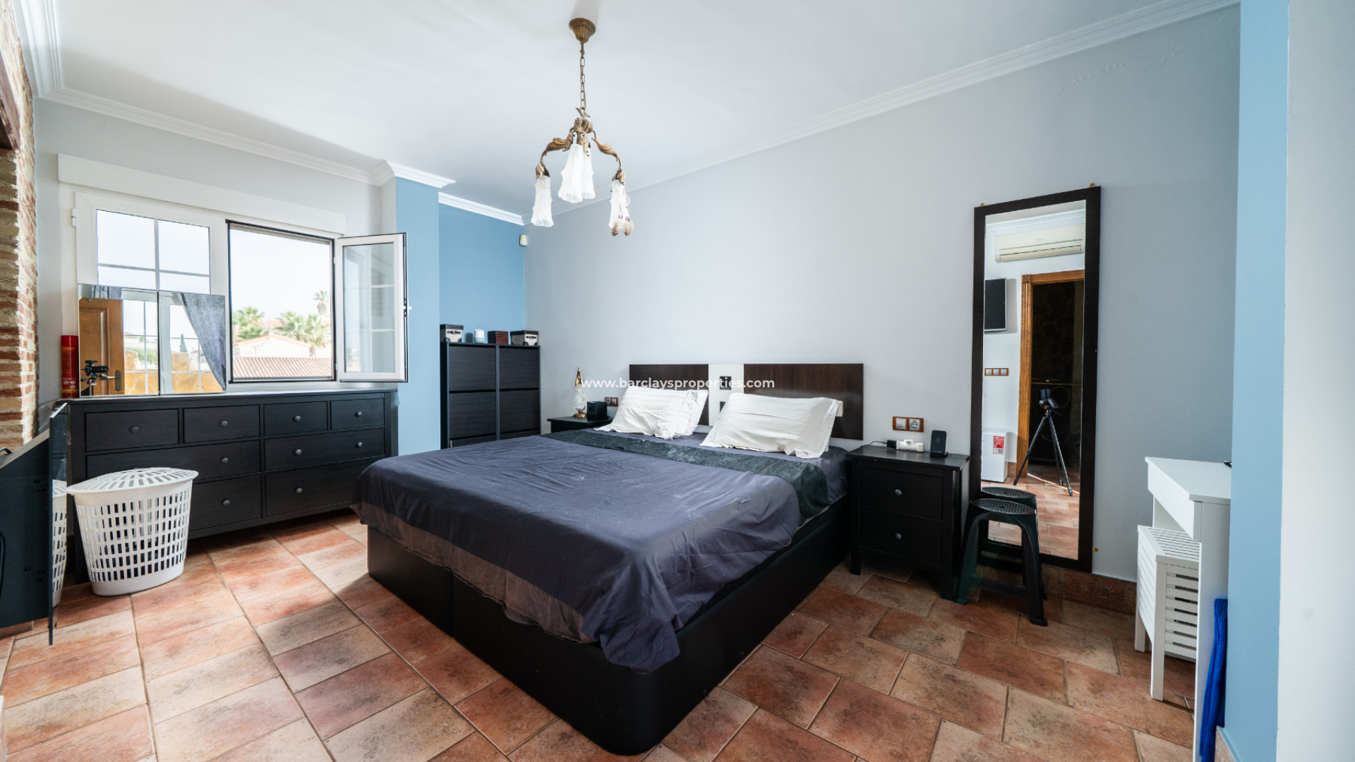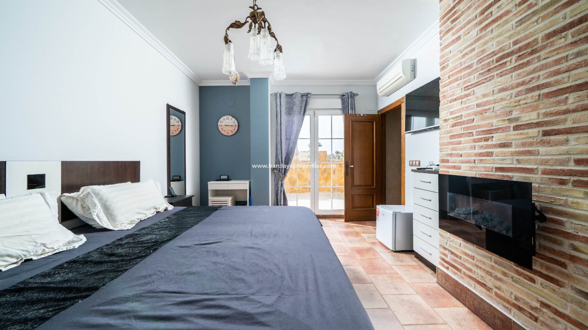 Además, una habitación amplia ofrece aire acondicionado, zona de vestidor, baño privado con ducha, y acceso directo a un gran balcón privado —perfecto para relajarse o entretenerse, con ✅ vistas panorámicas a la urbanización La Escuera, a la vecina urbanización La Marina y al campo hacia Rojales.