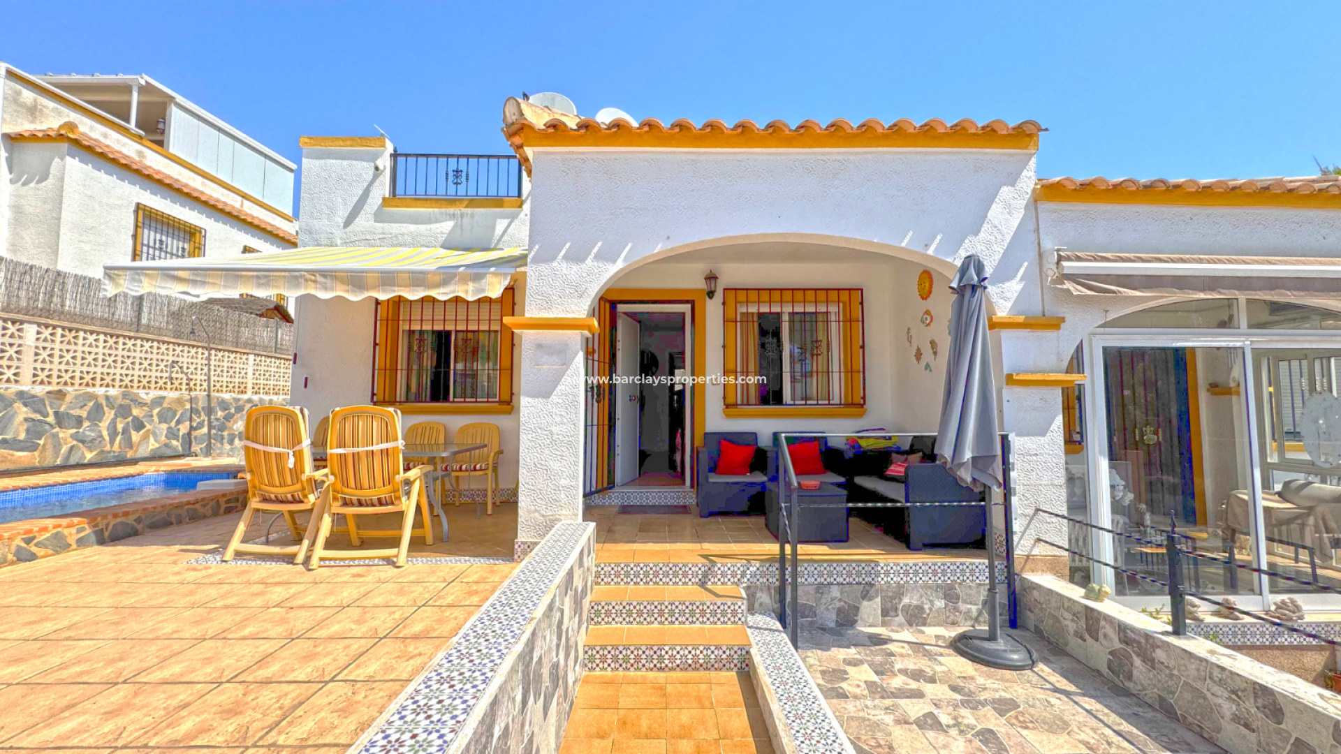 La propiedad cuenta con 3 dormitorios y 1 baño y ofrece privacidad, con muros altos que rodean el jardín delantero, donde encontramos la piscina privada.