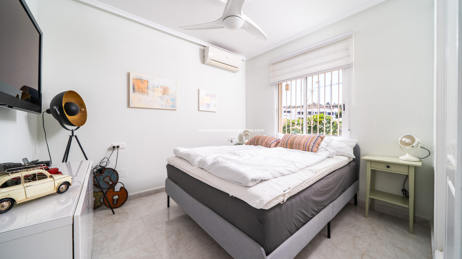 El dormitorio principal incluye un armario empotrado doble, ventilador de techo y aire acondicionado. El segundo dormitorio con almacenaje integrado y aire acondicionado también tiene puertas que dan directamente a la zona de la piscina. El baño cuenta con bañera de tamaño completo con ducha, inodoro, bidé y un moderno lavabo.
