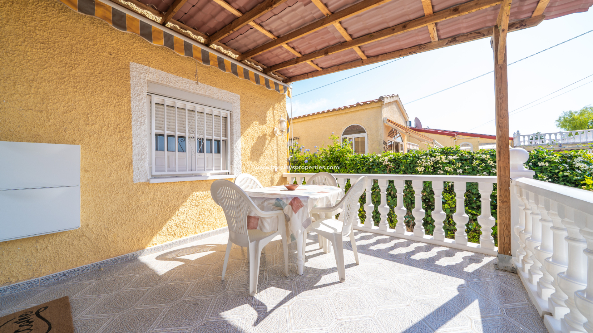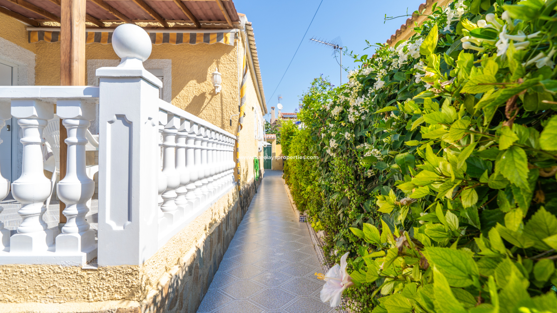 Este precioso chalet independiente, modelo Conchi, ha sido completamente reformado y se encuentra en una tranquila calle sin salida en la zona central de la Urbanización La Marina, a tan solo 5-10 minutos andando de todos los servicios, a cinco minutos en coche de la playa y a veinticinco minutos del Aeropuerto de Alicante-Elche.