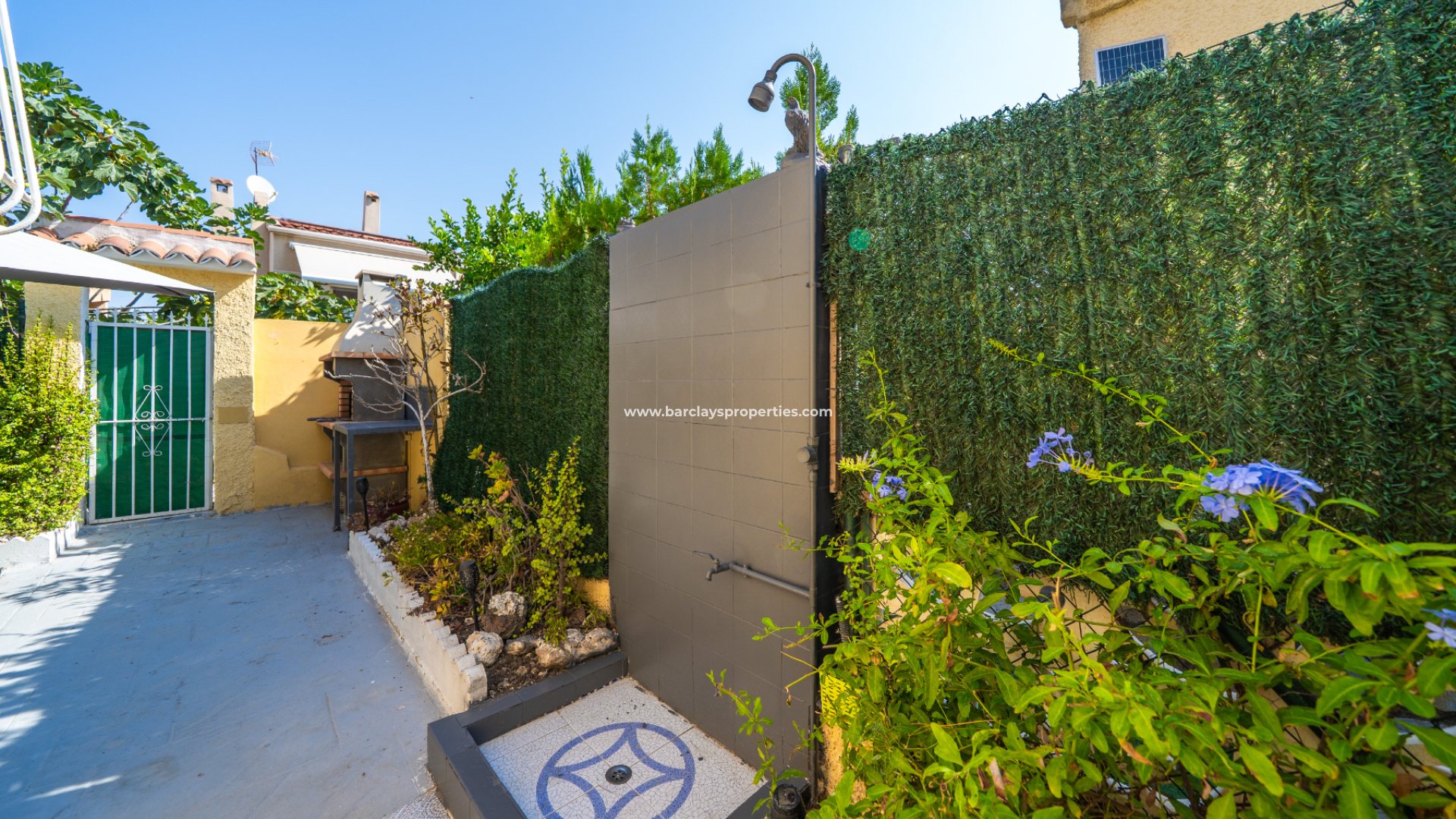 La villa se accede a través de una puerta peatonal y una puerta corredera para vehículos, con zona de aparcamiento y un garaje con puerta eléctrica. Una pérgola de madera sobre la terraza delantera crea una entrada acogedora. En la parte trasera, encontramos un trastero y una zona de barbacoa integrada para disfrutar del ocio al aire libre, además de una puerta trasera que da acceso a la zona verde. ✅ También existe espacio para construir una piscina privada.