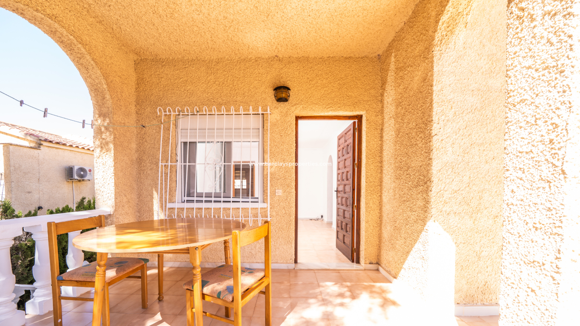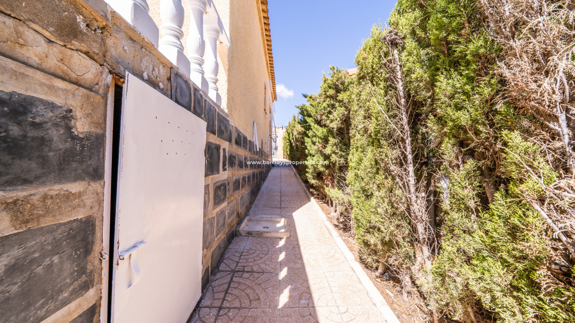 La propiedad dispone de una terraza trasera elevada y un porche cubierto con balaustradas. Esta zona no solo ofrece un lugar perfecto para sentarse y relajarse, sino que también incluye un práctico espacio de almacenamiento en la parte inferior. Desde la terraza se pueden disfrutar de vistas hacia Guardamar del Segura.