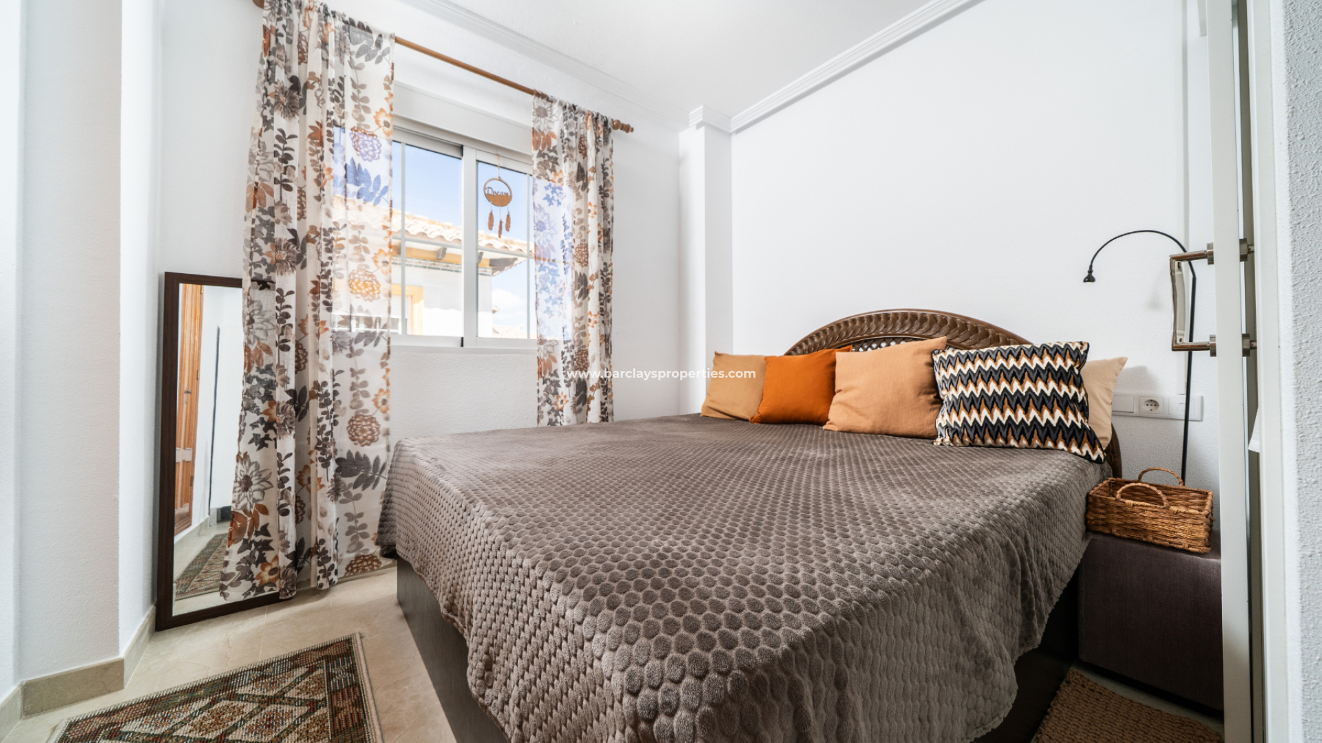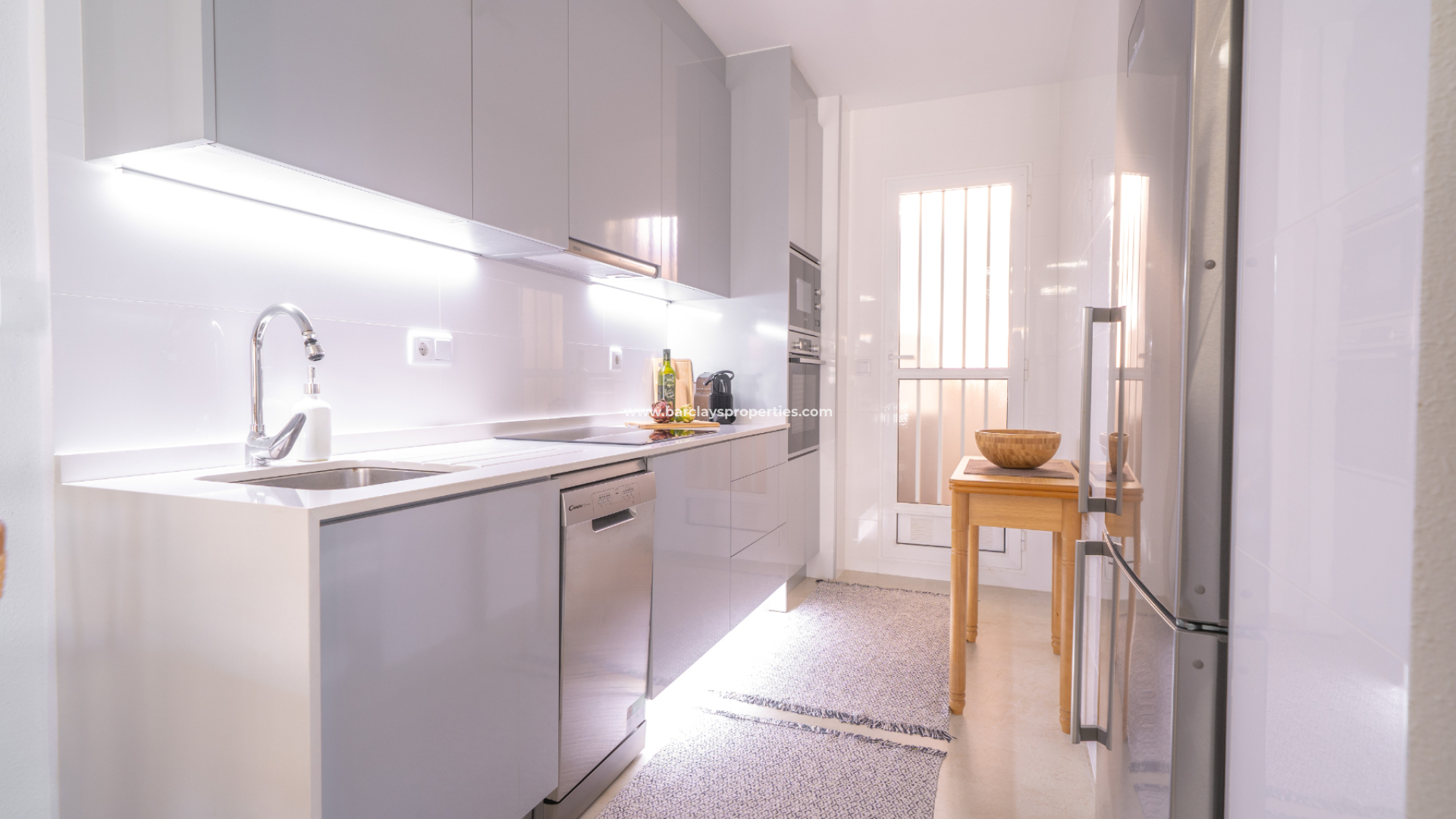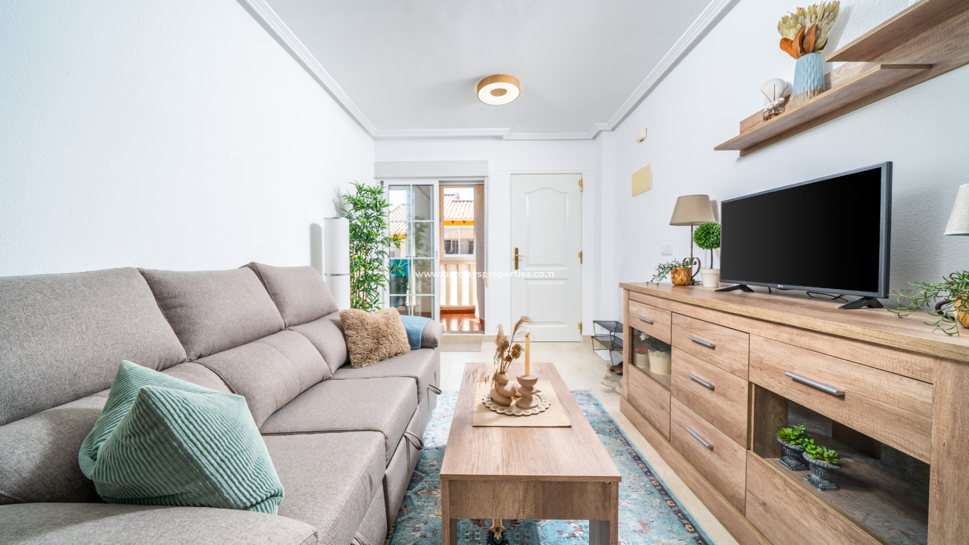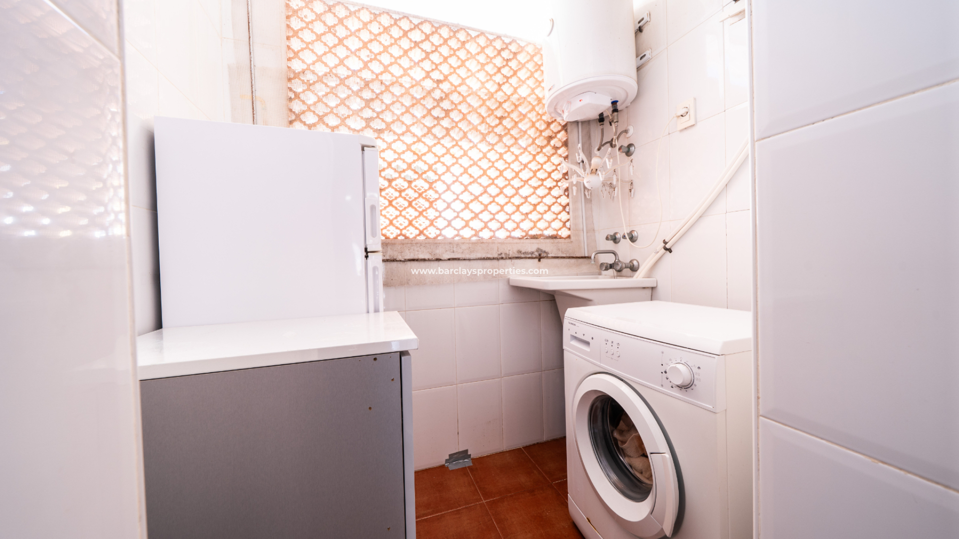 En el interior, el luminoso y acogedor salón con aire acondicionado y un área de comedor asignada se integra con una moderna cocina de planta abierta, totalmente eléctrica, con puerta de acceso a un lavadero independiente que proporciona espacio para la caldera y la lavadora. El dormitorio principal incluye armarios empotrados y un baño privado con ducha, tocador y wc. El segundo dormitorio es doble y hay un baño separado con ducha, tocador y wc.