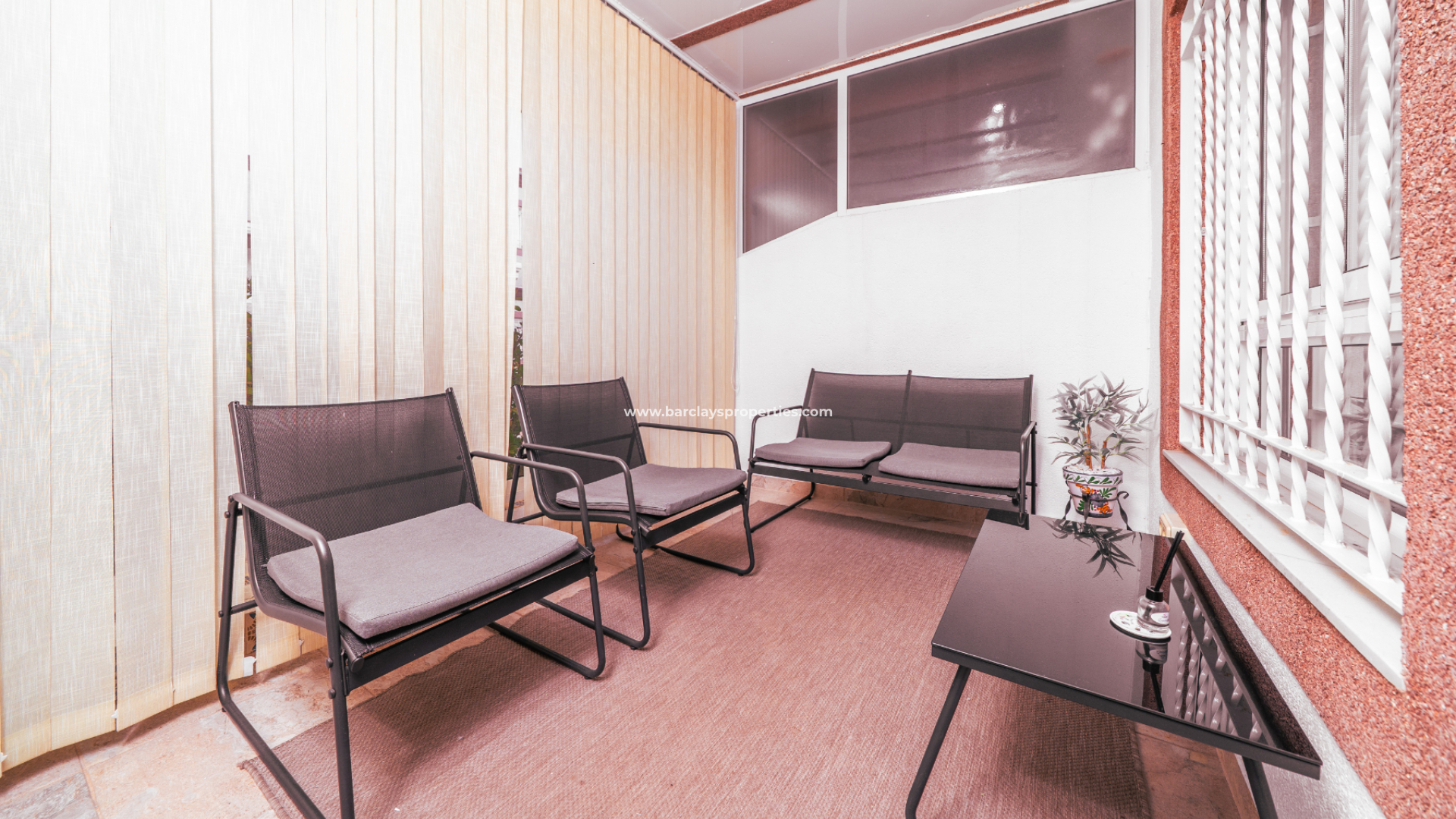 Esta atractiva casa con orientación suroeste cuenta con un porche frontal acristalado con una relajante zona de asientos que conduce a una espaciosa sala de estar equipada con aire acondicionado y ventilador de techo, y una cocina independiente totalmente equipada con acceso a un lavadero y trastero. Hay tres dormitorios, todos con armarios empotrados, ventiladores de techo y aire acondicionado. Dos de los dormitorios se encuentran en la planta baja junto con uno de los baños que cuenta con una bañera de tamaño completo. En el primer piso encontramos el tercer dormitorio, el principal, que tiene elegantes armarios empotrados con espejos. El baño en este nivel tiene una ducha a ras de suelo.