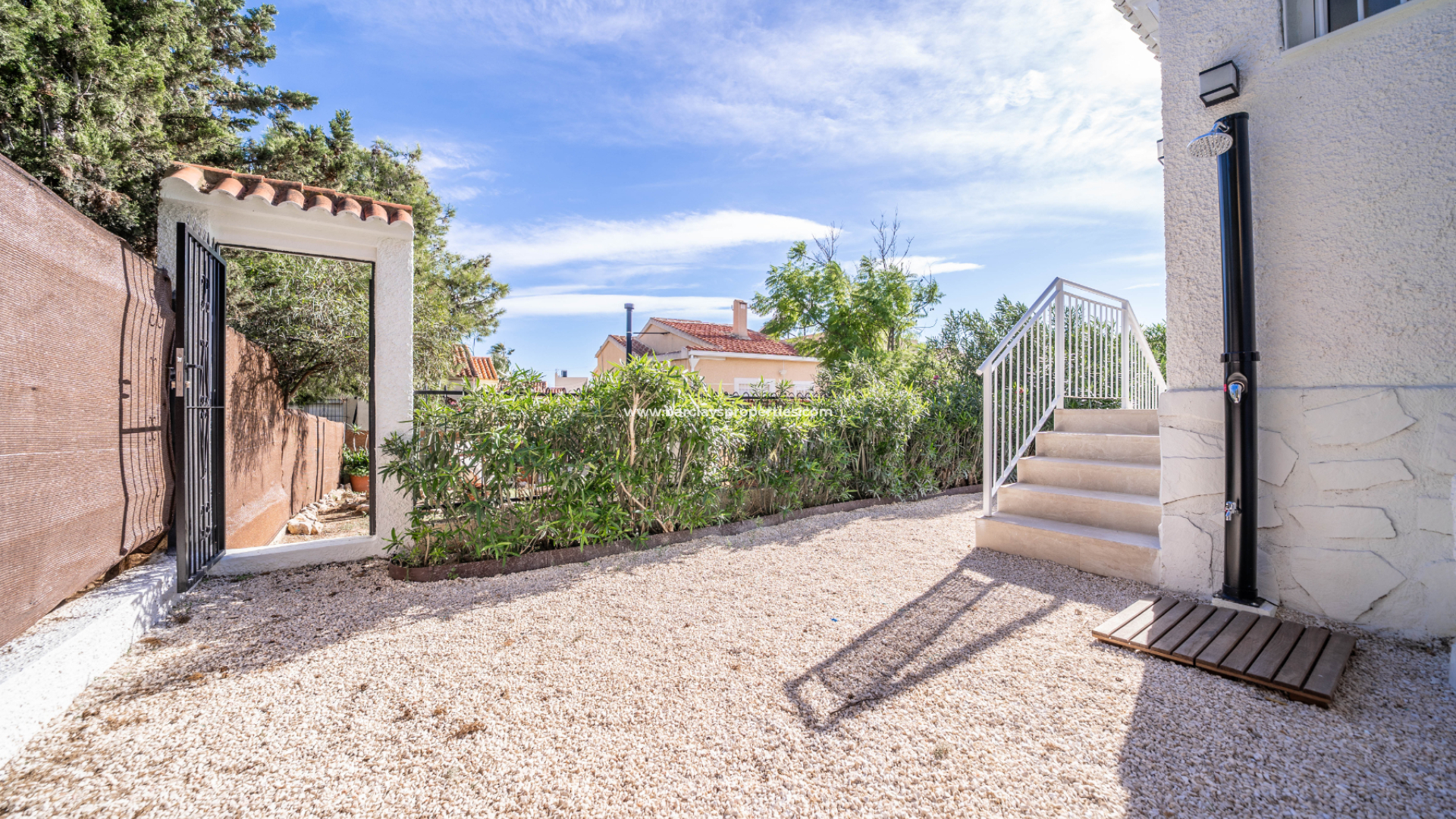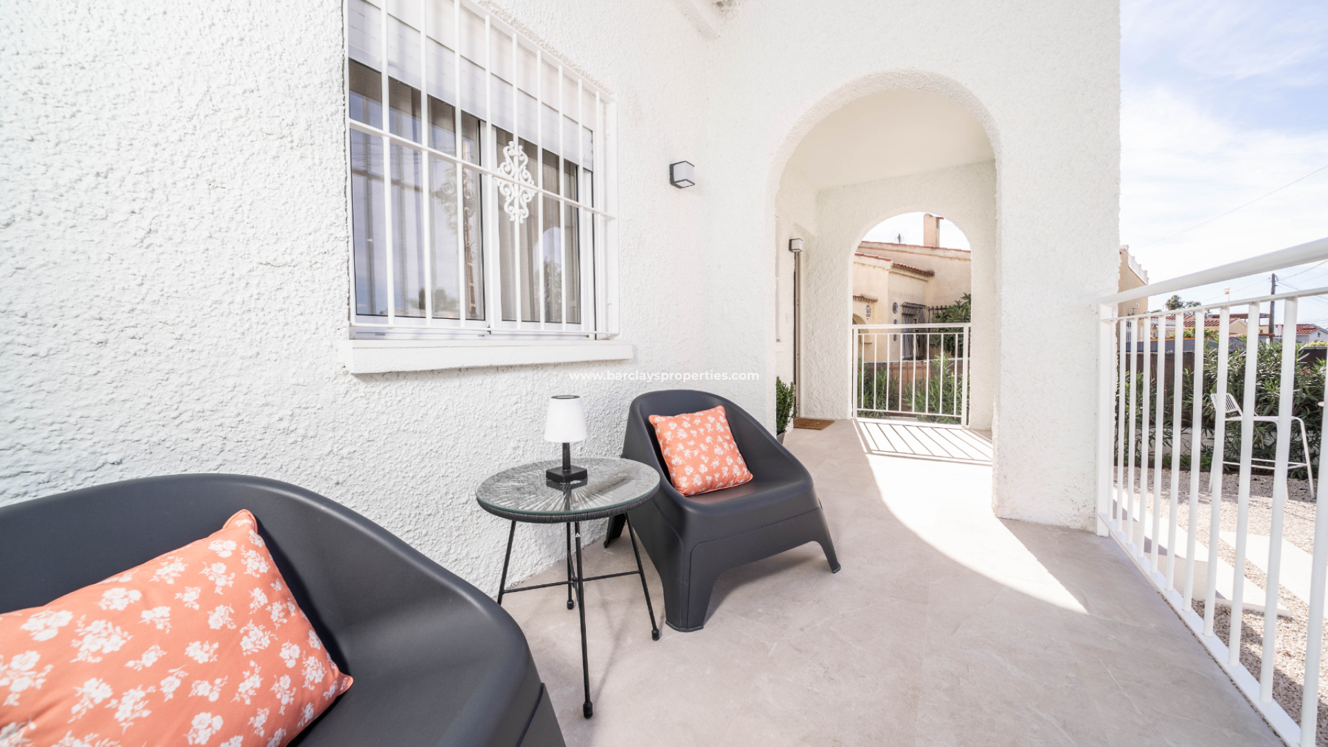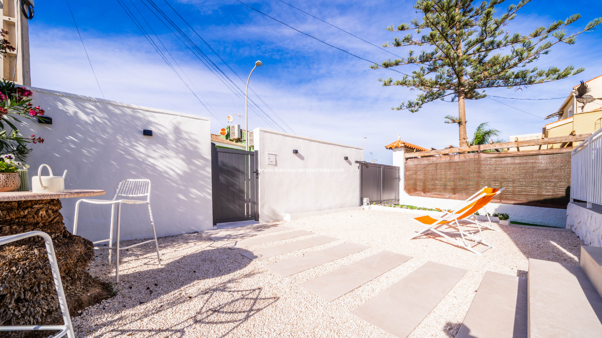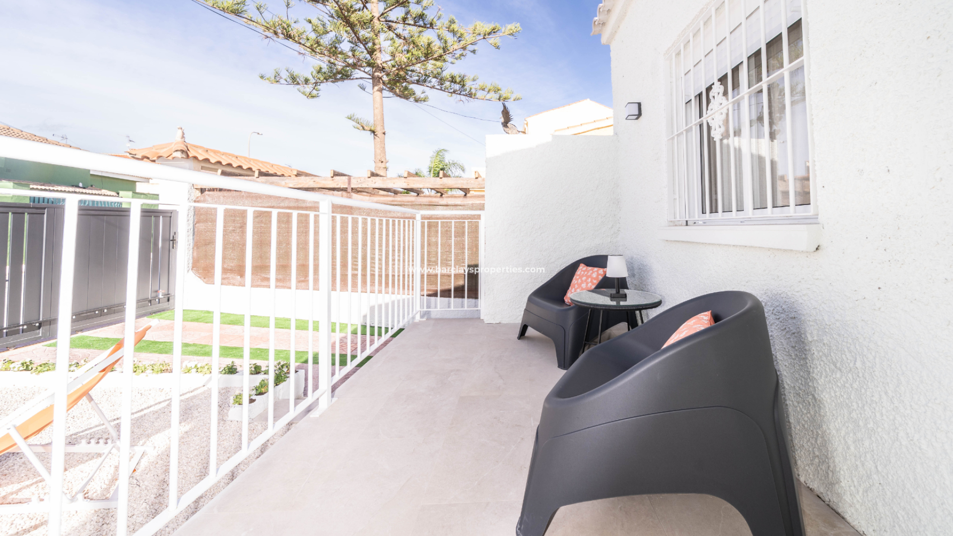 Esta encantadora villa unifamiliar de una sola planta, completamente reformada en la Urb La Marina, San Fulgencio, es una combinación perfecta de confort moderno y vida costera española. Cuenta con ➡️ 2 dormitorios y 1 baño dentro de una acogedora construcción de 63 m² en una generosa parcela de 253 m², se entrega ➡️completamente amueblada con electrodomésticos incluidos y dispone de aire acondicionado para disfrutar todo el año. El elegante interior presenta una luminosa sala de estar y comedor de planta abierta con atractivo suelo de madera, una moderna cocina independiente con azulejos de metro blancos, campana extractora negra y detalles en tono dorado, y un cuarto de servicio dedicado. En el exterior, encontrará una acogedora terraza delantera, un jardín de grava con toldo y una ➡️ agradable zona de comedor/barbacoa al aire libre, un cómodo aparcamiento cubierto con puerta eléctrica, y una excelente seguridad gracias a una puerta de seguridad reforzada y ventanas de doble acristalamiento. Situada a solo 2 minutos a pie del vecino y muy popular "Complejo Deportivo" con piscina exterior, trampolines y minigolf, así como a 3 km de la playa, ➡️ a 500 metros de los servicios, y ofreciendo un gran potencial de alquiler, esta propiedad en una zona tranquila pero cerca de todo es una excelente oportunidad de inversión.