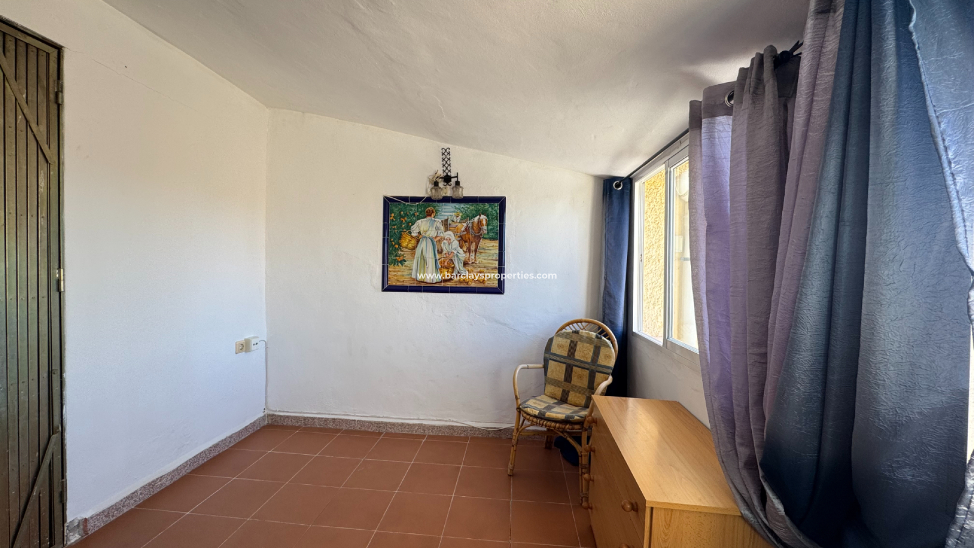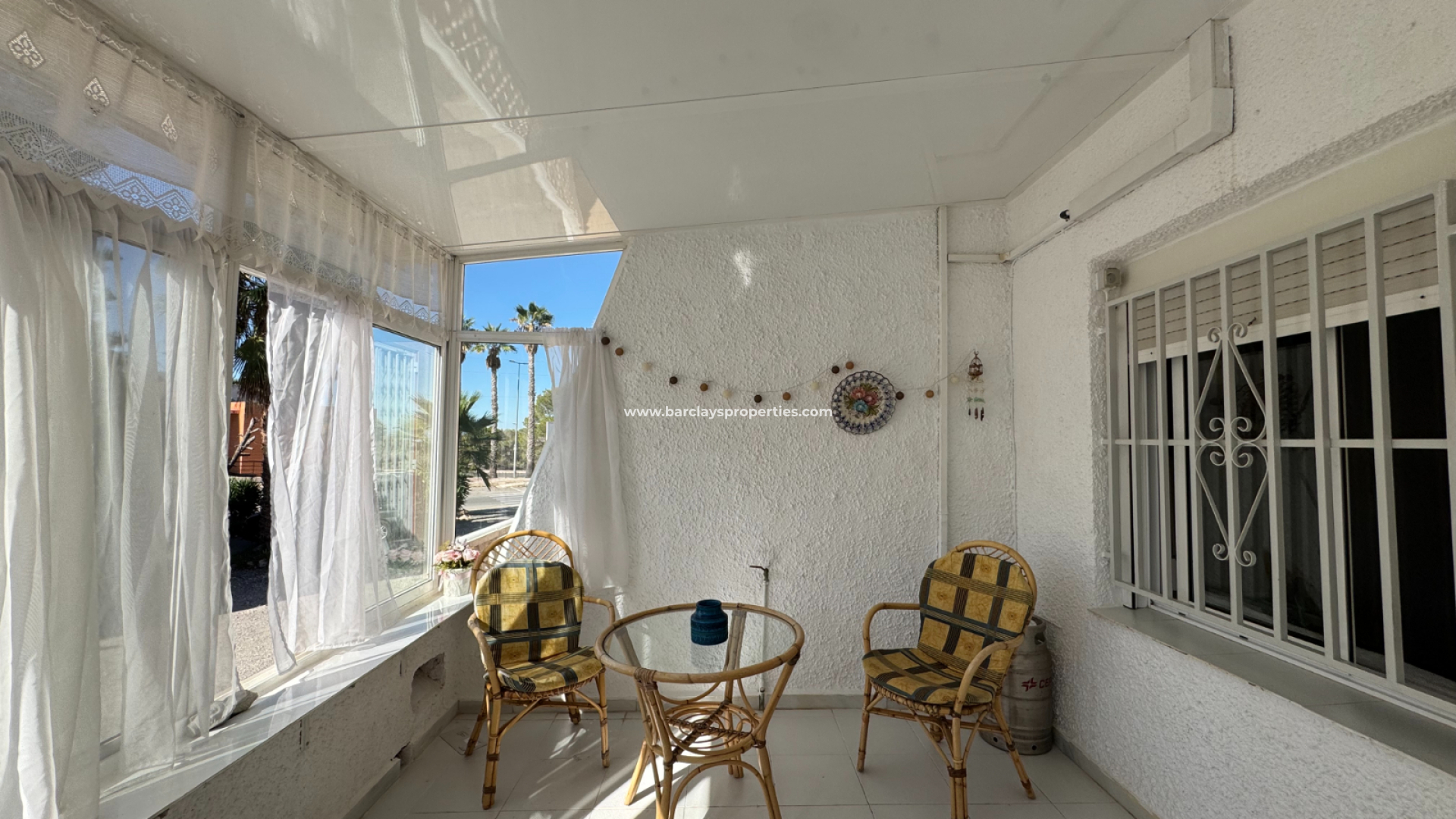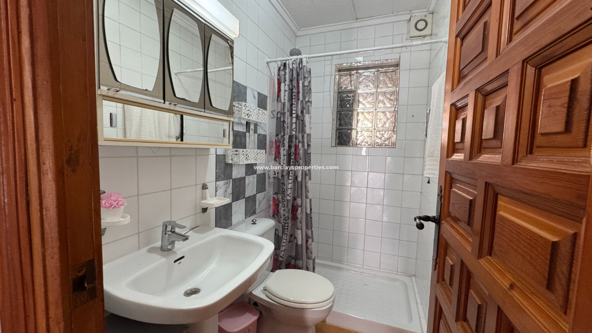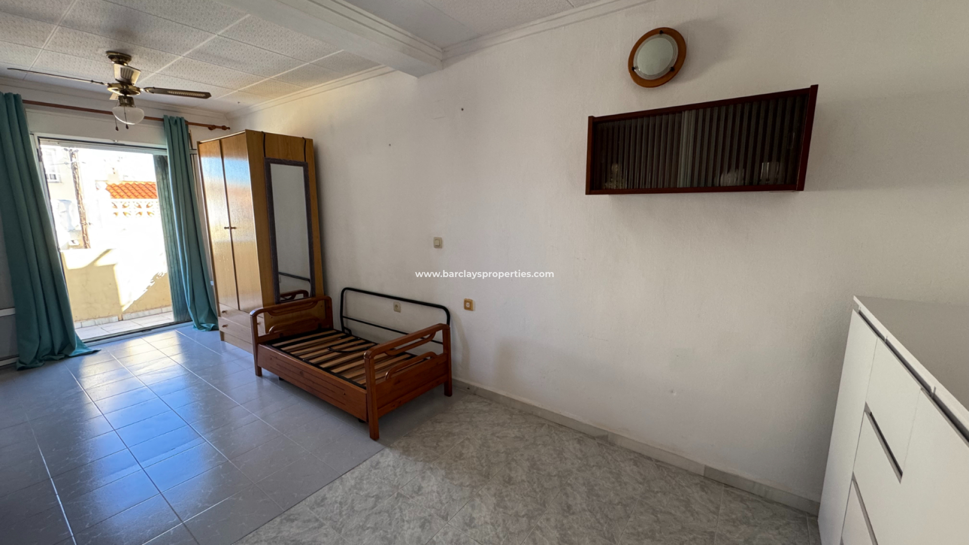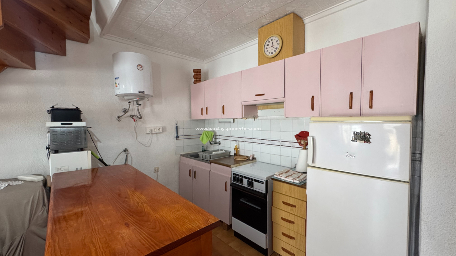 La propiedad cuenta con una terraza acristalada que conduce a una luminosa sala de estar y comedor con aire acondicionado. La cocina americana incluye una cocina de gas y un calentador eléctrico recientemente instalado. El baño de la planta baja está equipado con una ducha a ras de suelo, inodoro y lavabo. El dormitorio ampliado en este nivel incluye ventilador de techo y armario empotrado.