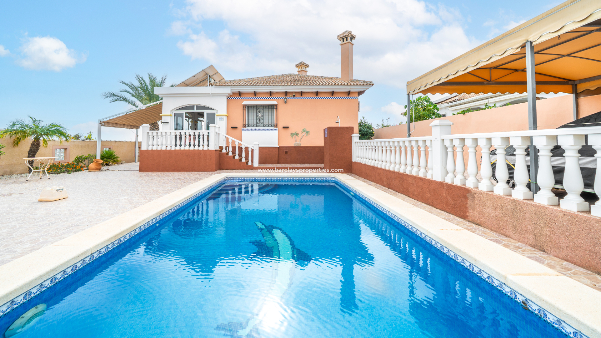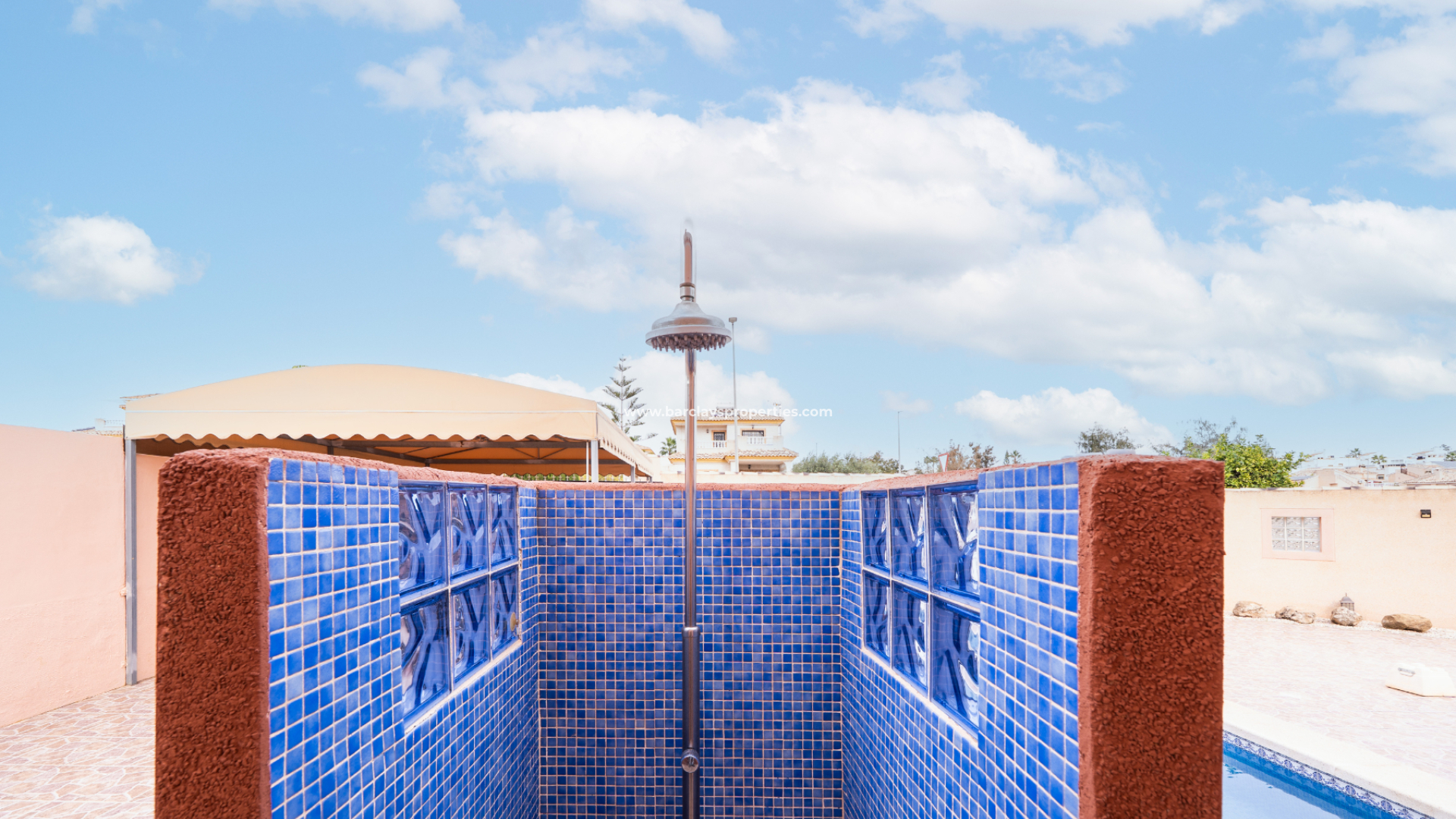La propiedad cuenta con una piscina privada de agua salada termo-calentada con bomba y manguera, complementada con toldos laterales, una ducha exterior, iluminación LED, una pérgola de madera y un cobertizo de plástico para almacenamiento. También dispone de un aparcamiento cubierto para la protección del vehículo durante todo el año.
