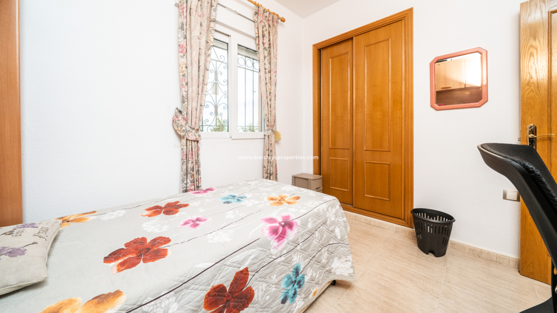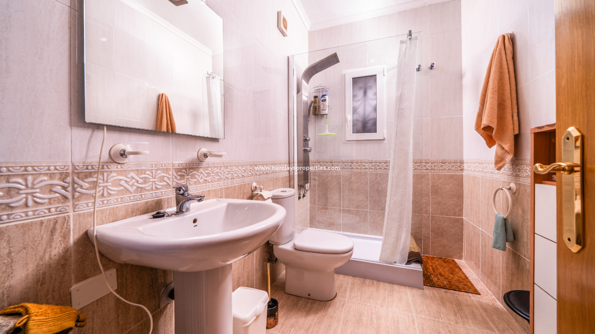 La vivienda dispone de tres dormitorios y dos baños. El primer dormitorio es doble y cuenta con armarios empotrados y ventilador de techo. El segundo dormitorio, actualmente utilizado como despacho, también incluye armarios empotrados y ventilador de techo. El dormitorio principal dispone de armarios empotrados, aire acondicionado, ventilador de techo y un baño en suite con ducha, WC y mueble de lavabo. El baño principal ofrece ducha, WC, mueble de lavabo y extractor.