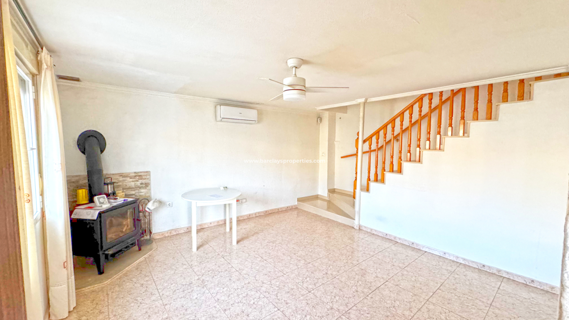 Esta propiedad adosada ampliada en La Marina ofrece unos impresionantes 120m² de espacio construido distribuidos en dos plantas, proporcionando tres cómodos dormitorios y dos baños bien equipados. El interior cuenta con una acogedora cocina de planta abierta y está equipado con comodidades modernas como aire acondicionado, ventanas de doble acristalamiento y una acogedora estufa de leña para las noches más frescas. La practicidad se ve mejorada por un trastero dedicado y la instalación de paneles solares, promoviendo la eficiencia energética. Exteriormente, la propiedad cuenta con un solárium en la azotea, perfecto para tomar el sol y disfrutar de las hermosas vistas de los alrededores. Situada en un entorno tranquilo pero muy conveniente, esta casa está a solo 400 metros de los servicios locales, a 3 km de la playa, a 25 km del aeropuerto y a 10 km del campo de golf más cercano, lo que la convierte en una propiedad con gran potencial de alquiler.