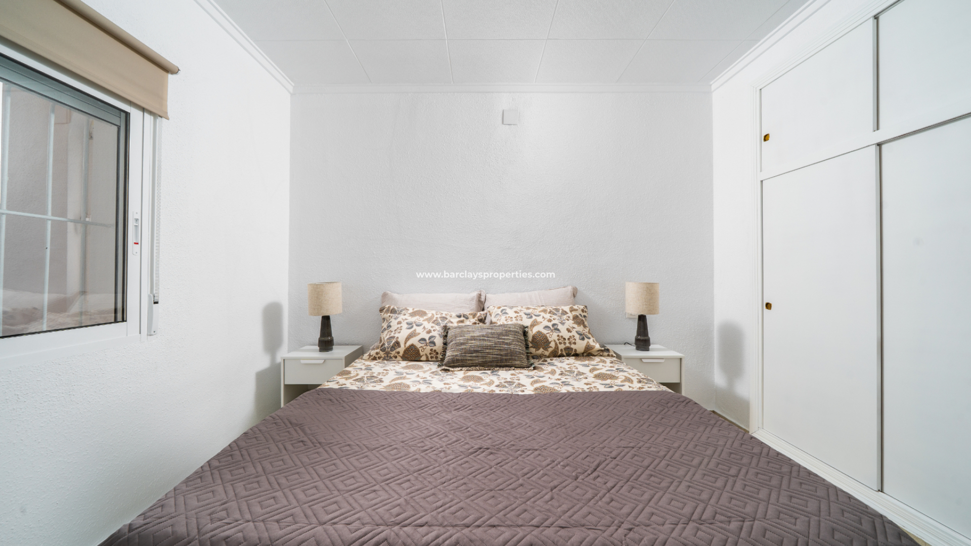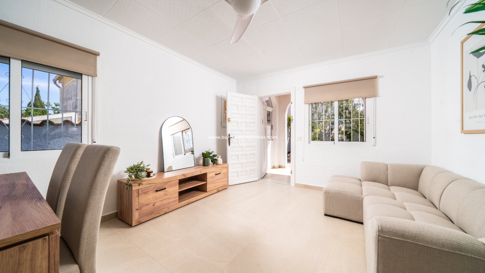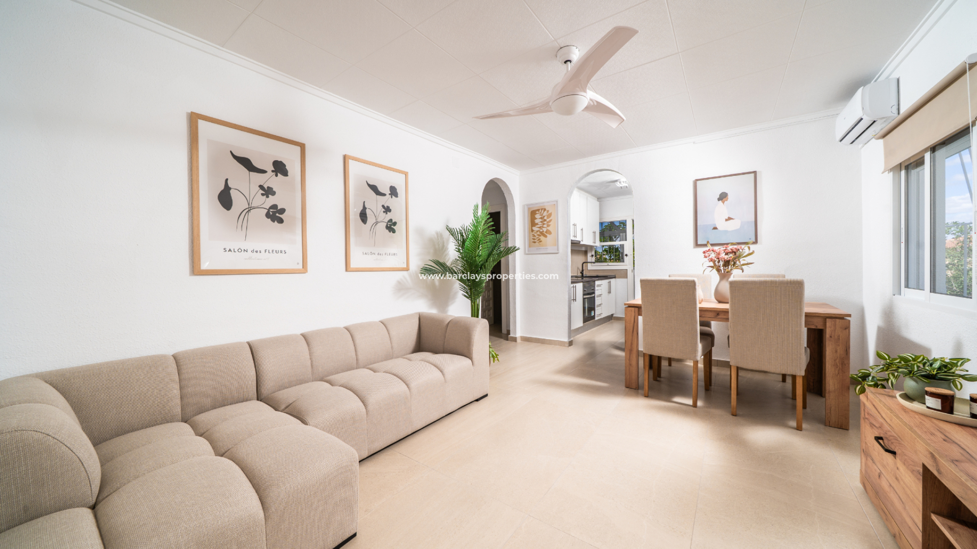 En la parte delantera de la propiedad, el porche cubierto con orientación este conduce a una terraza acristalada con vistas al jardín delantero. La vivienda presenta un salón luminoso de aspecto natural, equipado con aire acondicionado y ventilador de techo para garantizar el confort durante todo el año. La cocina independiente equipada da paso a la galería, que ofrece vistas a la zona verde. Dispone de dos dormitorios bien proporcionados con armarios empotrados y un baño moderno recientemente renovado.