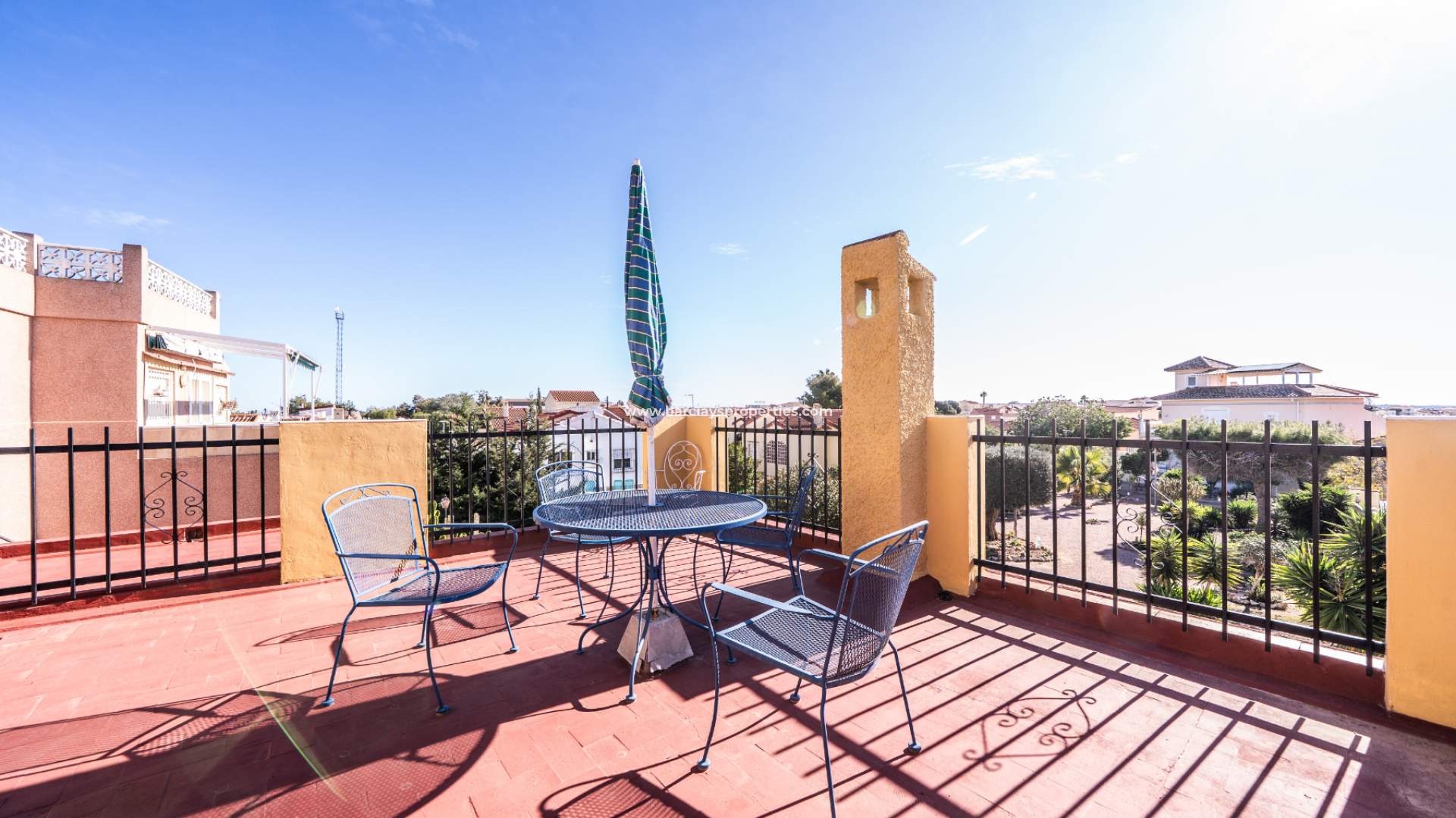 El exterior cuenta con jardines alicatados de bajo mantenimiento, aparcamiento privado con carport, trastero exterior y toldos para disfrutar de zonas exteriores a la sombra. Los paneles solares ayudan a reducir los costes de funcionamiento, mientras que los muros altos y la puerta eléctrica proporcionan privacidad. Las vistas al campo y a la montaña completan el entorno, todo ello dentro de la popular Urbanización La Marina, ideal para vivir todo el año, vacaciones o inversión para alquiler.