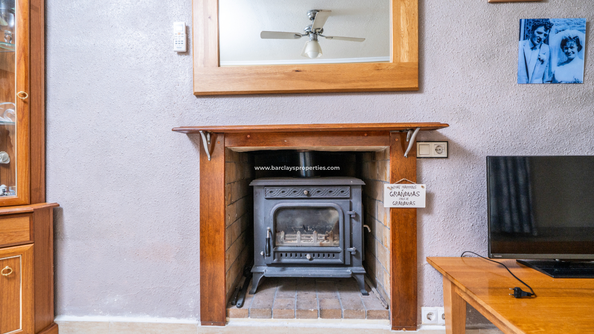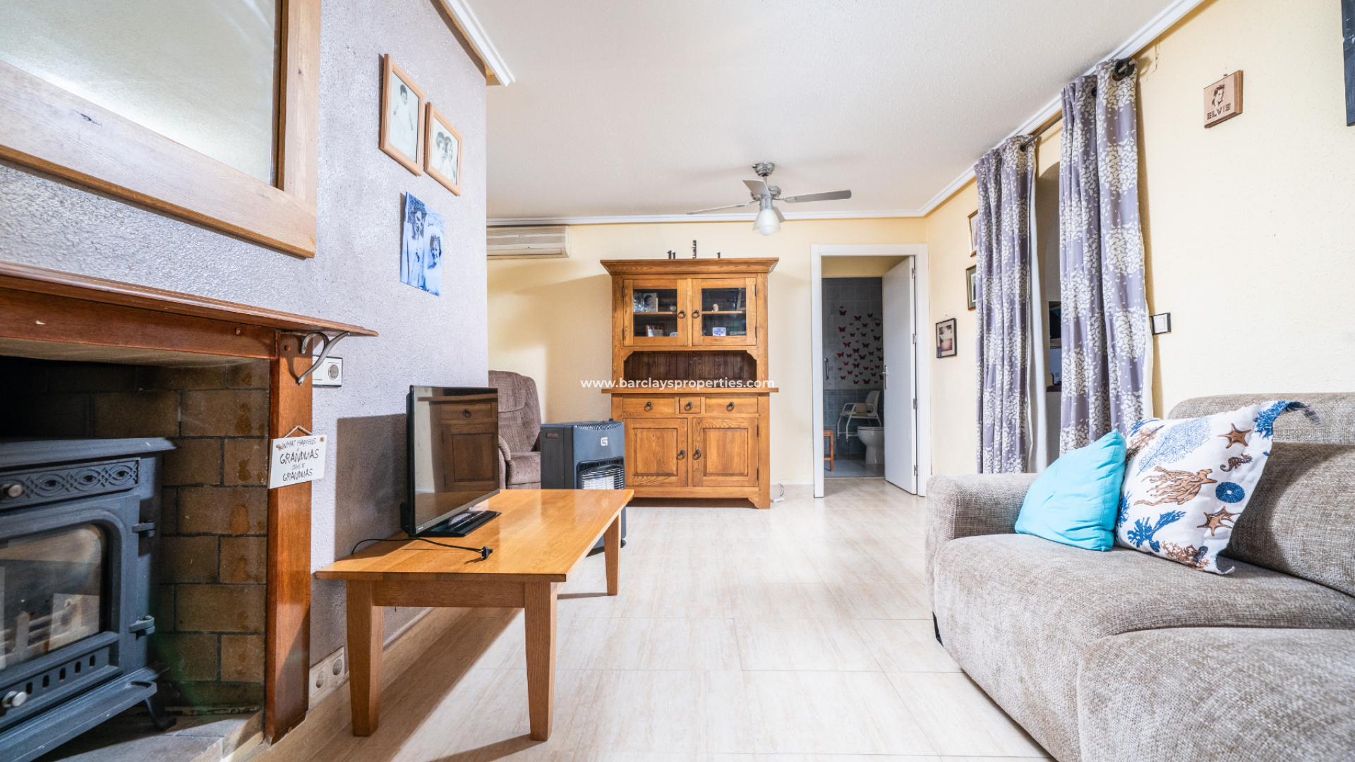 En el interior, la cocina-comedor de concepto abierto es luminosa y funcional, con una cocina amplia equipada con cocina de gas, focos empotrados y ventilador de techo, creando un espacio práctico para la vida diaria. El salón es acogedor, con chimenea de leña y ventilador de techo, ideal para el confort durante todo el año.