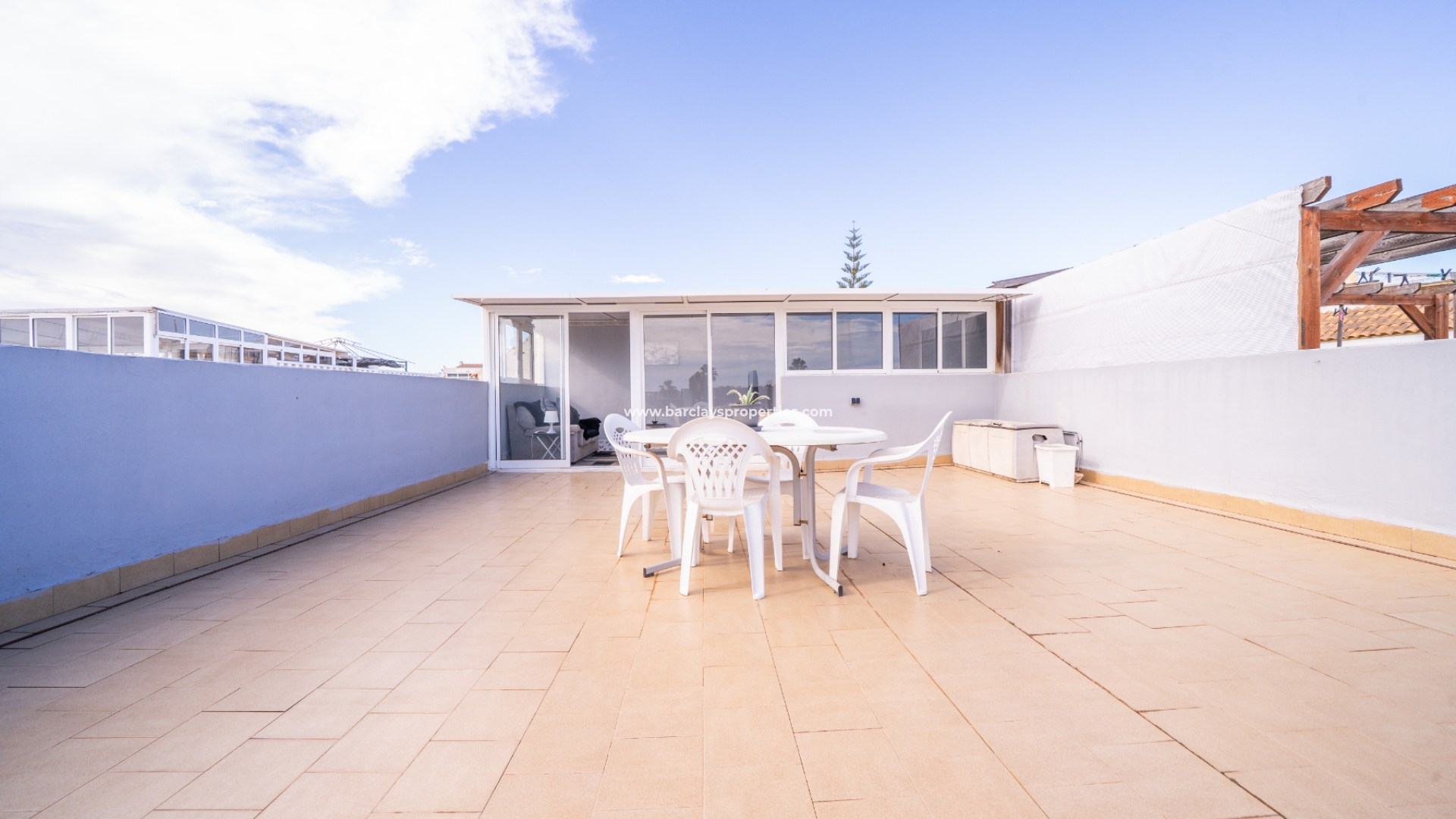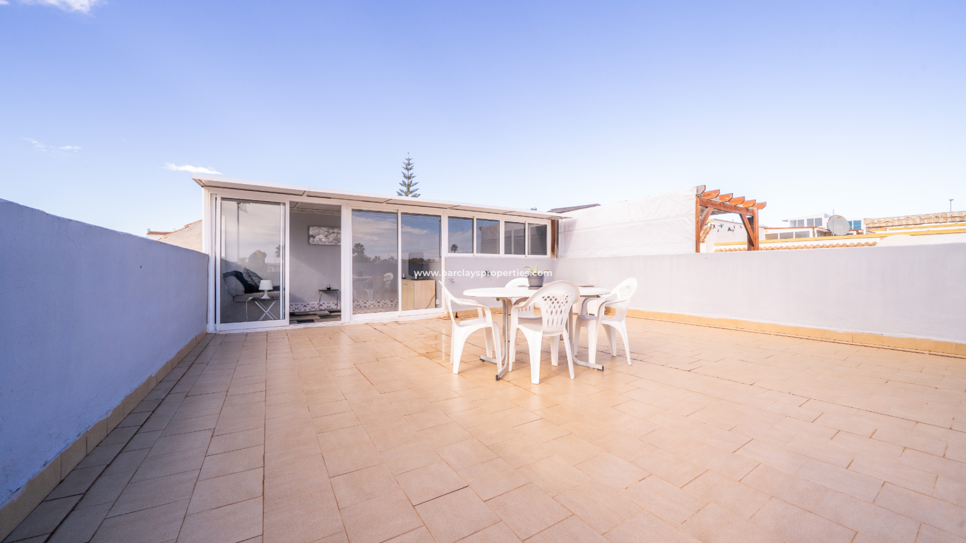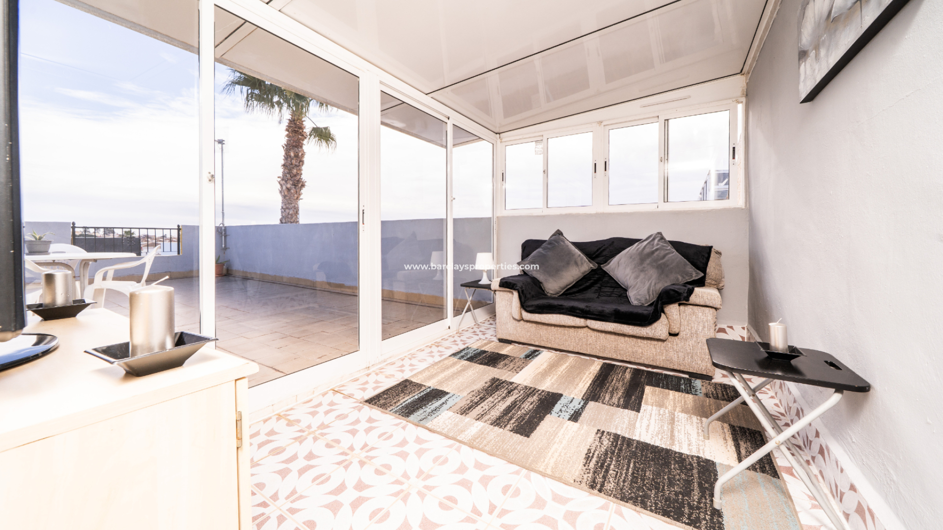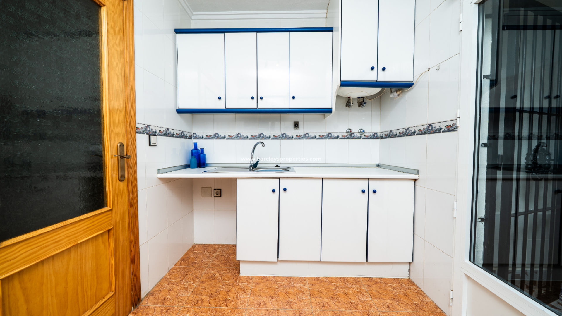 La cocina equipada es totalmente eléctrica y conduce al patio interior / zona de lavandería. Subimos las escaleras para encontrar un jardín de invierno (acristalamiento) y un amplio solárium con vistas despejadas sobre el campo hacia Guardamar y el mar.