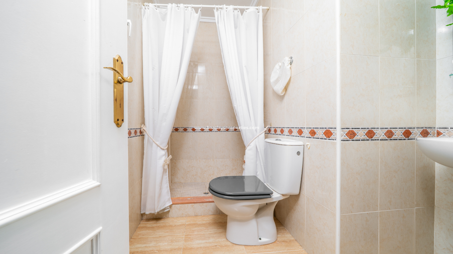 Cuenta con tres dormitorios dobles, todos con armarios empotrados y aire acondicionado, incluyendo un generoso dormitorio principal. La casa también dispone de dos baños, uno con bañera completa y toallero eléctrico, y el segundo con ducha a ras de suelo.