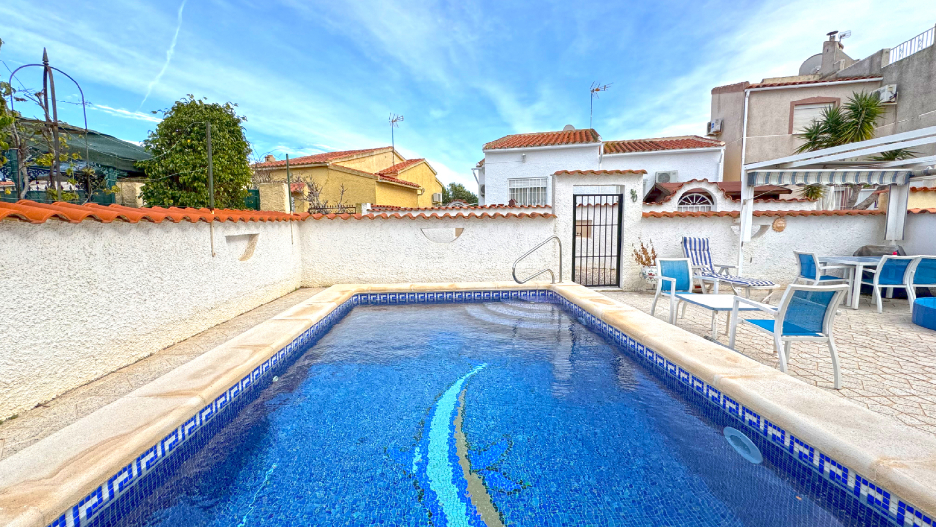En el interior, la vivienda dispone de un luminoso diseño de concepto abierto que integra el salón, el comedor y la cocina, creando un espacio amplio, moderno y acogedor. La villa ofrece tres dormitorios de buen tamaño y dos baños, uno de ellos en suite, proporcionando comodidad y funcionalidad. Además, dispone de aire acondicionado para garantizar el confort en cualquier estación.