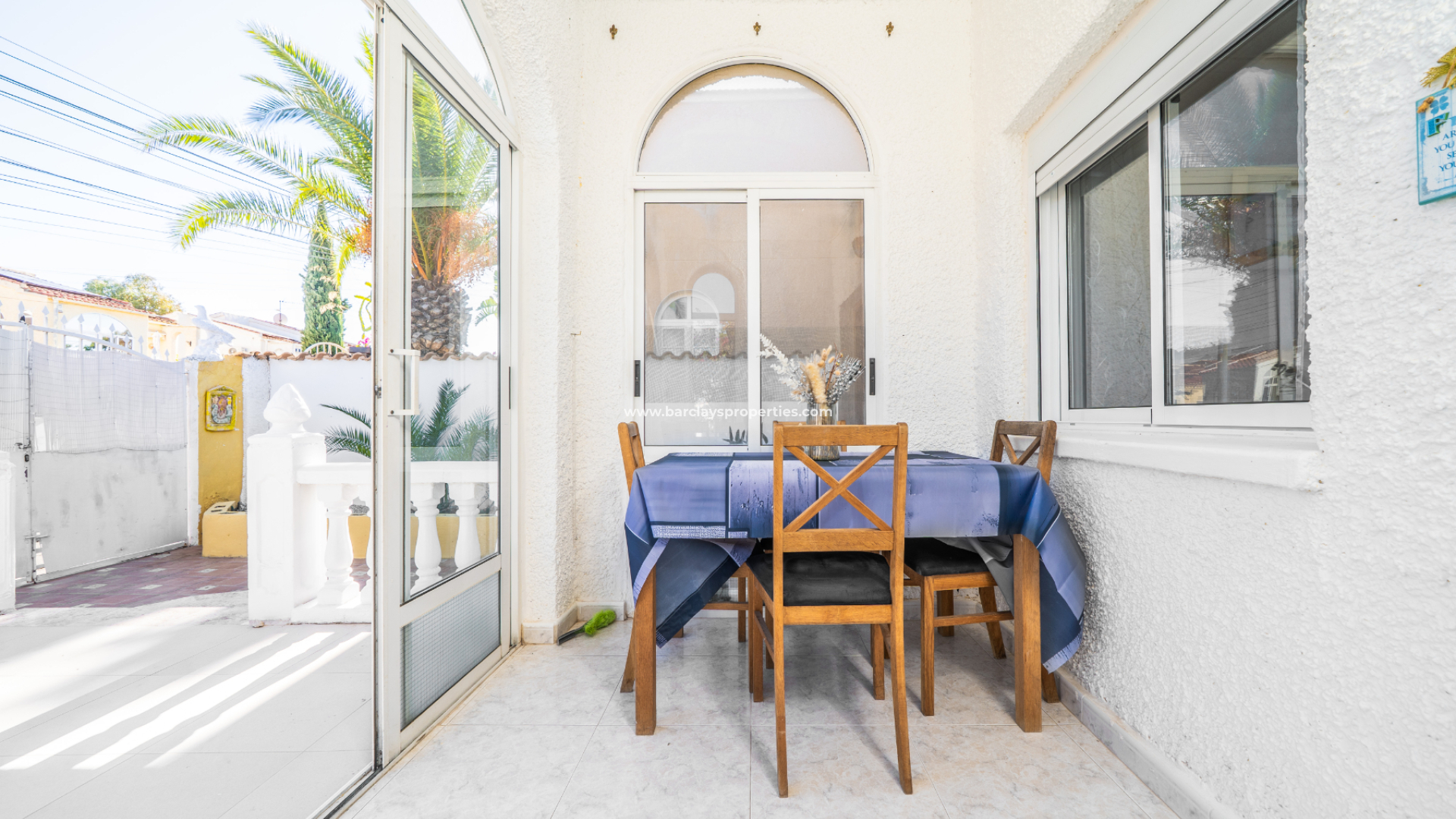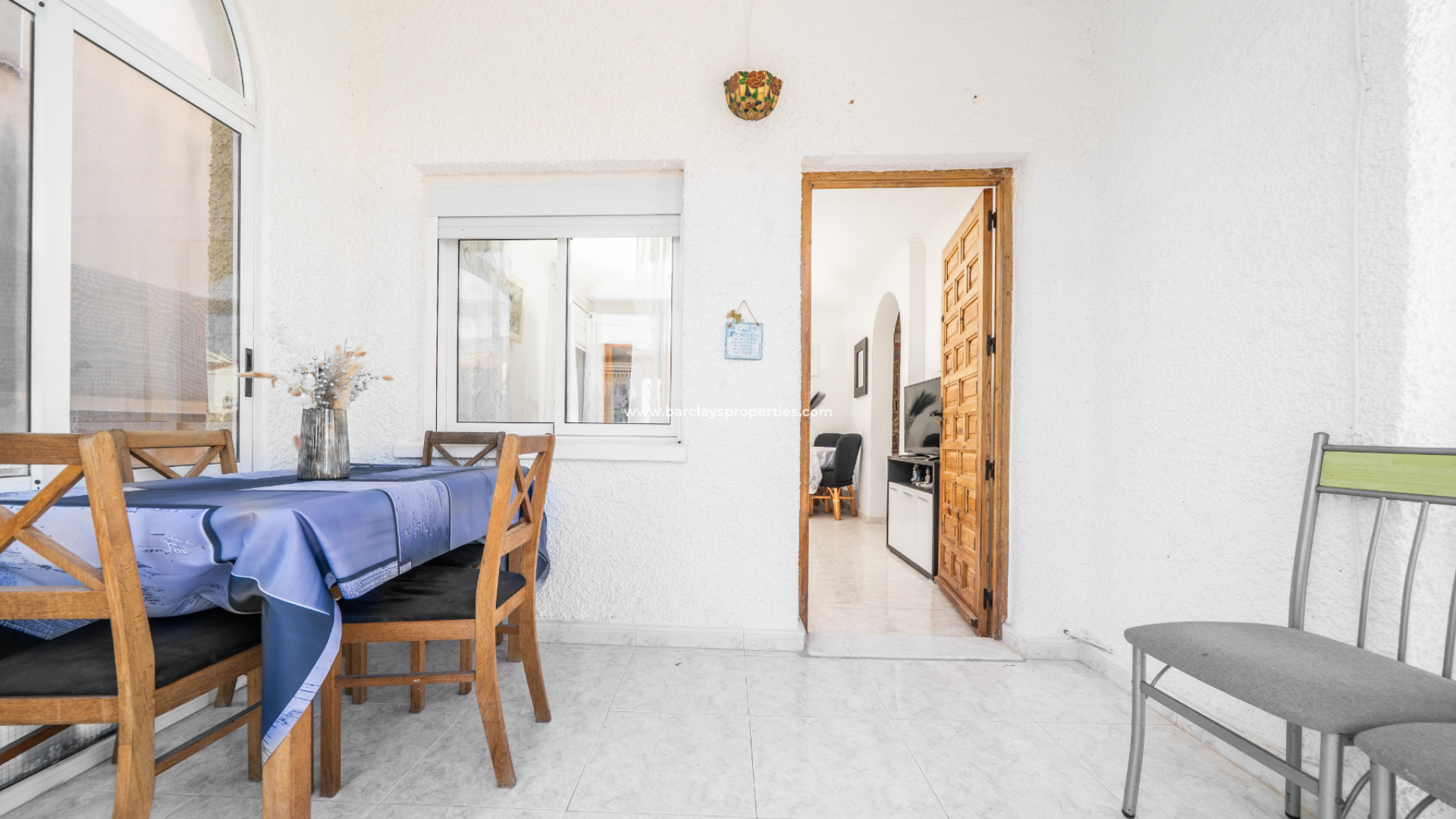 La propiedad le recibe con una generosa terraza delantera para tomar el sol, acentuada por elegantes balaustradas y accesible desde múltiples puntos. Este espacio exterior da paso a un luminoso porche acristalado, actualmente utilizado como comedor, que sirve de entrada al interior de la vivienda.