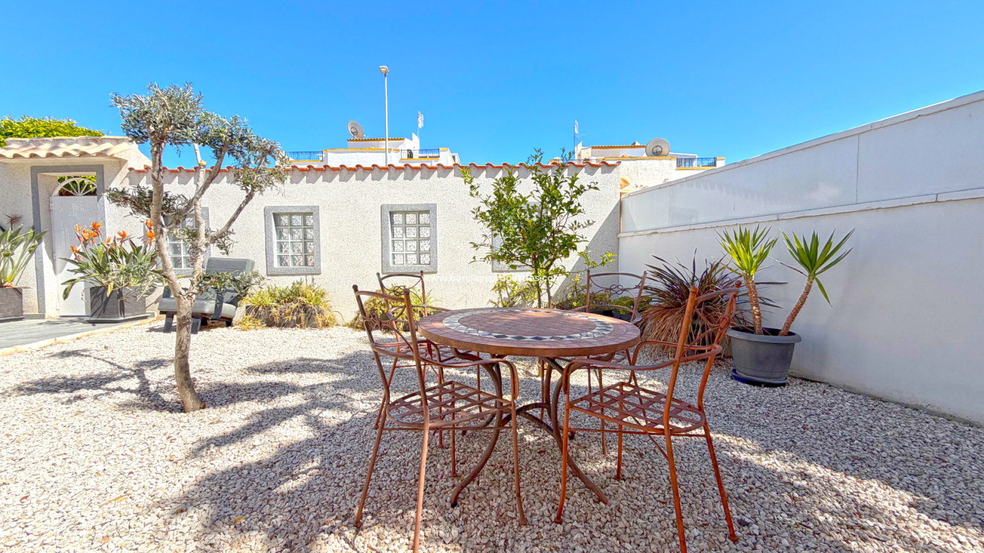 La vivienda se vende completamente amueblada y está equipada con aire acondicionado y ventanas de doble acristalamiento, garantizando confort durante todo el año. El luminoso interior conecta perfectamente con la zona exterior, donde se encuentra una piscina privada, ideal para relajarse bajo el sol mediterráneo o disfrutar con invitados.