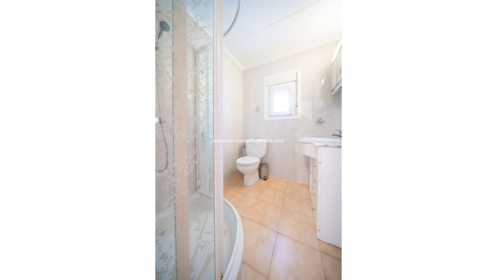 La villa dispone de tres dormitorios dobles bien proporcionados, todos equipados con ventiladores de techo, aire acondicionado y armarios empotrados. El dormitorio principal es particularmente espacioso y cuenta con un gran armario empotrado, además de un baño privado en suite con ducha de esquina, inodoro y mueble lavabo. Los otros dos dormitorios dobles cuentan con un moderno baño familiar con ducha a ras de suelo, inodoro, mueble lavabo y un práctico almacenamiento.
