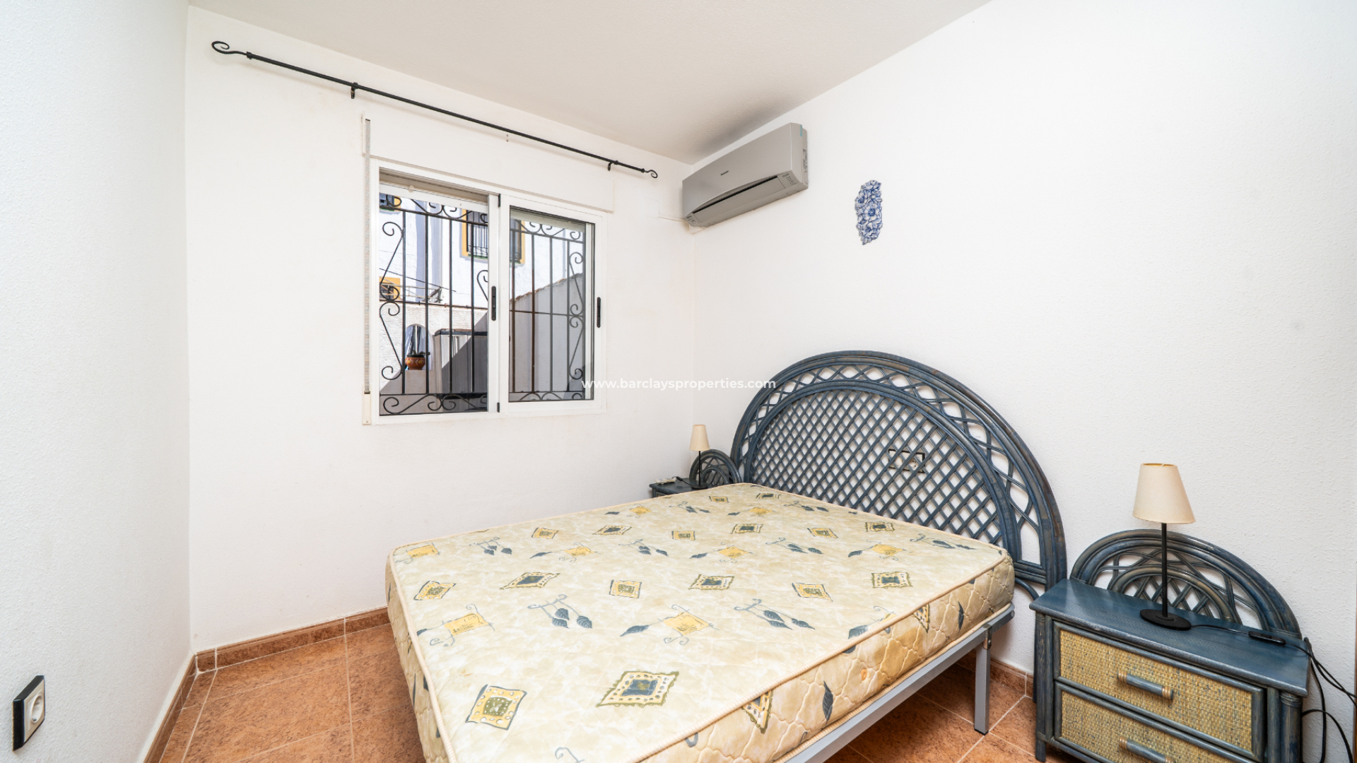 La propiedad ofrece tres dormitorios. El dormitorio principal incluye aire acondicionado y un armario empotrado, así como puertas correderas que dan a un balcón privado. El segundo dormitorio es una habitación con dos camas individuales con armario empotrado, aire acondicionado y ventilador de techo. El tercer dormitorio es doble, también con armario empotrado y aire acondicionado.