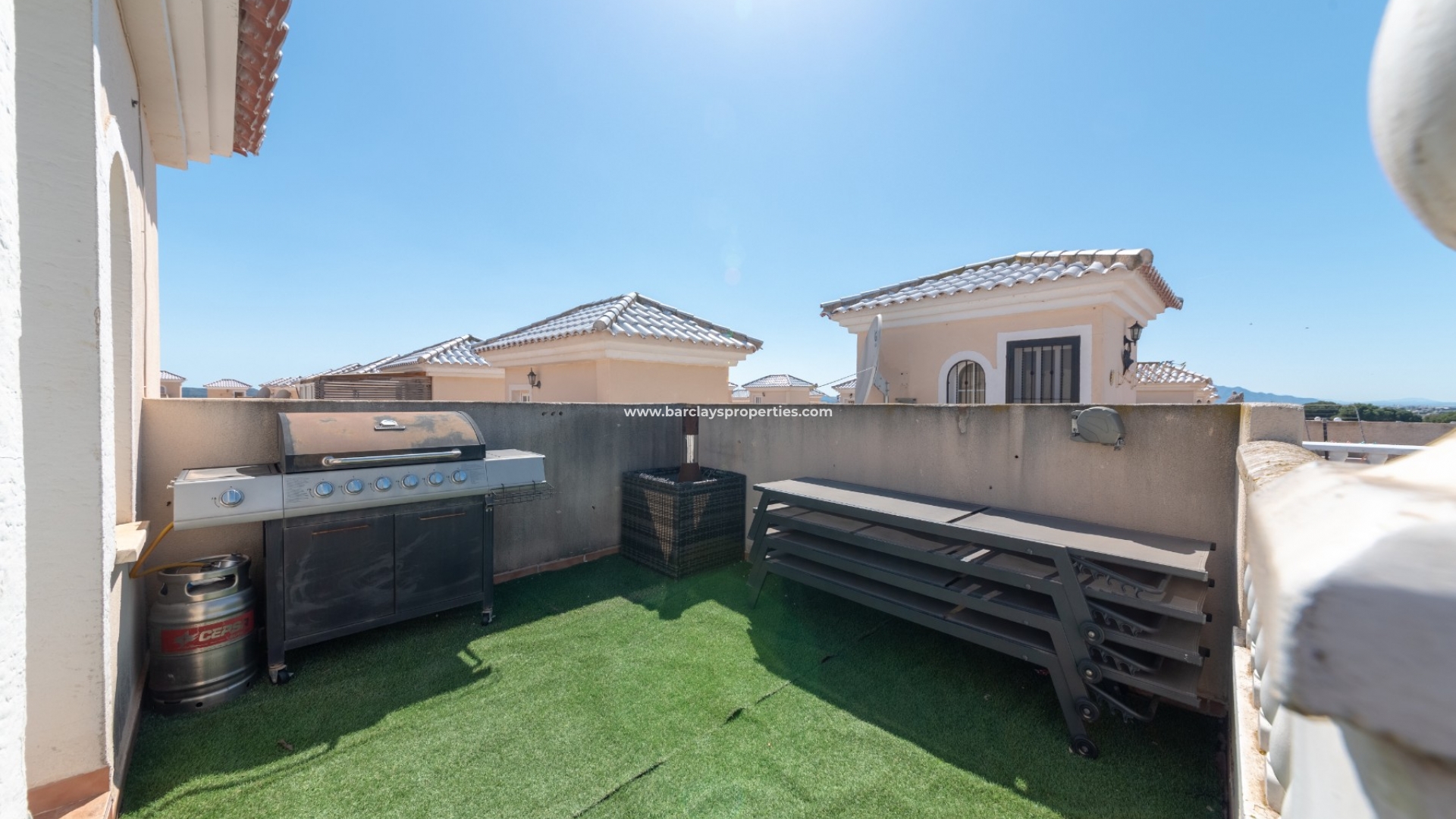 Las escaleras conducen a la primera planta, donde encontramos un dormitorio doble con armarios de espejo y su propio acceso a una terraza privada con zona de estar exterior e impresionantes vistas a la montaña. Un cuarto de baño completo con bañera de tamaño completo y bidé y un tercer dormitorio doble se encuentran en este nivel, el dormitorio tiene su propia terraza privada con zona de estar exterior y hermosas vistas. Las escaleras conducen al nivel superior de la propiedad y el amplio solarium con zona para tomar el sol y zona de barbacoa con suelo de césped artificial.
