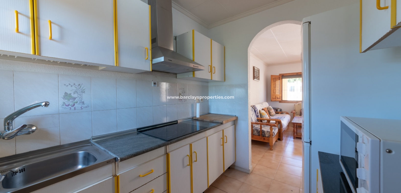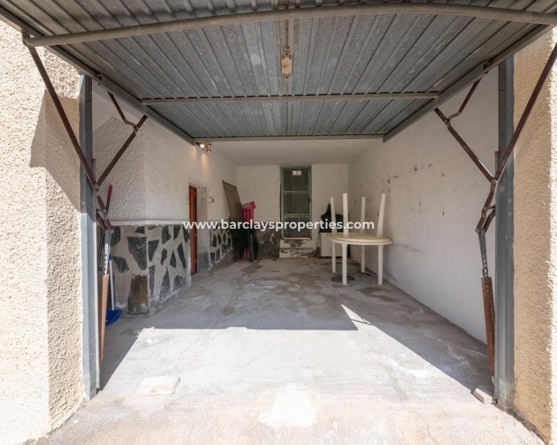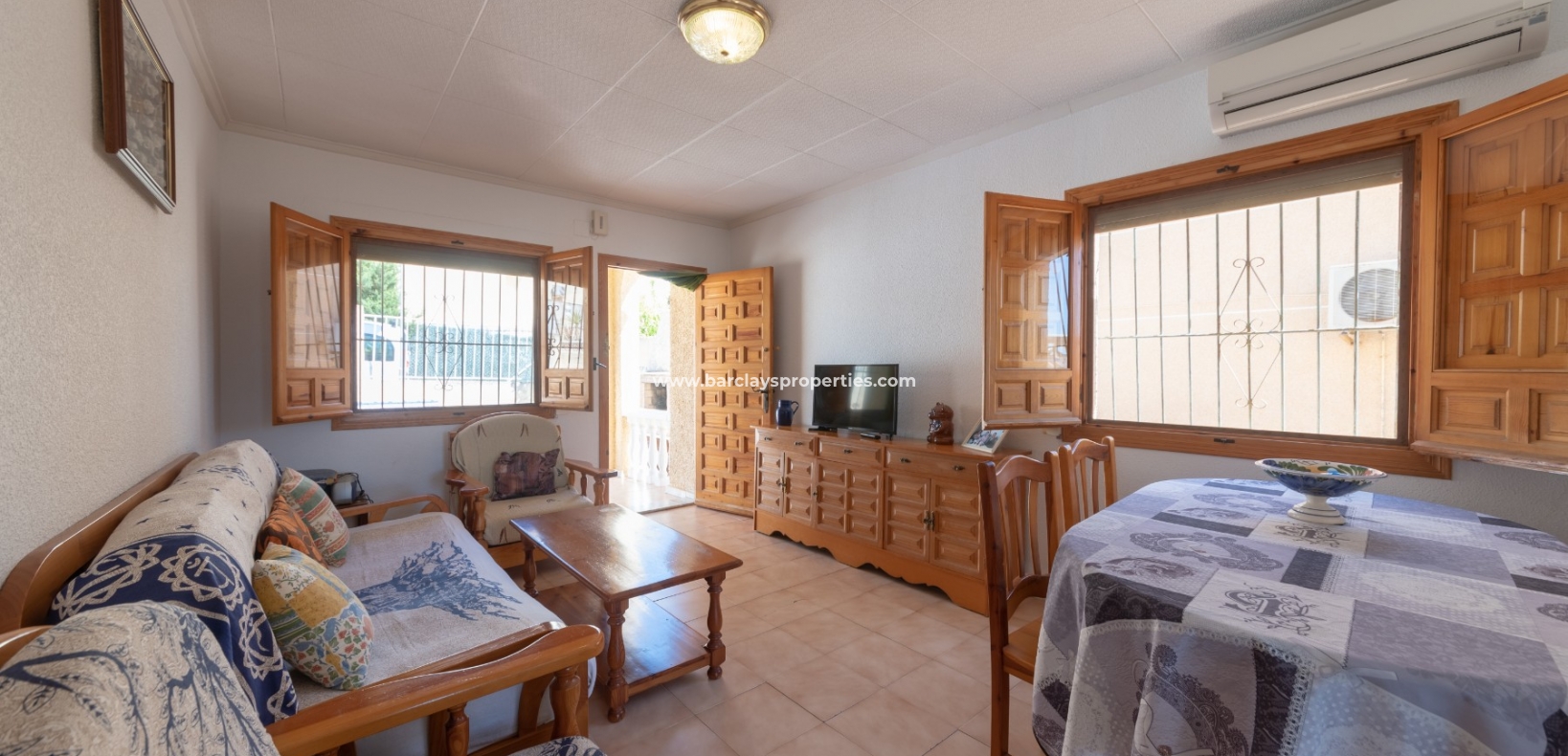 Esta propiedad incluye dos entradas, una a través de la puerta doble que conduce a un garaje privado que está en la parte trasera de la casa o la puerta peatonal que se encuentra en la parte delantera de la villa. Hay una gran barbacoa de obra y una bonita zona de estar con azulejos de estilo clásico español. Un pequeño conjunto de pasos nos llevará a una terraza elevada desde la que entraremos en el salón/comedor que tiene aire acondicionado. Hay una cocina independiente totalmente equipada con un lavadero adyacente en la parte trasera. También podemos encontrar dos dormitorios dobles con armarios empotrados y grandes ventanas exteriores, permitiendo que la luz natural llene las habitaciones, así como un baño completo.