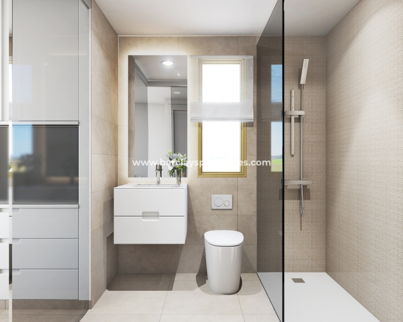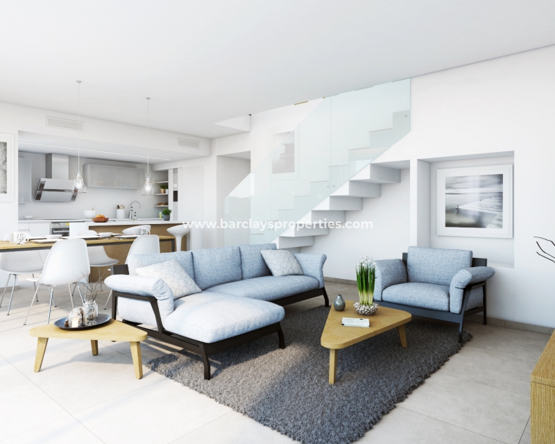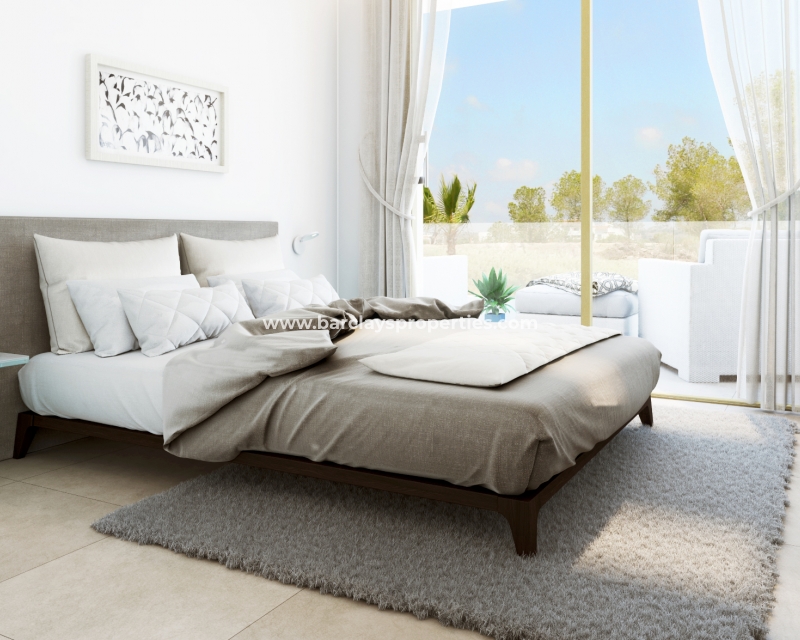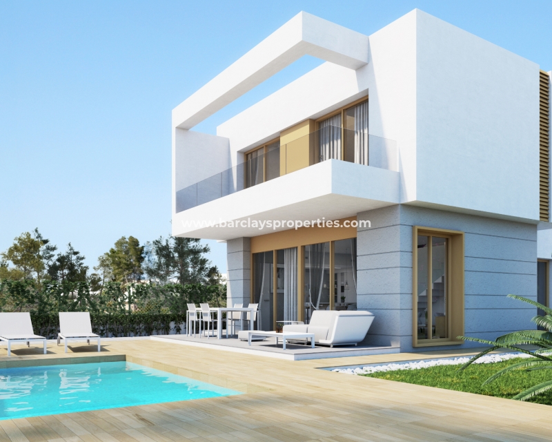 Villas de nueva construcción con tres dormitorios y tres baños construidas en dos plantas cerca de los servicios, la playa y el campo de golf de Vistabella, cerca de Torrevieja, en la Costa Blanca.