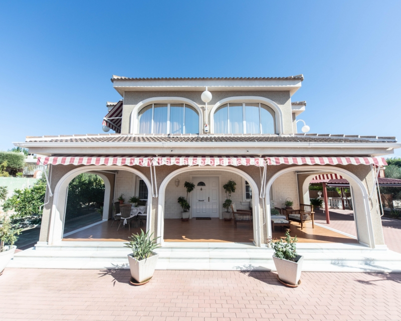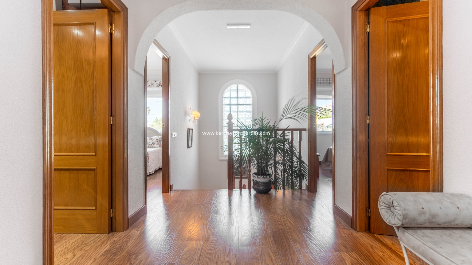Las escaleras de mármol con barandillas de madera y una gran ventana conducen a la primera planta y a un gran pasillo que conduce a todas las habitaciones restantes, que consisten en un dormitorio doble con ojos de Buey en el techo y armarios empotrados, un dormitorio doble con acceso a una terraza interior a la que también se puede acceder por otro dormitorio doble con aire acondicionado y un vestidor, un baño familiar con doble lavabo, ducha de esquina y un gran espejo. Directamente al otro lado del pasillo hay otro gran baño. El quinto dormitorio se encuentra en la primera planta con armarios empotrados.