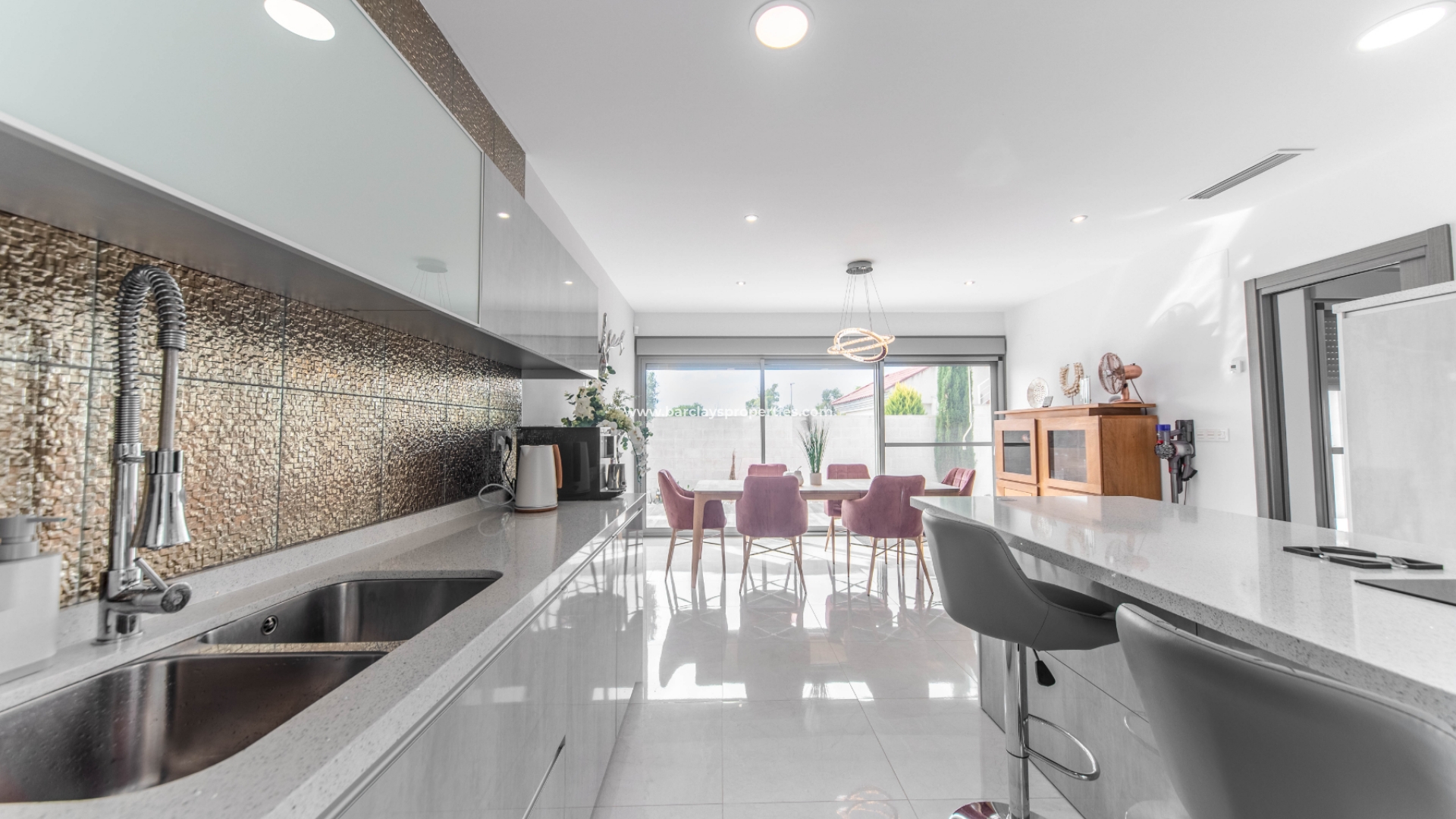 El jardín es inmaculado como es el interior de la propiedad. Entramos a través de la puerta de seguridad delantera para encontrar un pasillo de recepción con una amplia puerta corredera que conduce a la amplia y luminosa sala de estar con focos, ventilador de techo y puertas de patio que permiten que la luz natural fluya en la propiedad. Una puerta conduce al comedor y a la gran cocina moderna que está totalmente equipada con doble superficie de trabajo de granito, con dos hornos, una isla central y electrodomésticos de alta calidad.